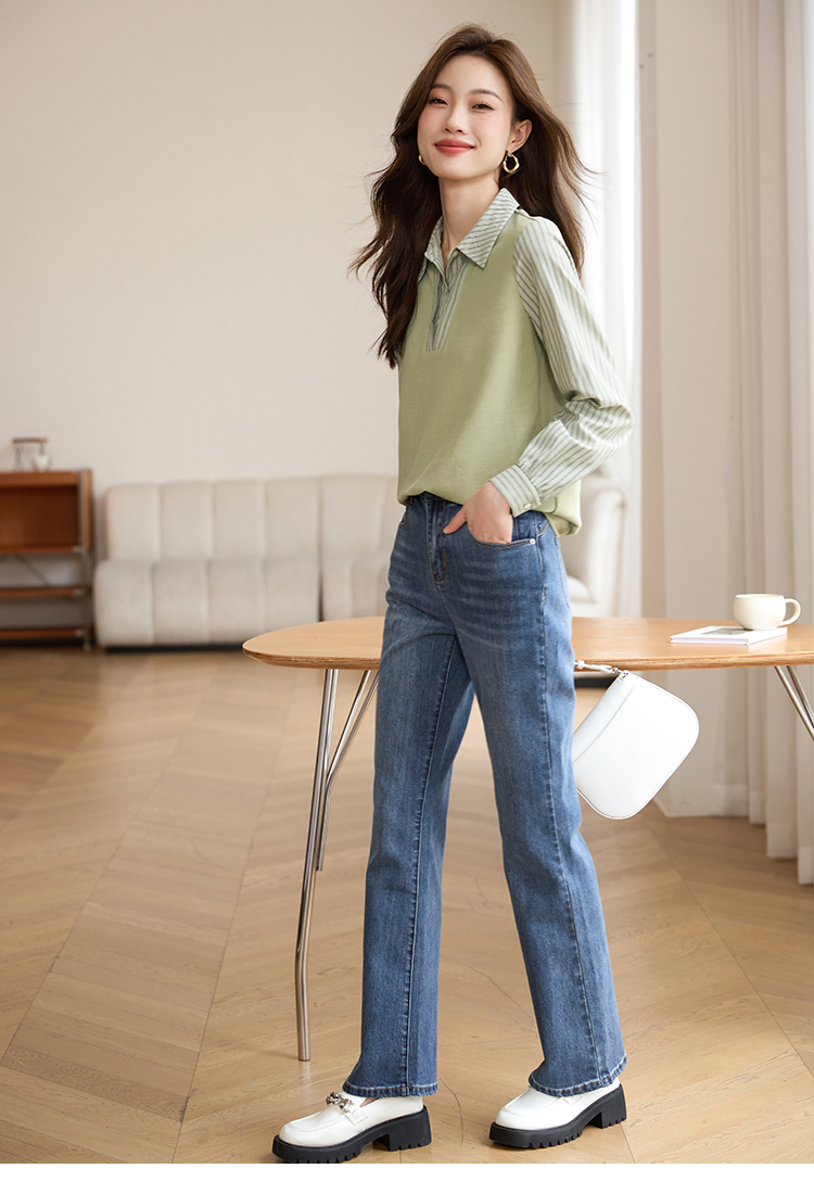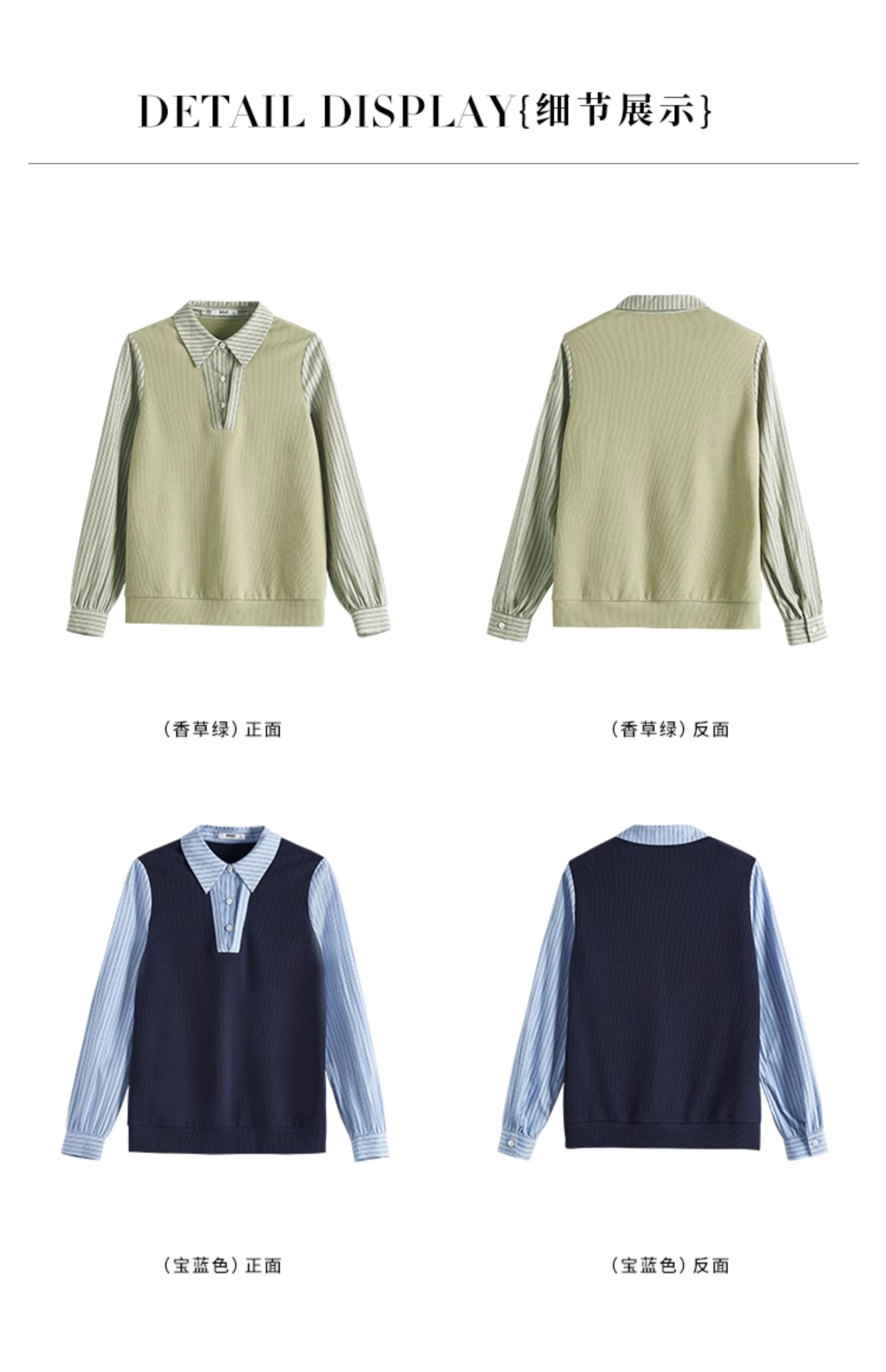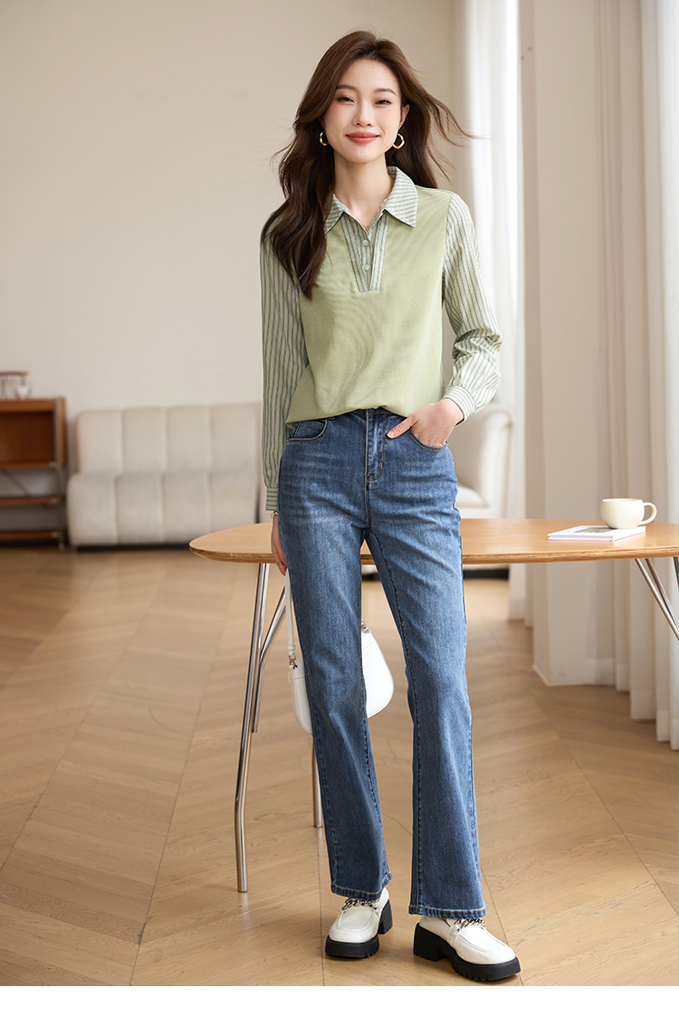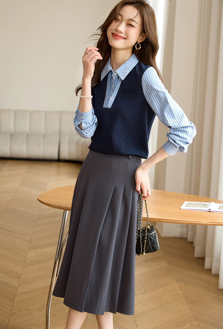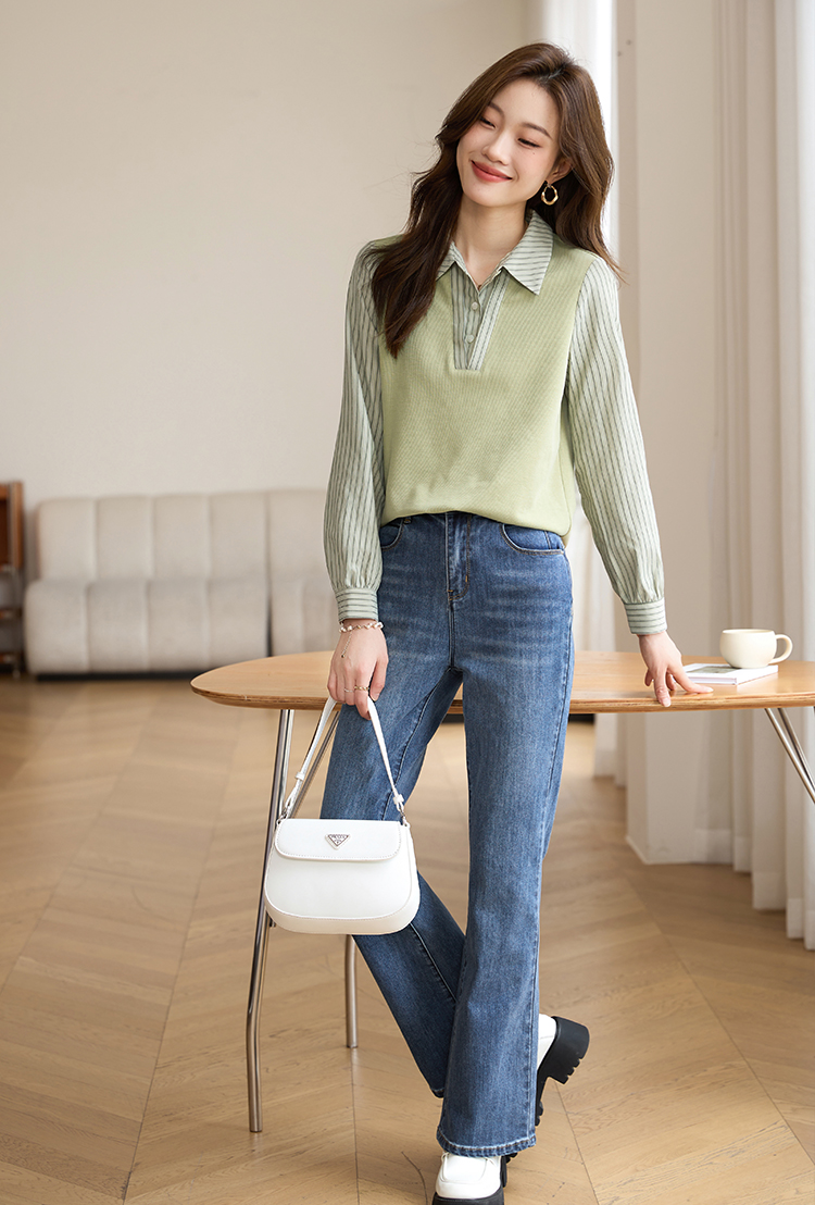 【专属特价】熙世界假两件撞色条纹长袖衬衫拼接针织上衣女士衬衣2025早秋款