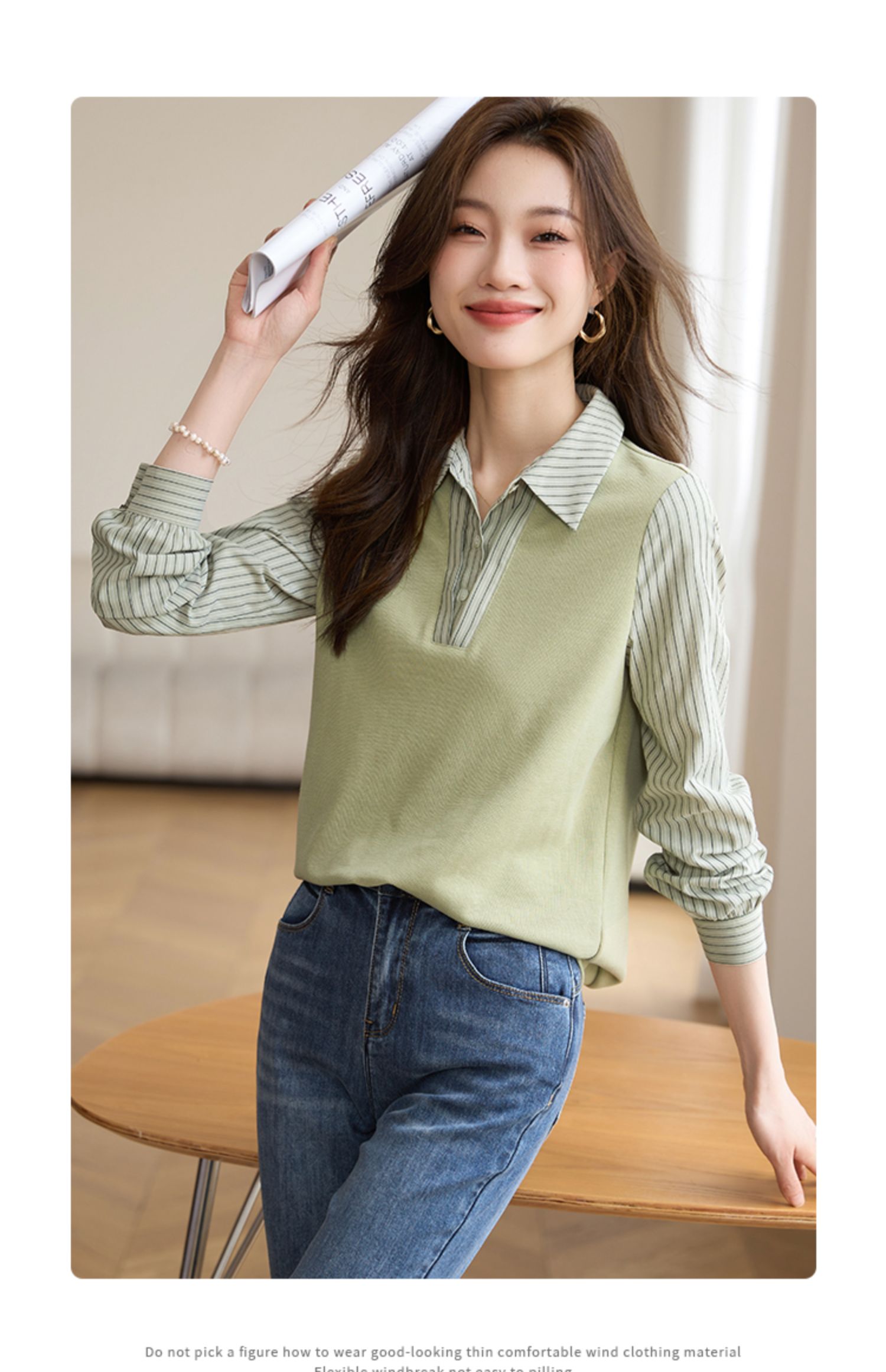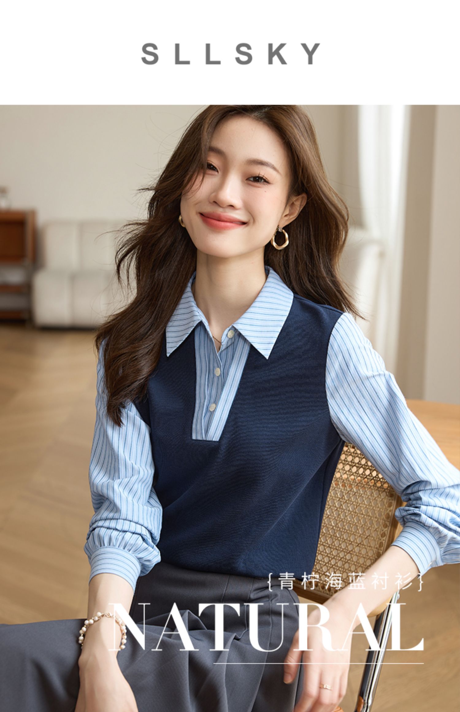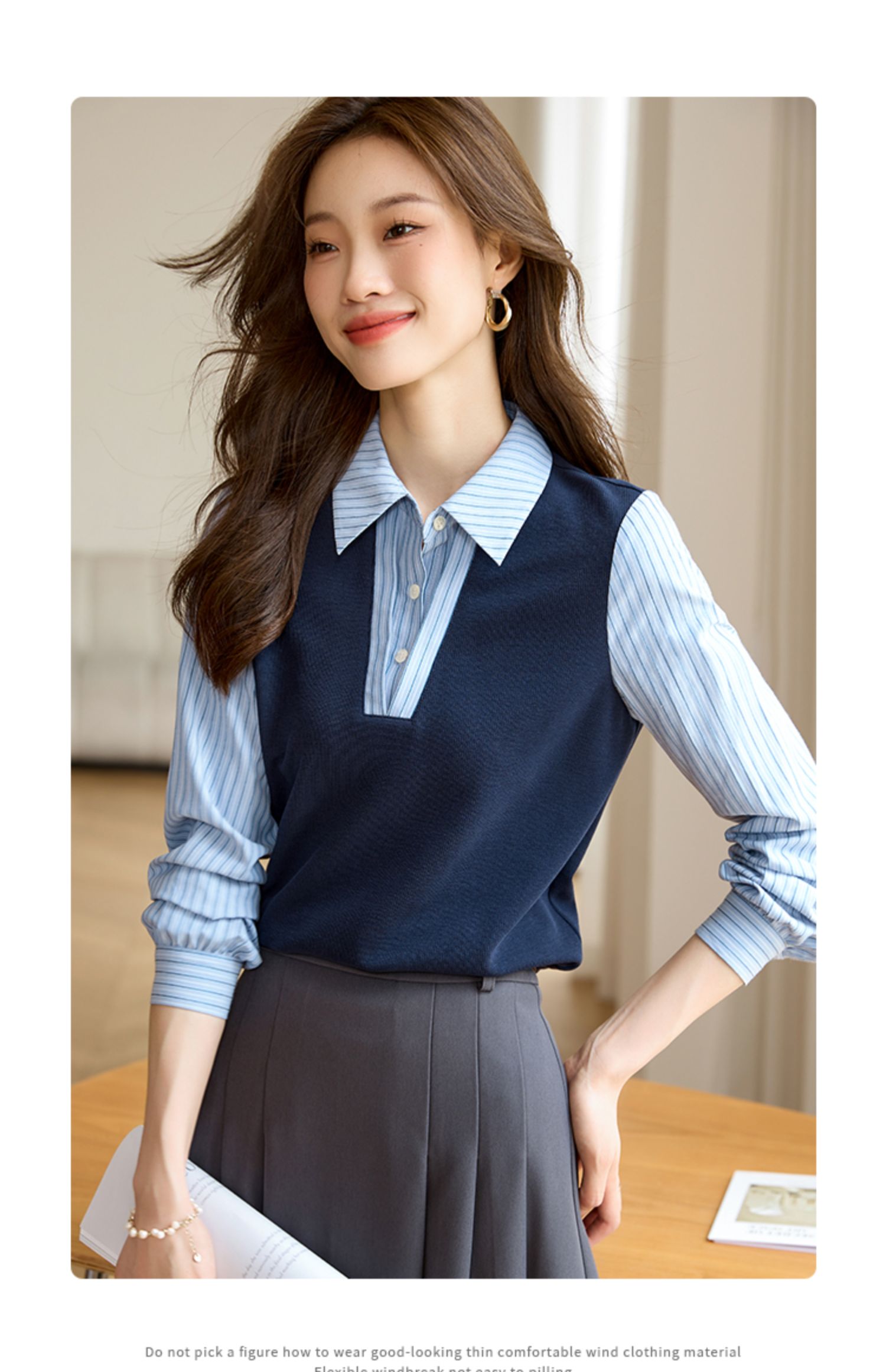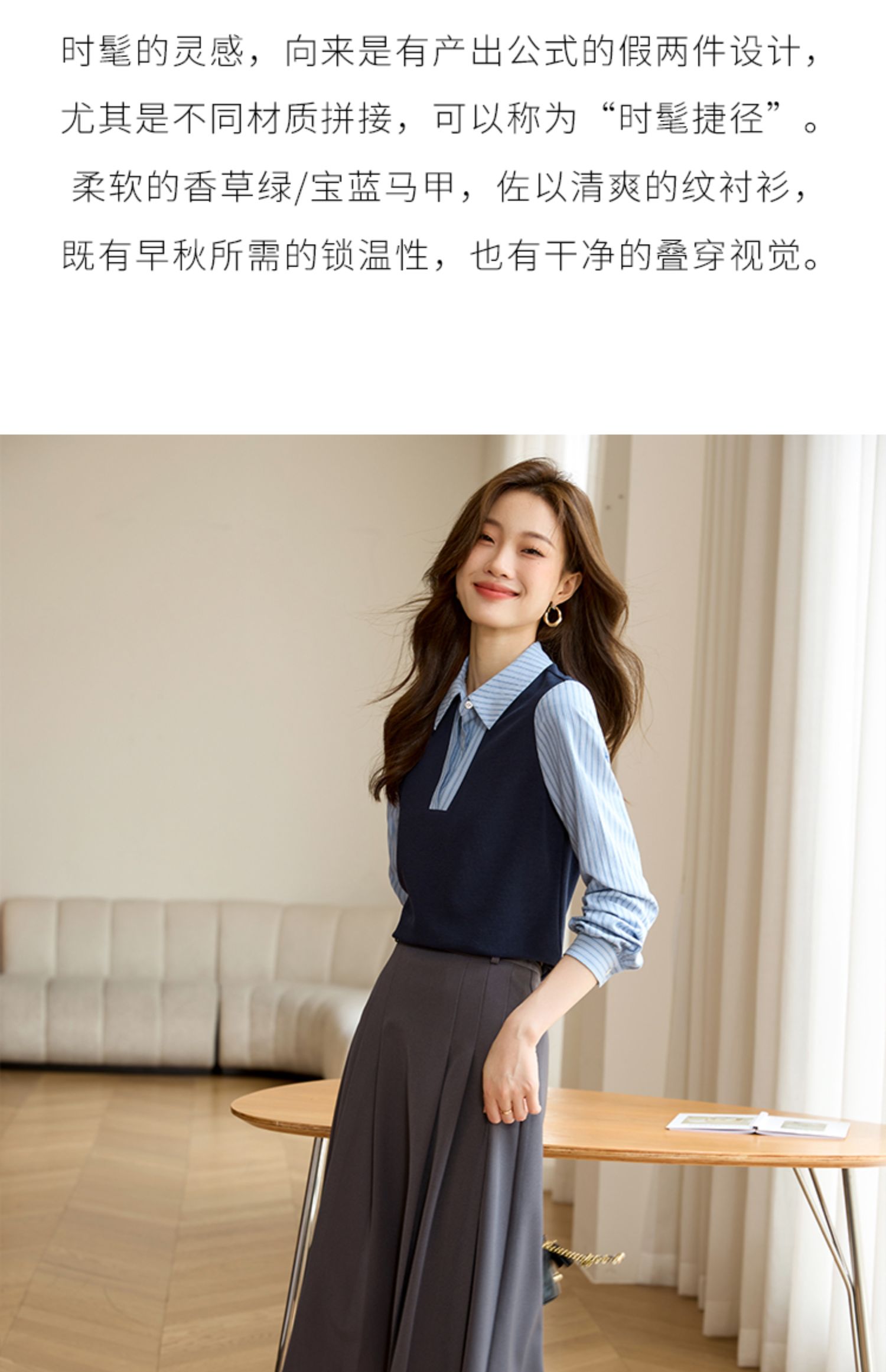 【专属特价】熙世界假两件撞色条纹长袖衬衫拼接针织上衣女士衬衣2025早秋款