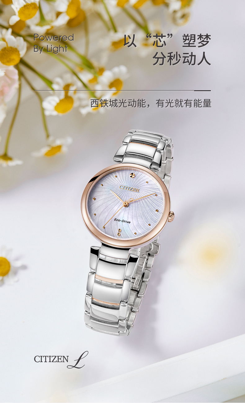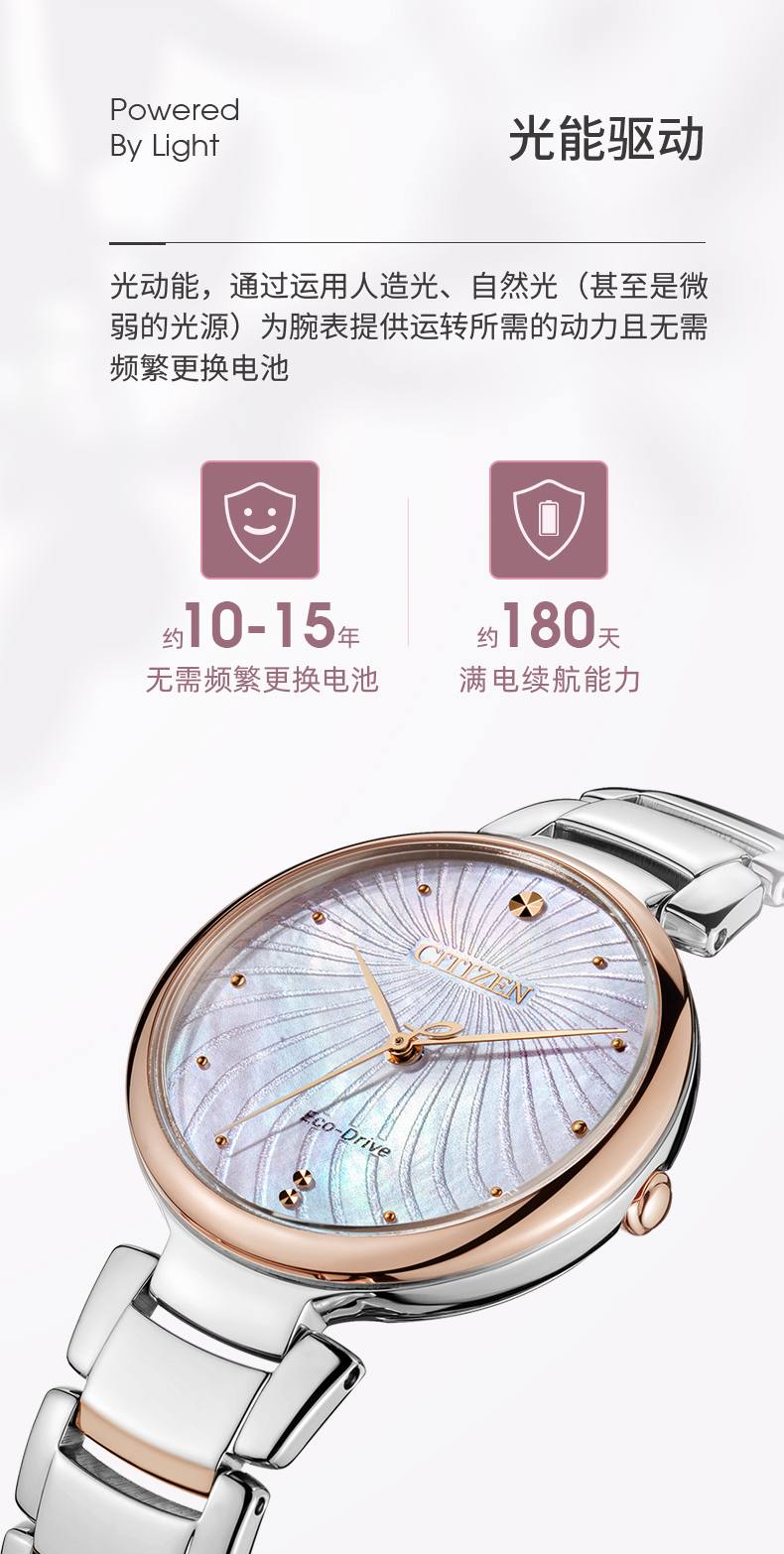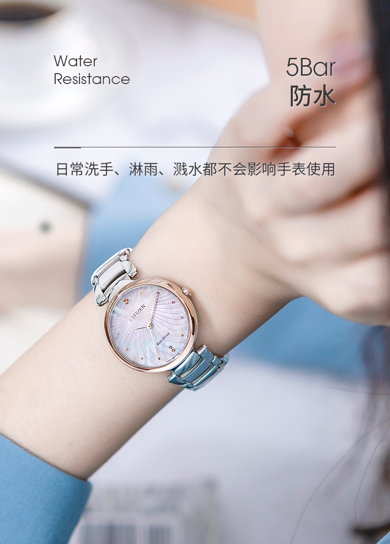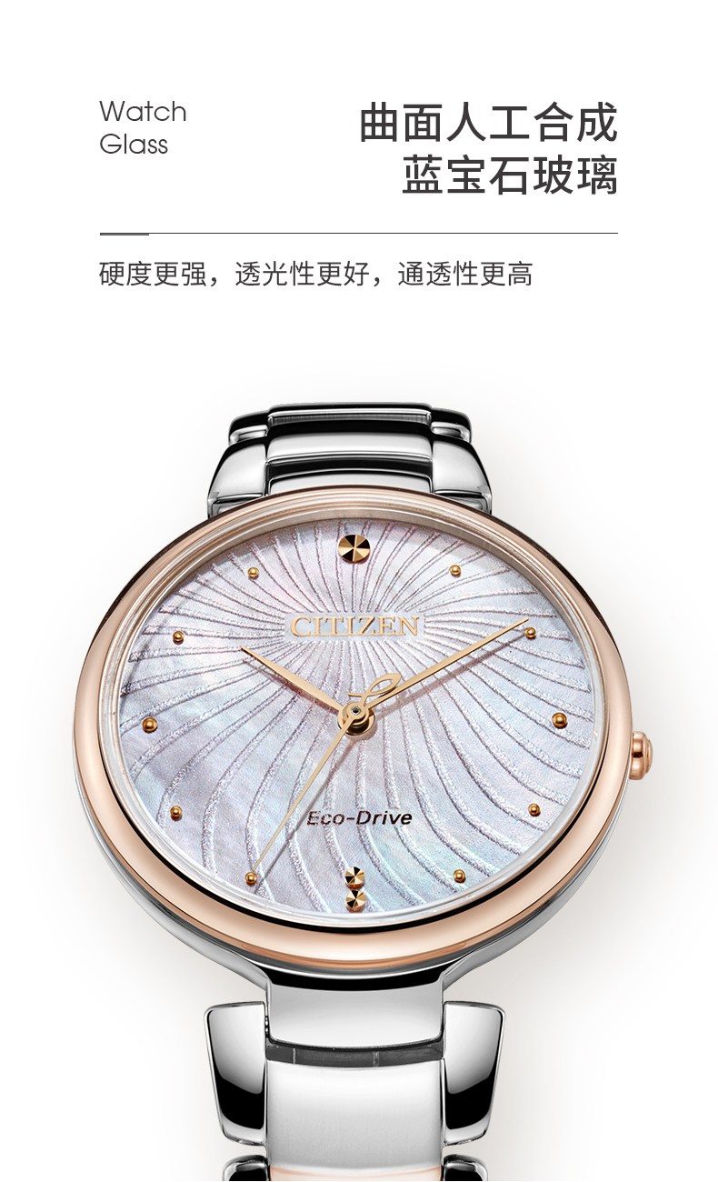 西铁城日本官方正品时尚贝母盘玫瑰金色钢带光动能女表EM0854-89Y