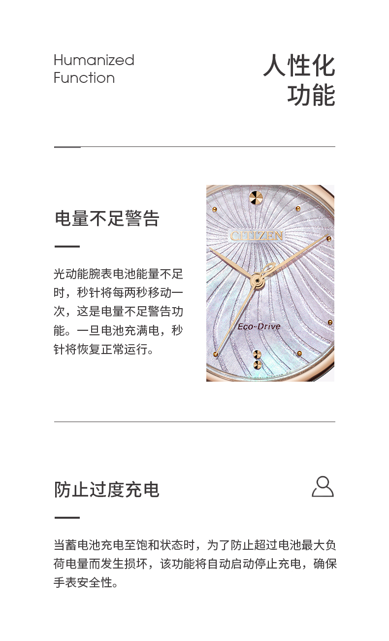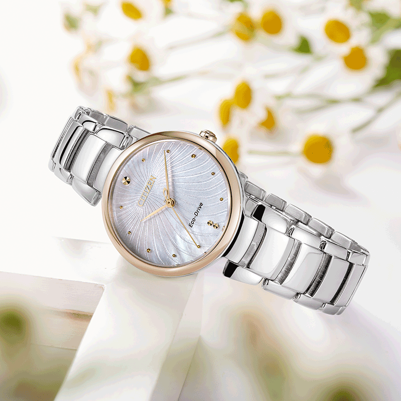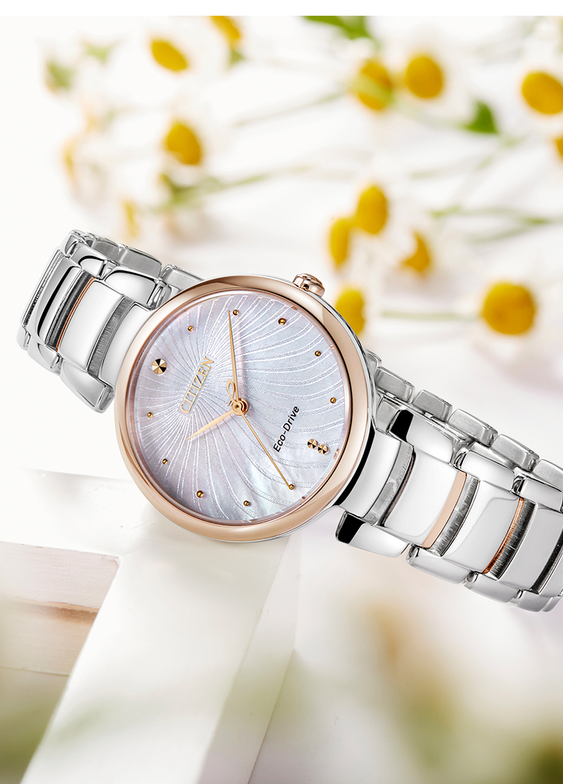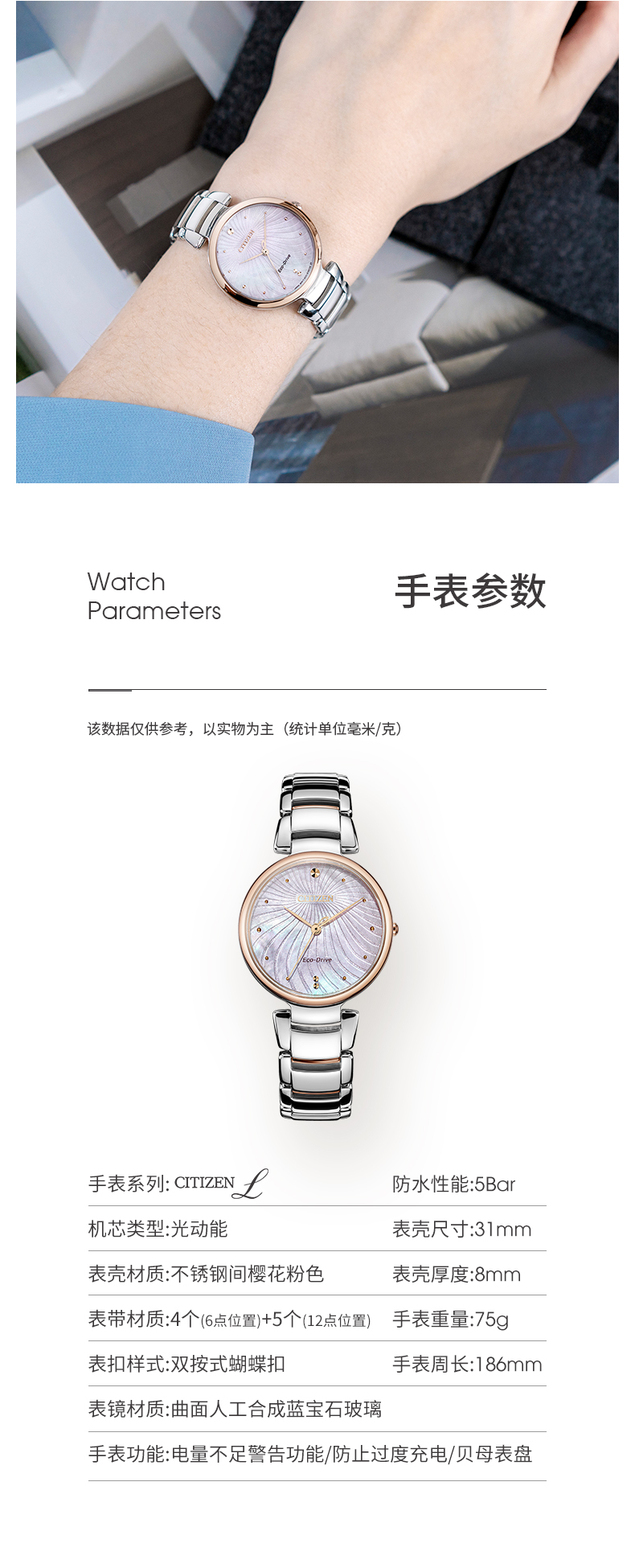西铁城日本官方正品时尚贝母盘玫瑰金色钢带光动能女表EM0854-89Y