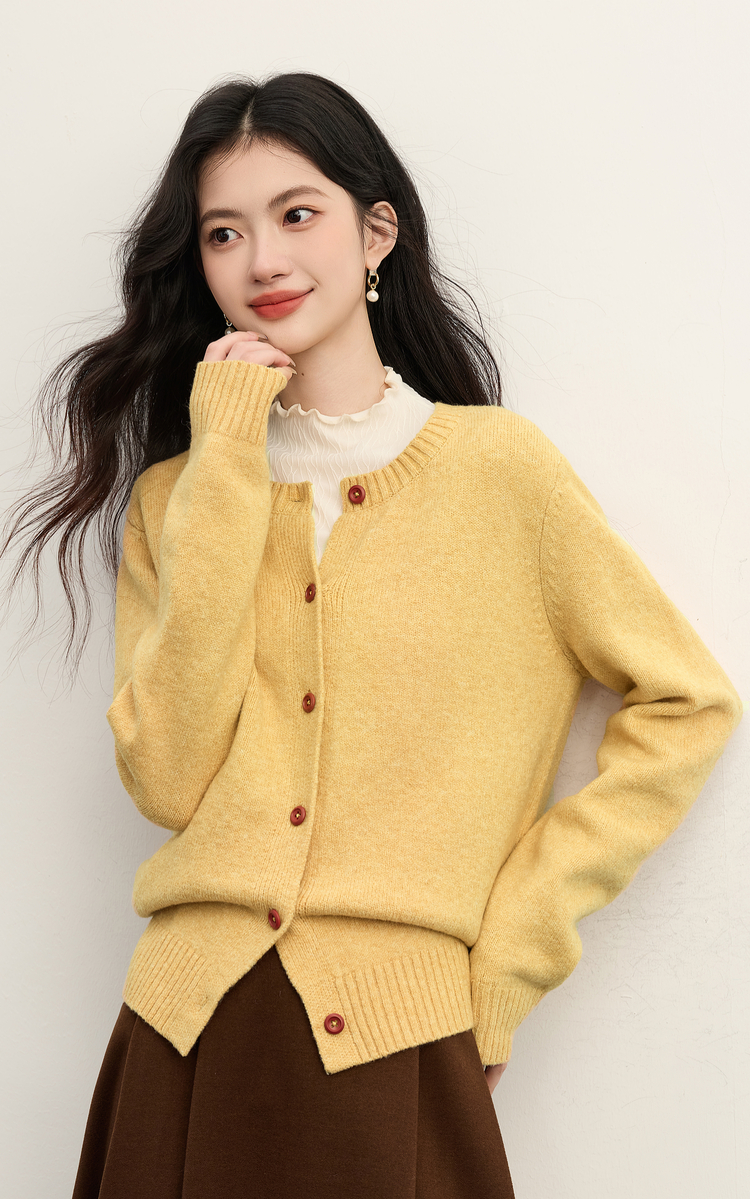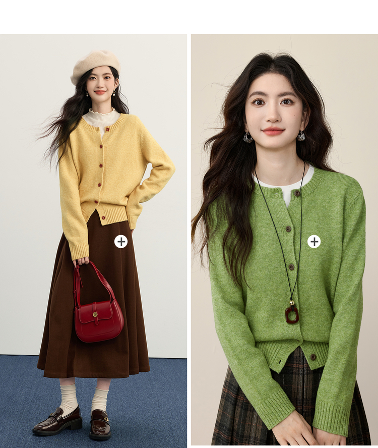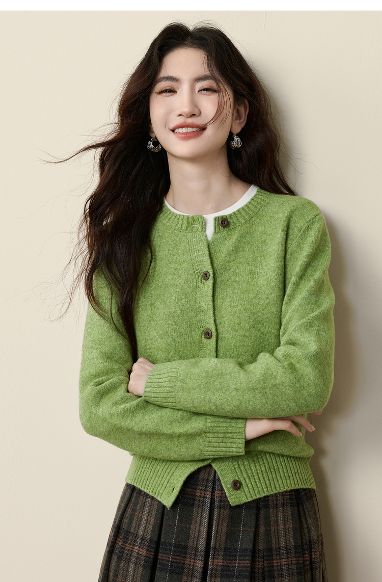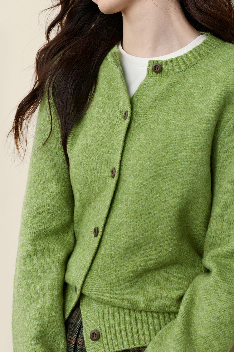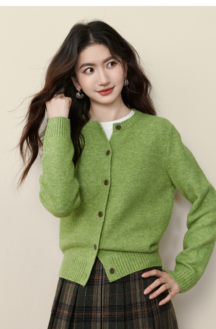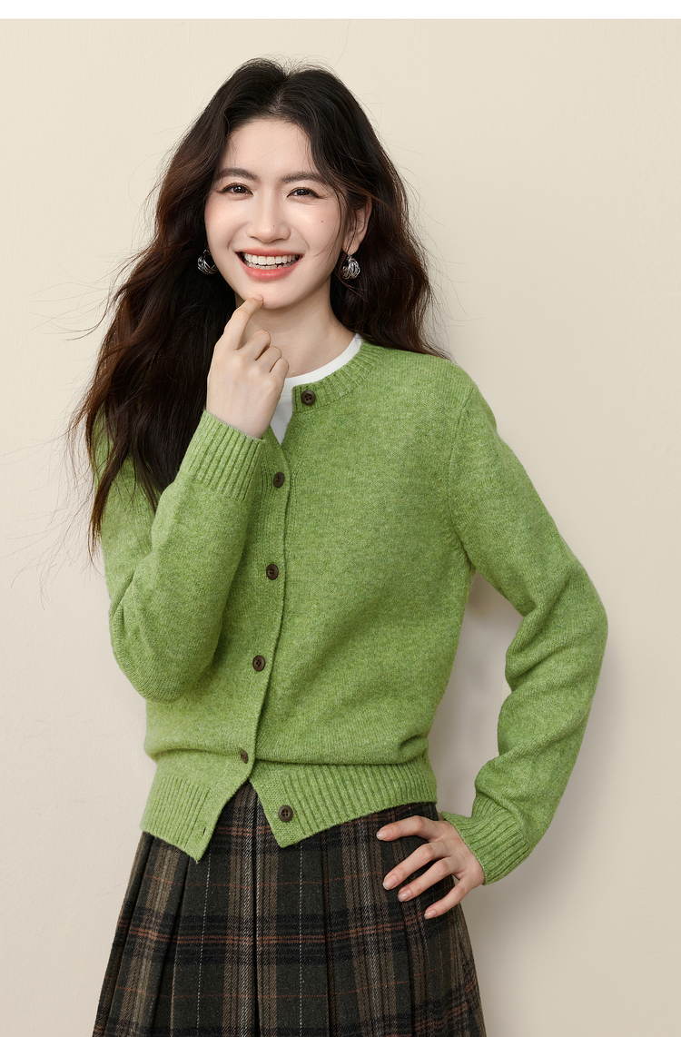 【年货节】熙世界松软慵懒绿色毛衣开衫女秋冬2025新款圆领打底针织衫短外套