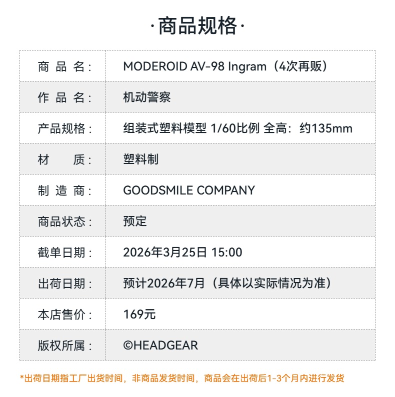 【GSC预售定金】MODEROID AV-98 Ingram 机动警察 手办模玩