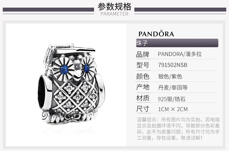 PANDORA/潘多拉 女士银色猫头鹰串饰 791502NSB