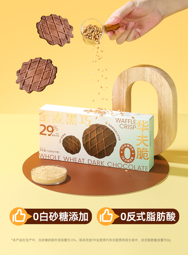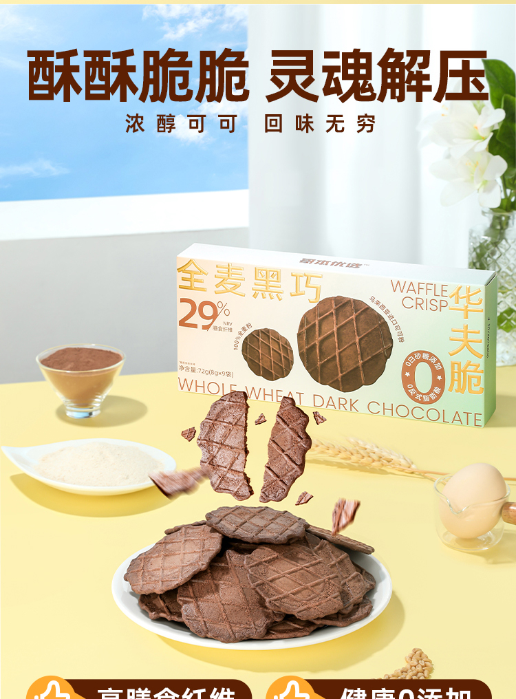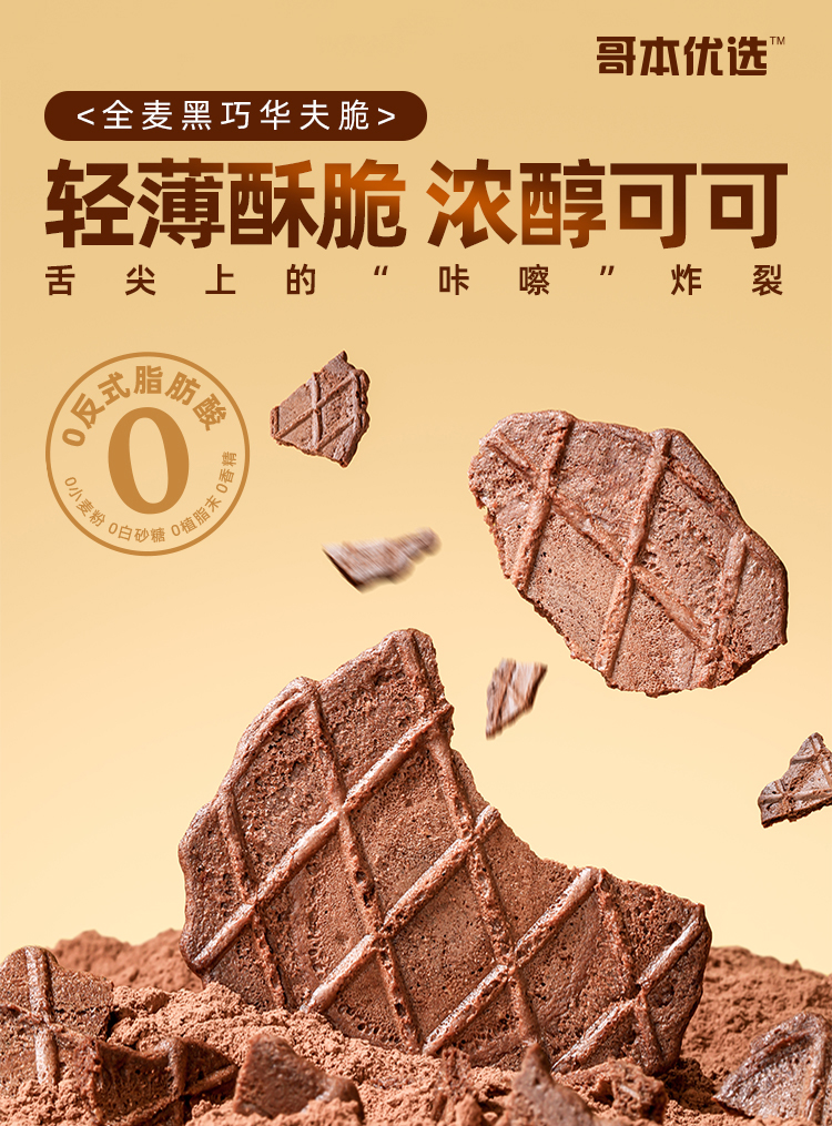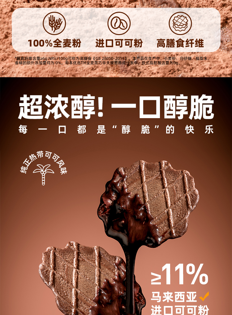 哥本全麦黑巧华夫脆 轻薄酥脆 可可浓醇 马来西亚进口可可粉 0小麦粉添加 0白砂糖添加