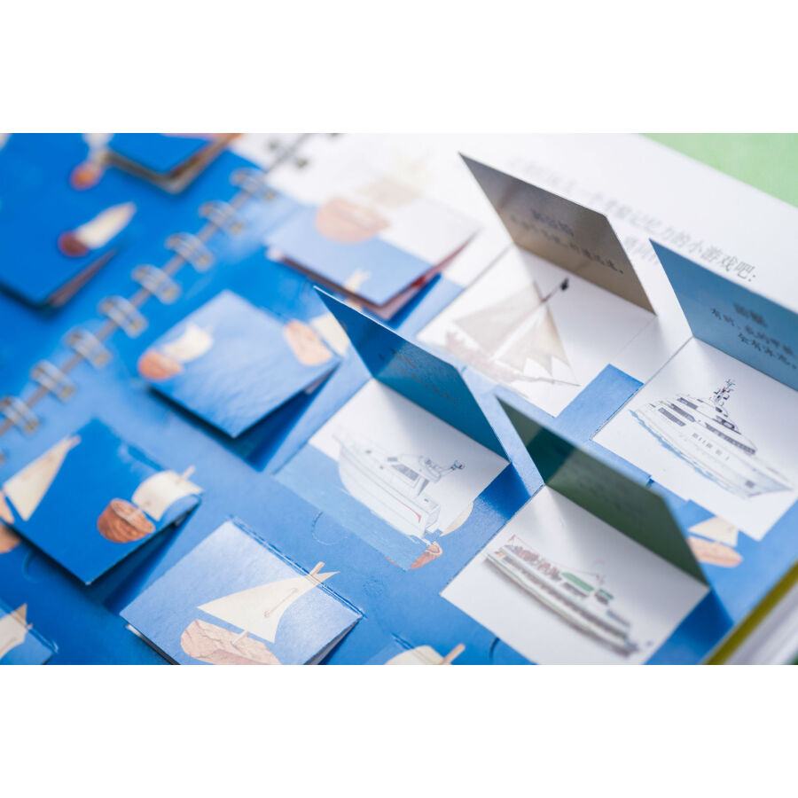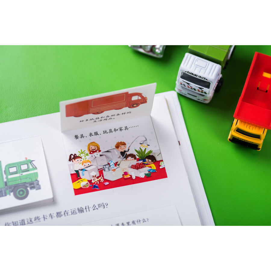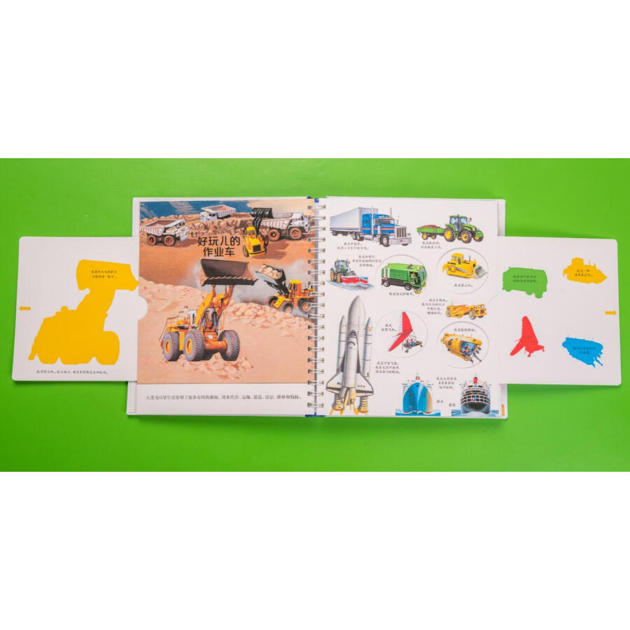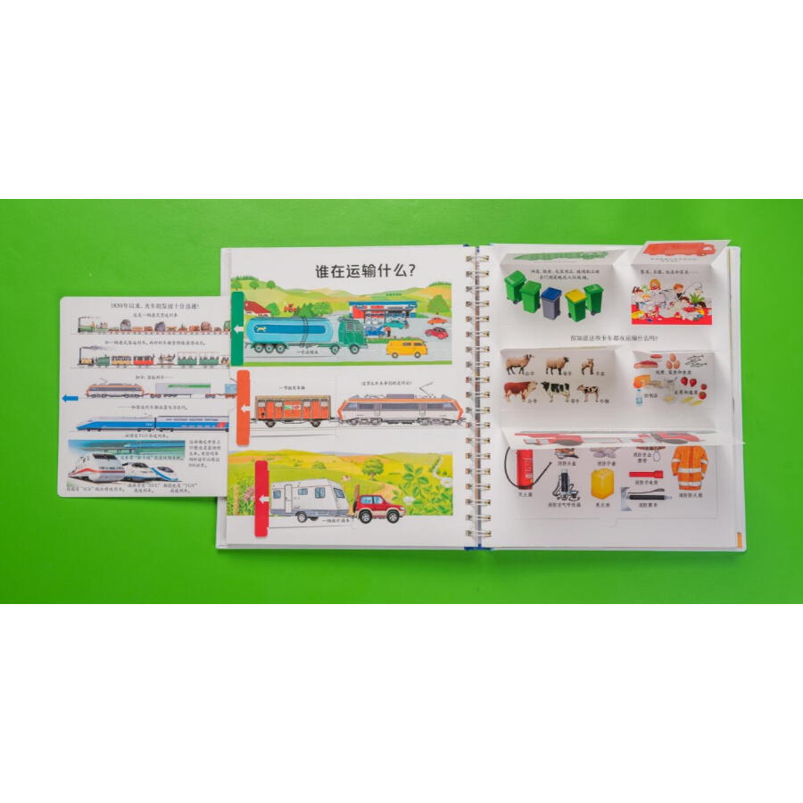 书中通过拨盘页讲述了不同类别动物的卵生和胎生、植物的生长过程,帮助孩子建立归类和事物发展的概念。翻页、洞洞、透明胶片的遮挡引导读者通过形状、颜色、局部的皮毛或鳞片、羽毛判断动物,巧妙展现了动物与环境的结合、事物间的对比、车的外观和装载物、果实的内部结构等内容,设置悬念、引发孩子思考的同时让知识的呈现一目了然、简单明了、条理清晰、便于理解。推拉页和插卡将更多知识藏在书中,与页面中的内容相互关联,或是有益扩充、延展,或是深入的讲解,让知识系统、立体,富有层次,让孩子的每一次推拉都带着思考、充满惊喜或成功的喜悦。超长拉页的设计展现大的场景、系统化知识,让画面**具视觉冲击力。