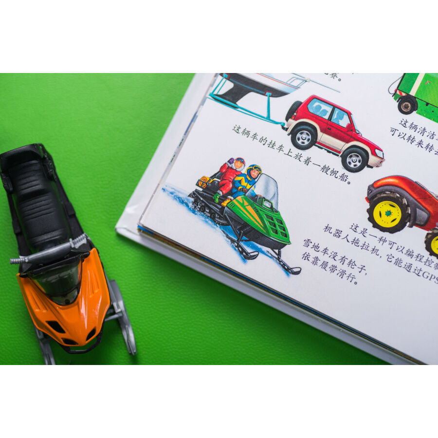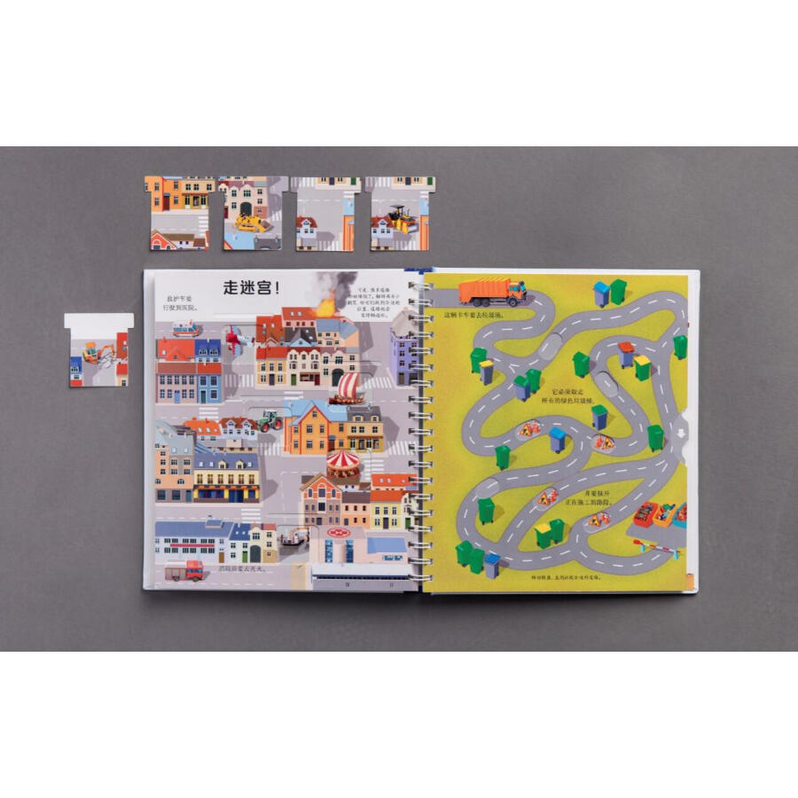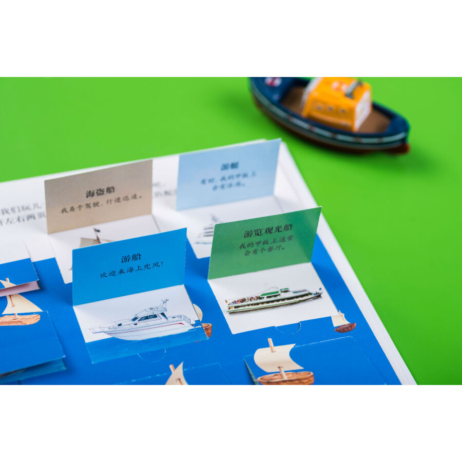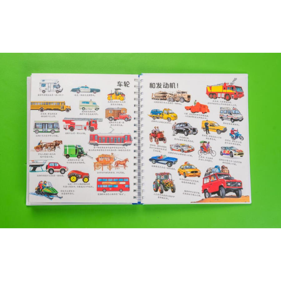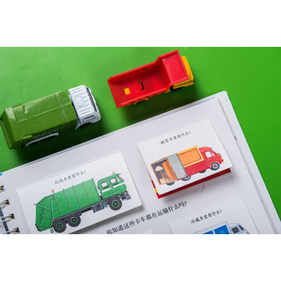 书中通过拨盘页讲述了不同类别动物的卵生和胎生、植物的生长过程,帮助孩子建立归类和事物发展的概念。翻页、洞洞、透明胶片的遮挡引导读者通过形状、颜色、局部的皮毛或鳞片、羽毛判断动物,巧妙展现了动物与环境的结合、事物间的对比、车的外观和装载物、果实的内部结构等内容,设置悬念、引发孩子思考的同时让知识的呈现一目了然、简单明了、条理清晰、便于理解。推拉页和插卡将更多知识藏在书中,与页面中的内容相互关联,或是有益扩充、延展,或是深入的讲解,让知识系统、立体,富有层次,让孩子的每一次推拉都带着思考、充满惊喜或成功的喜悦。超长拉页的设计展现大的场景、系统化知识,让画面**具视觉冲击力。