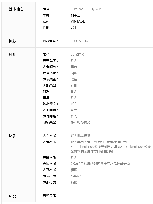 Bell & Ross 柏莱士 VINTAGE 系列 BRV192-BL-ST/SCA 腕表