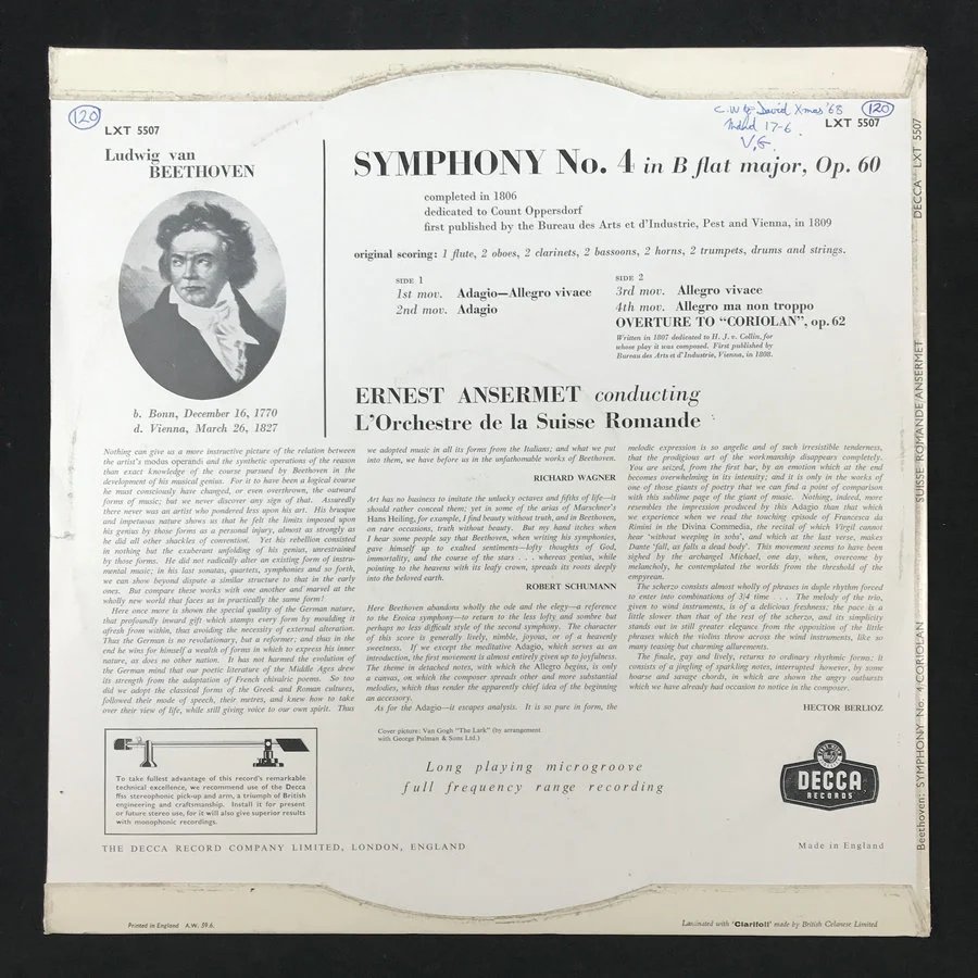LP黑胶唱片 贝多芬《第四交响曲》《科里奥兰序曲》 瑞士罗曼德管弦乐团 瑞士指挥家恩奈斯特·安塞美厂牌:Decca