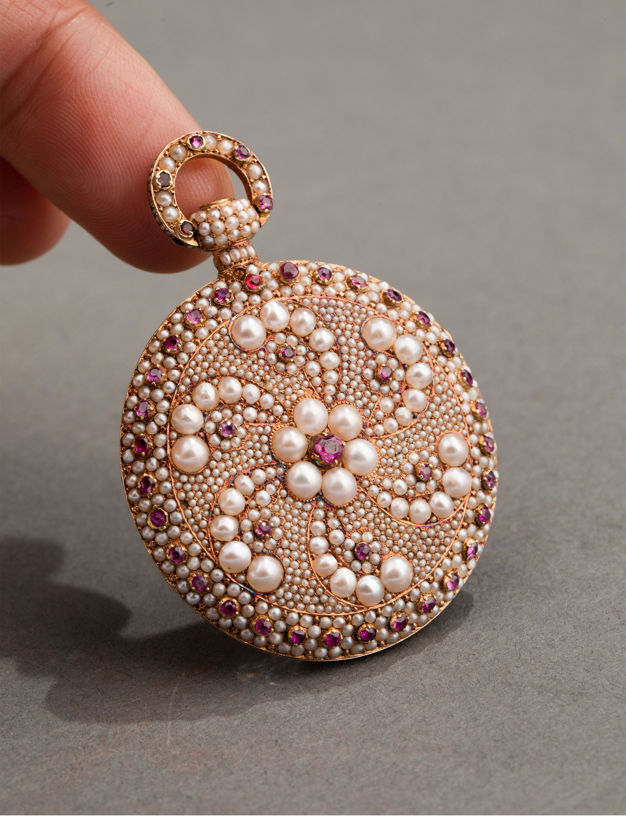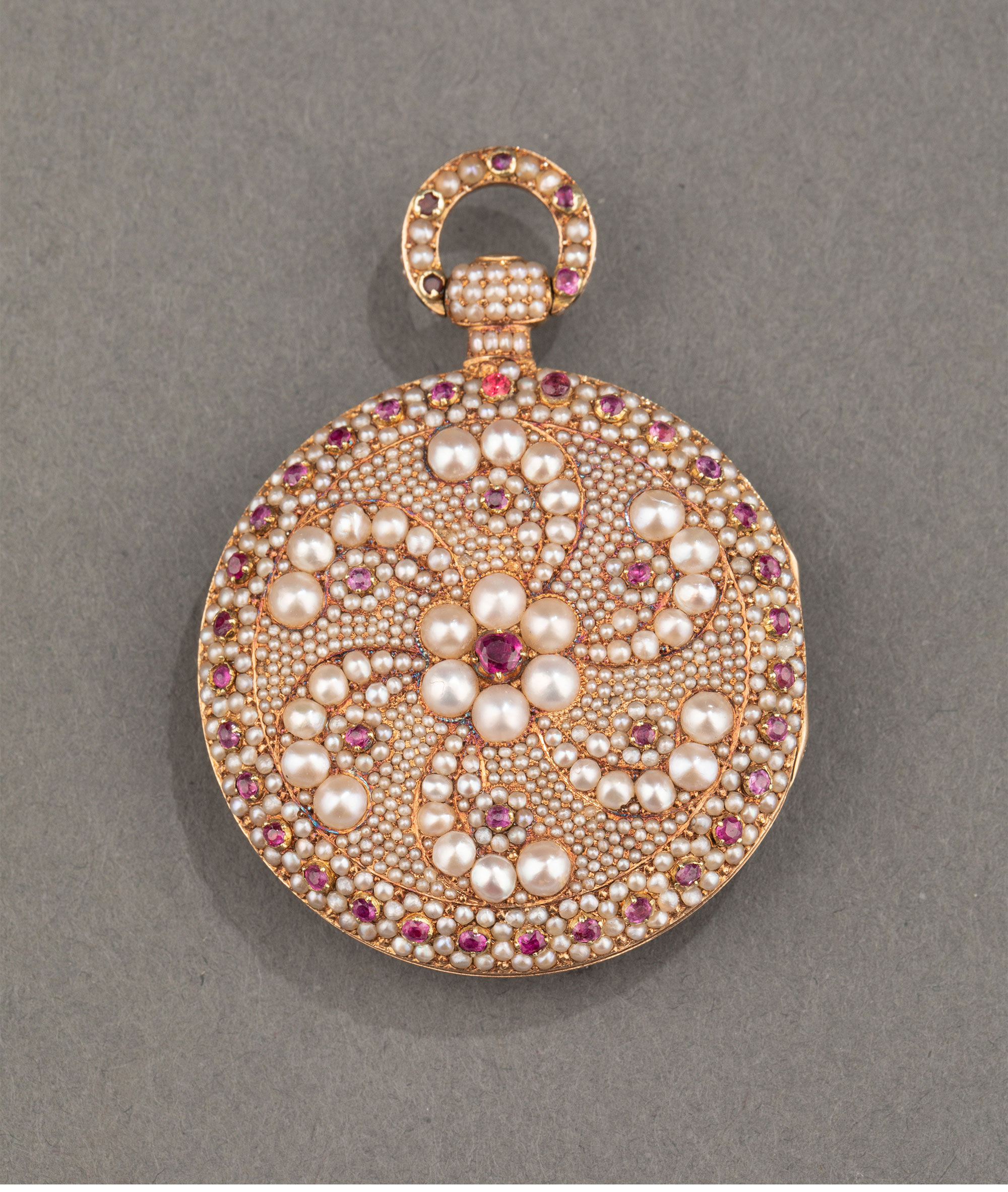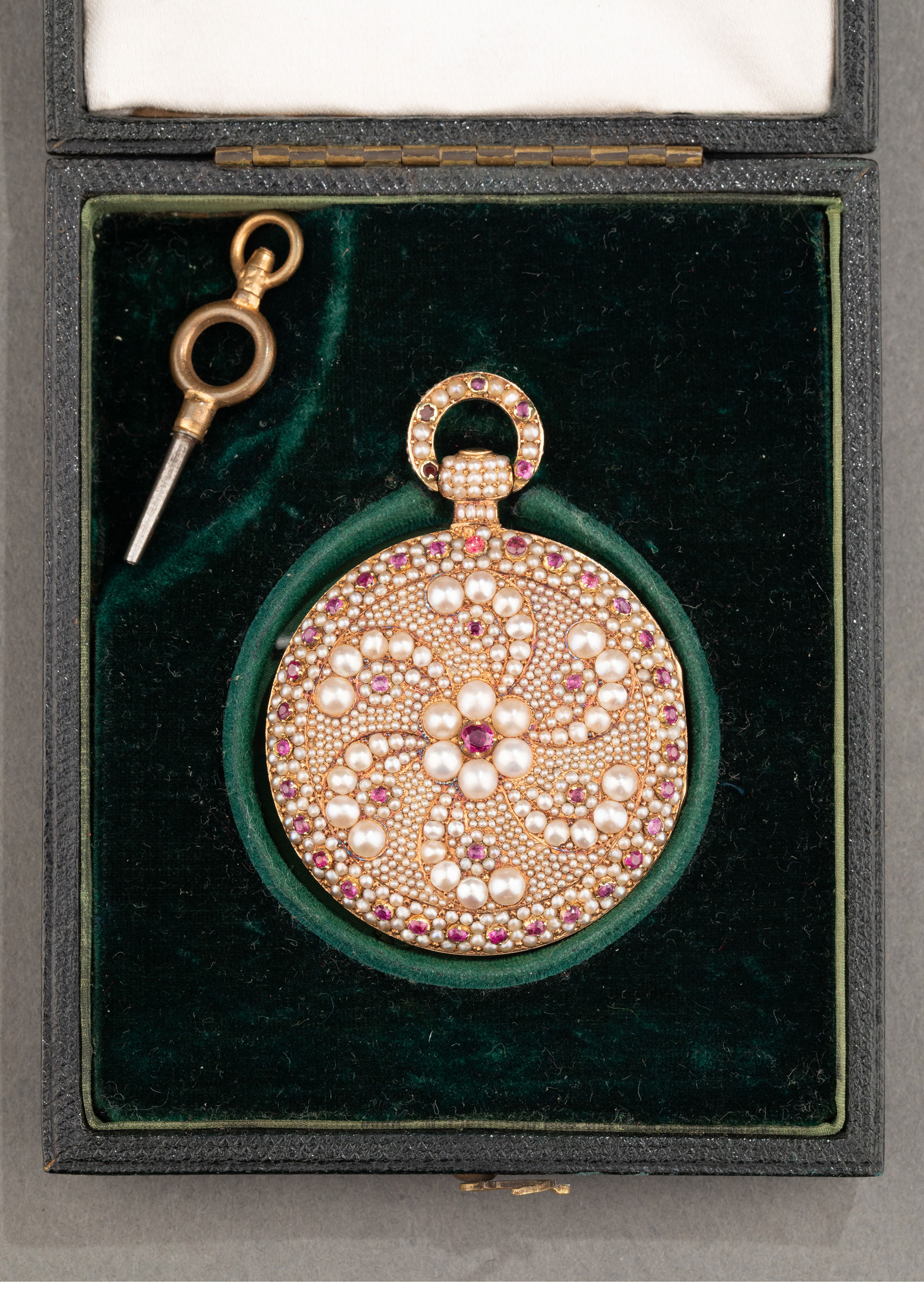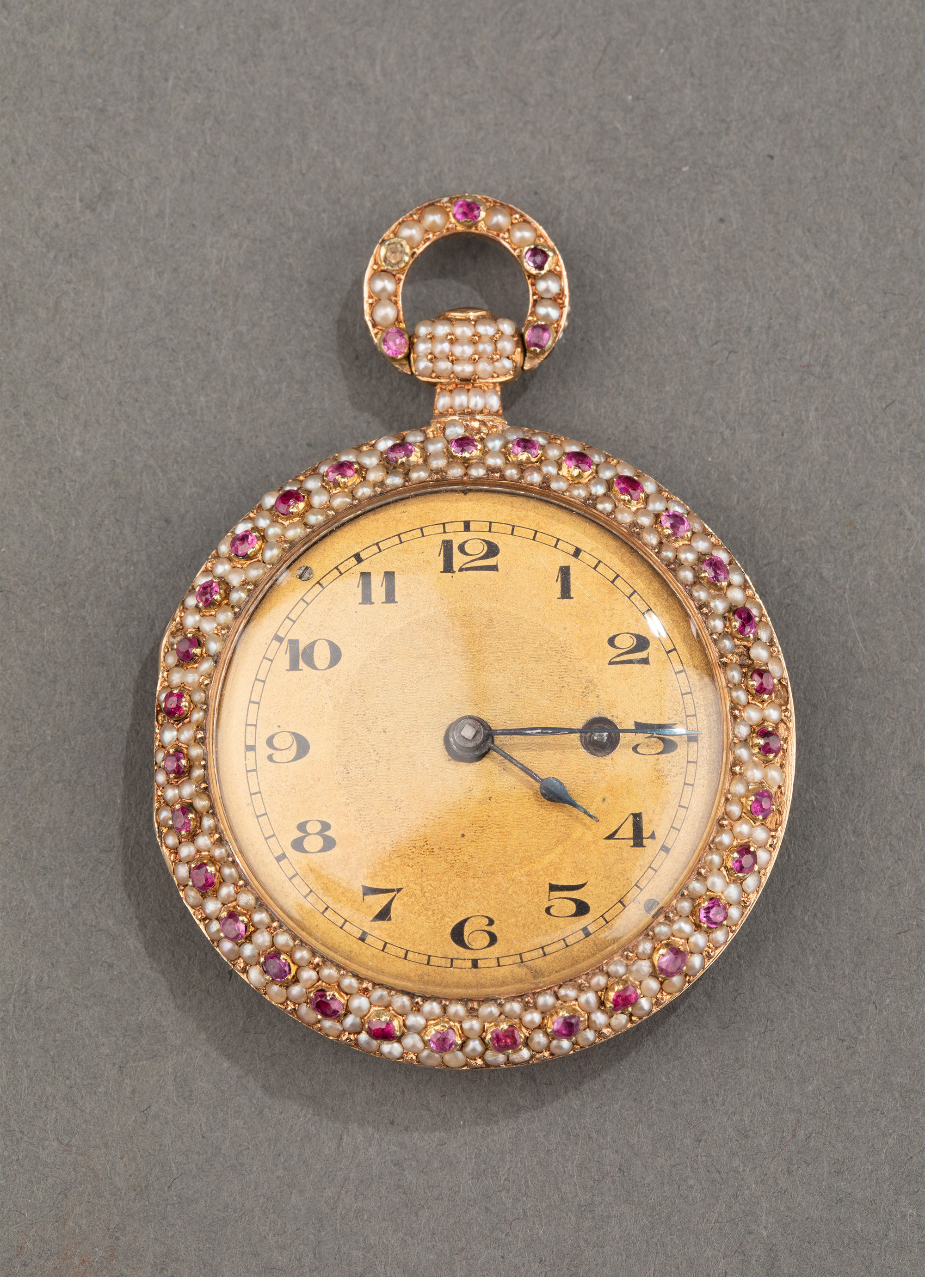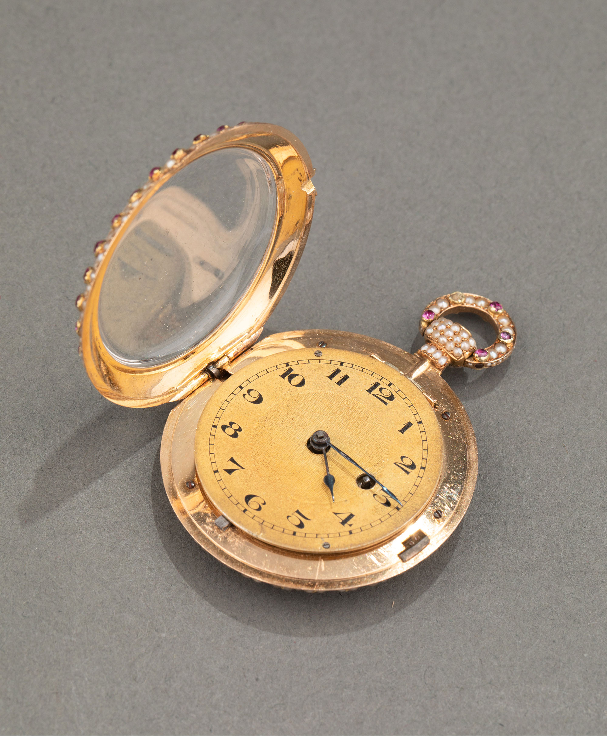 1840年代瑞士出品黄金镶嵌天然海水珍珠及红宝石古董珠宝怀表