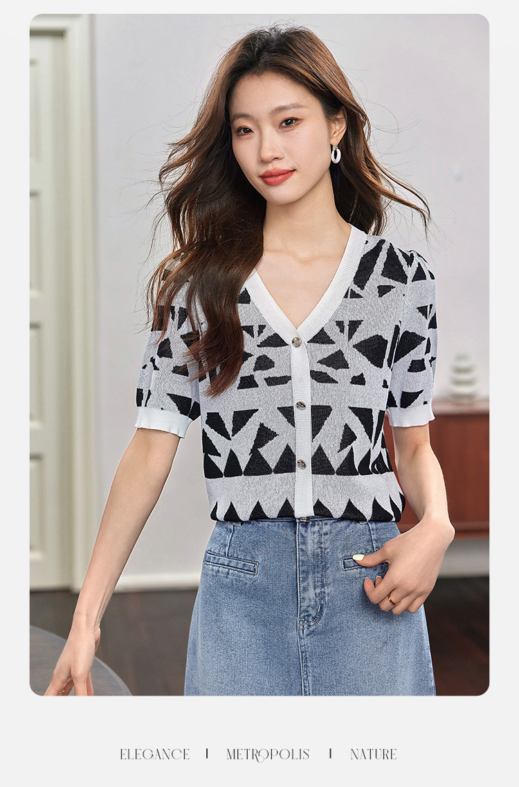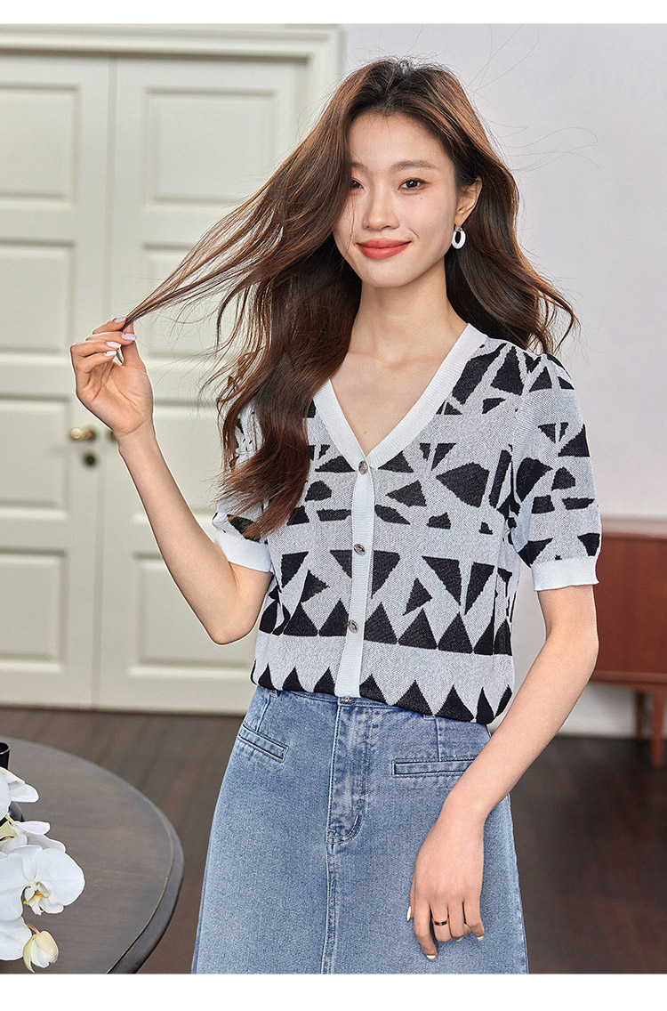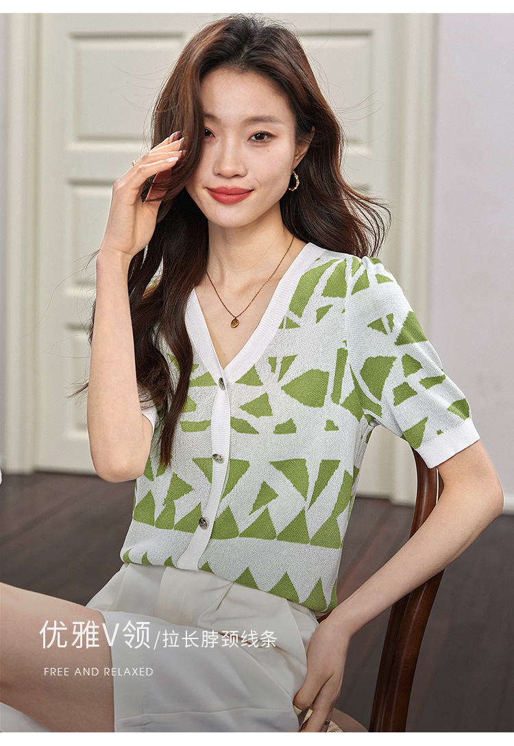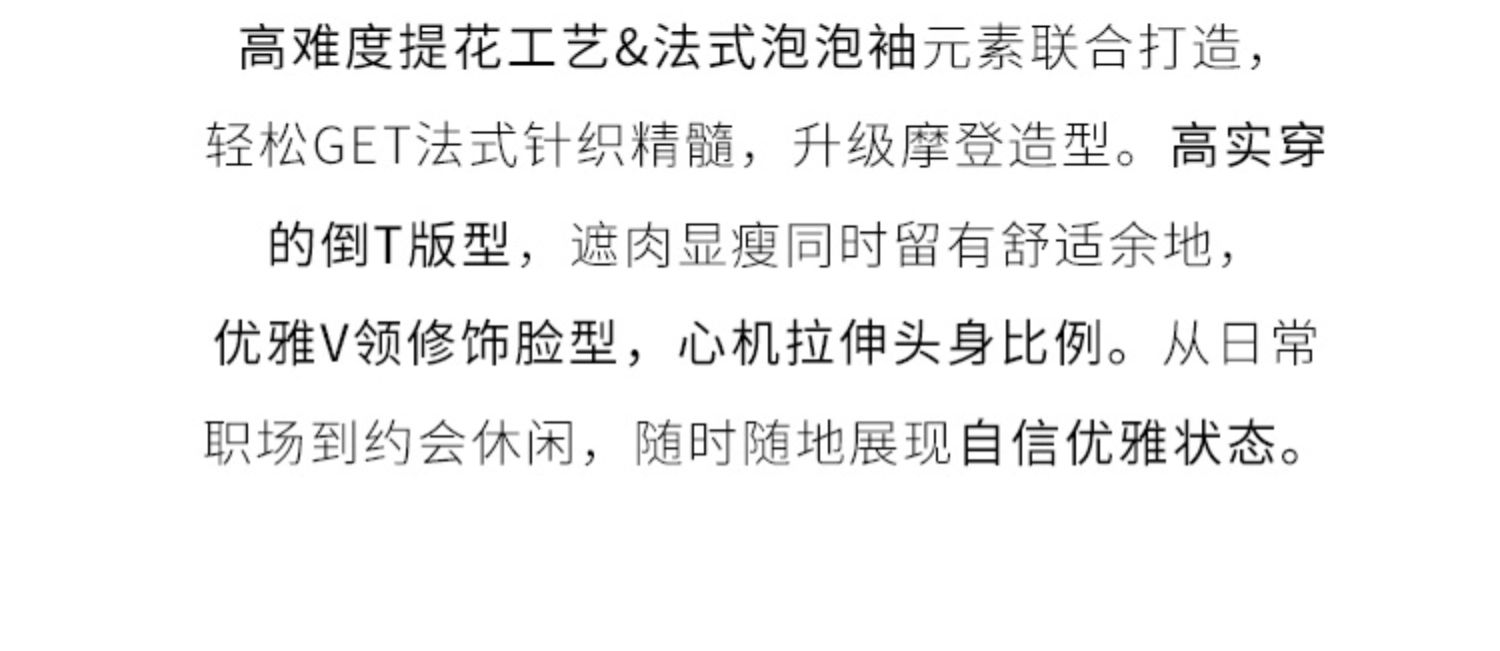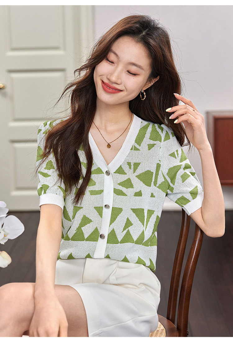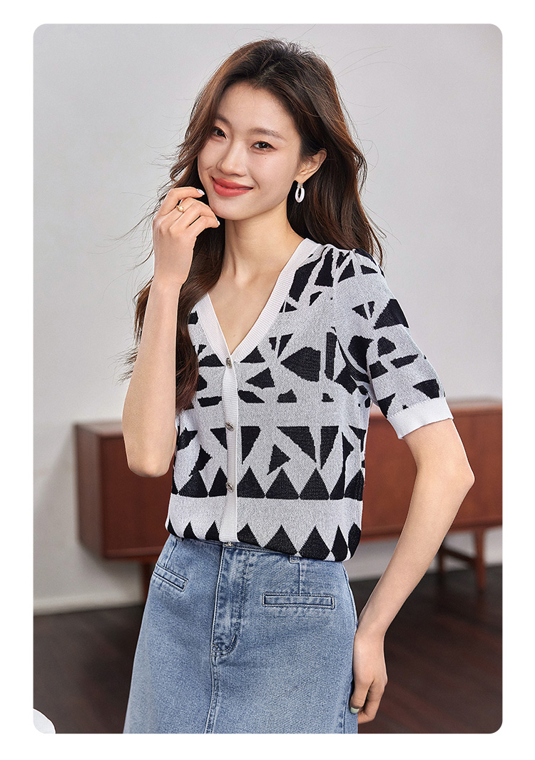 【专属特价】熙世界法式格纹提花针织衫女薄款夏季泡泡短袖V领上衣2025新款
