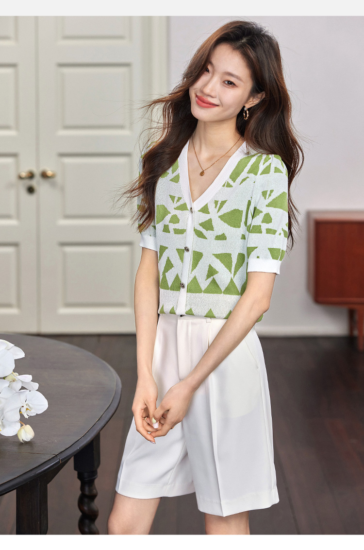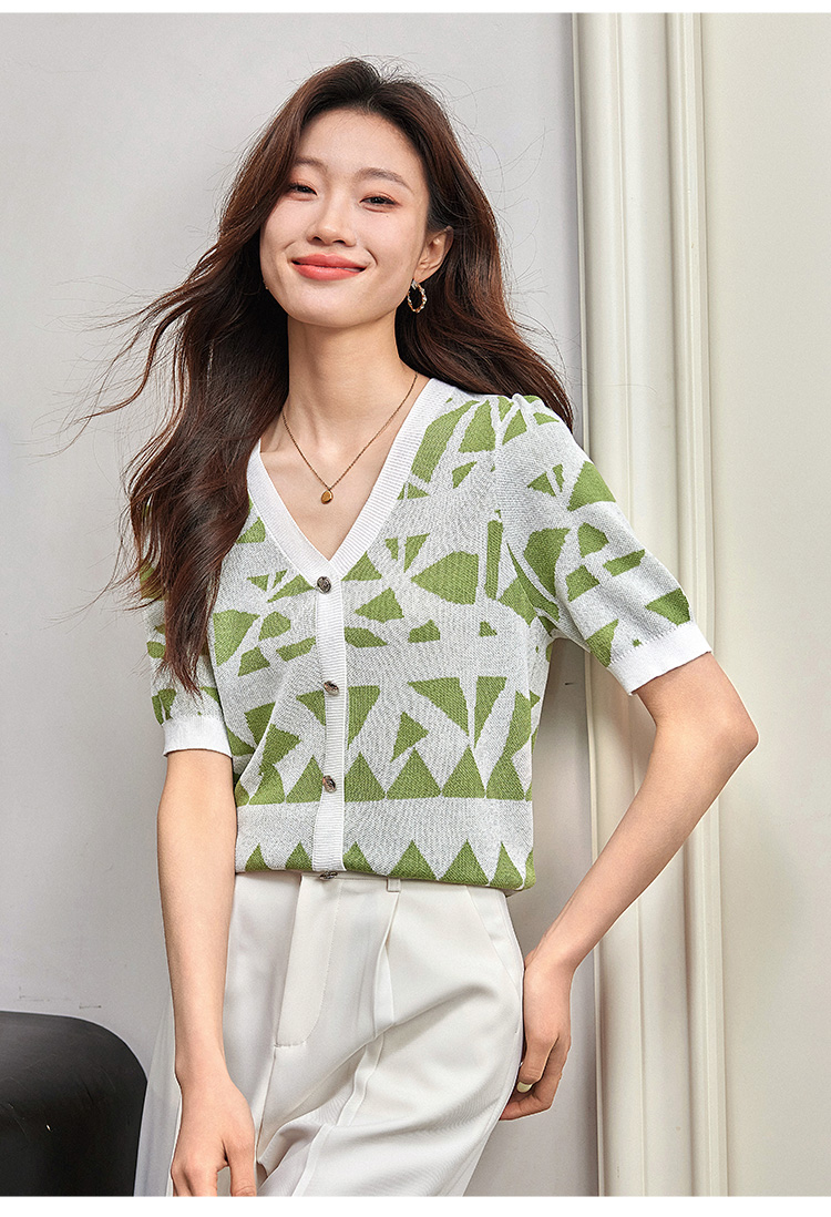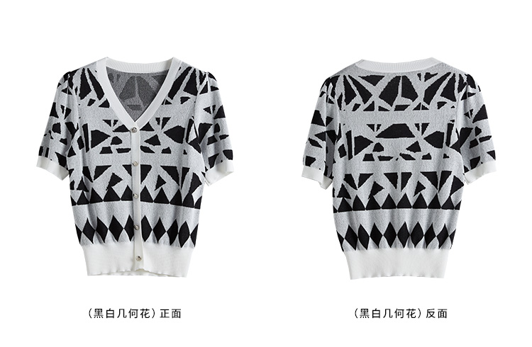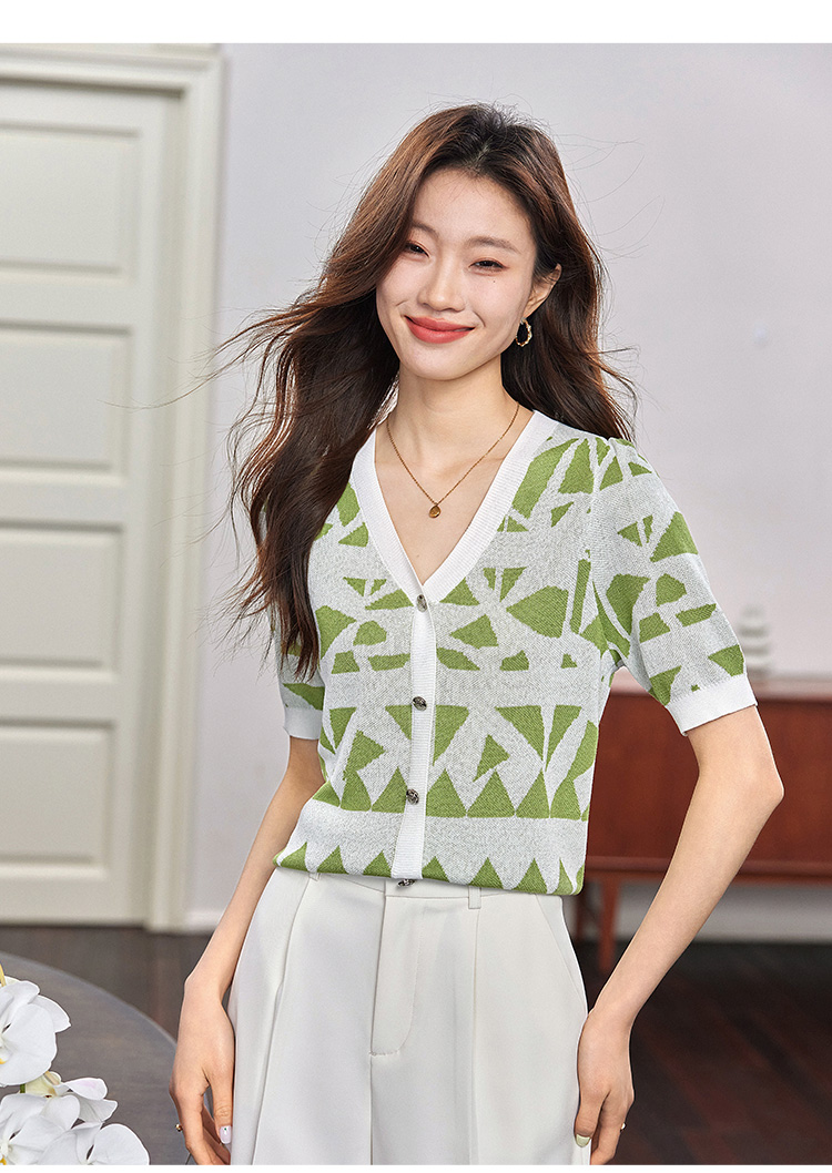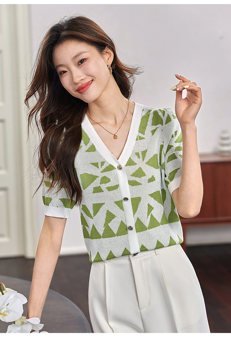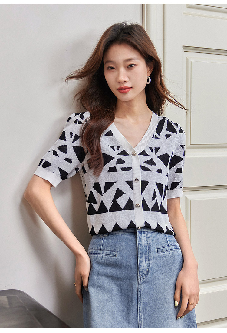 【专属特价】熙世界法式格纹提花针织衫女薄款夏季泡泡短袖V领上衣2025新款