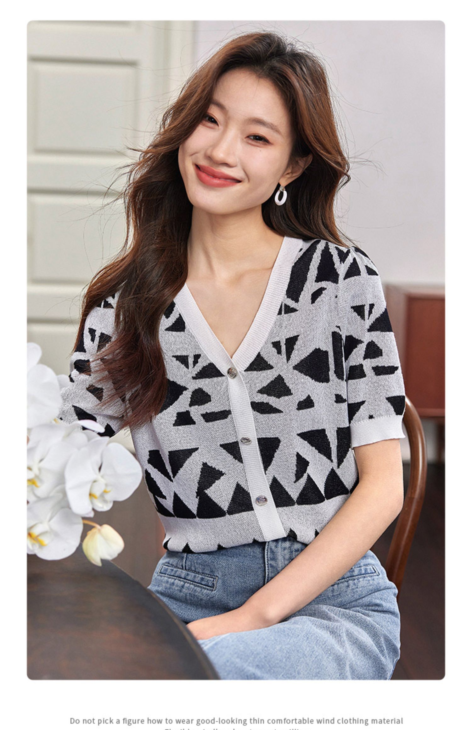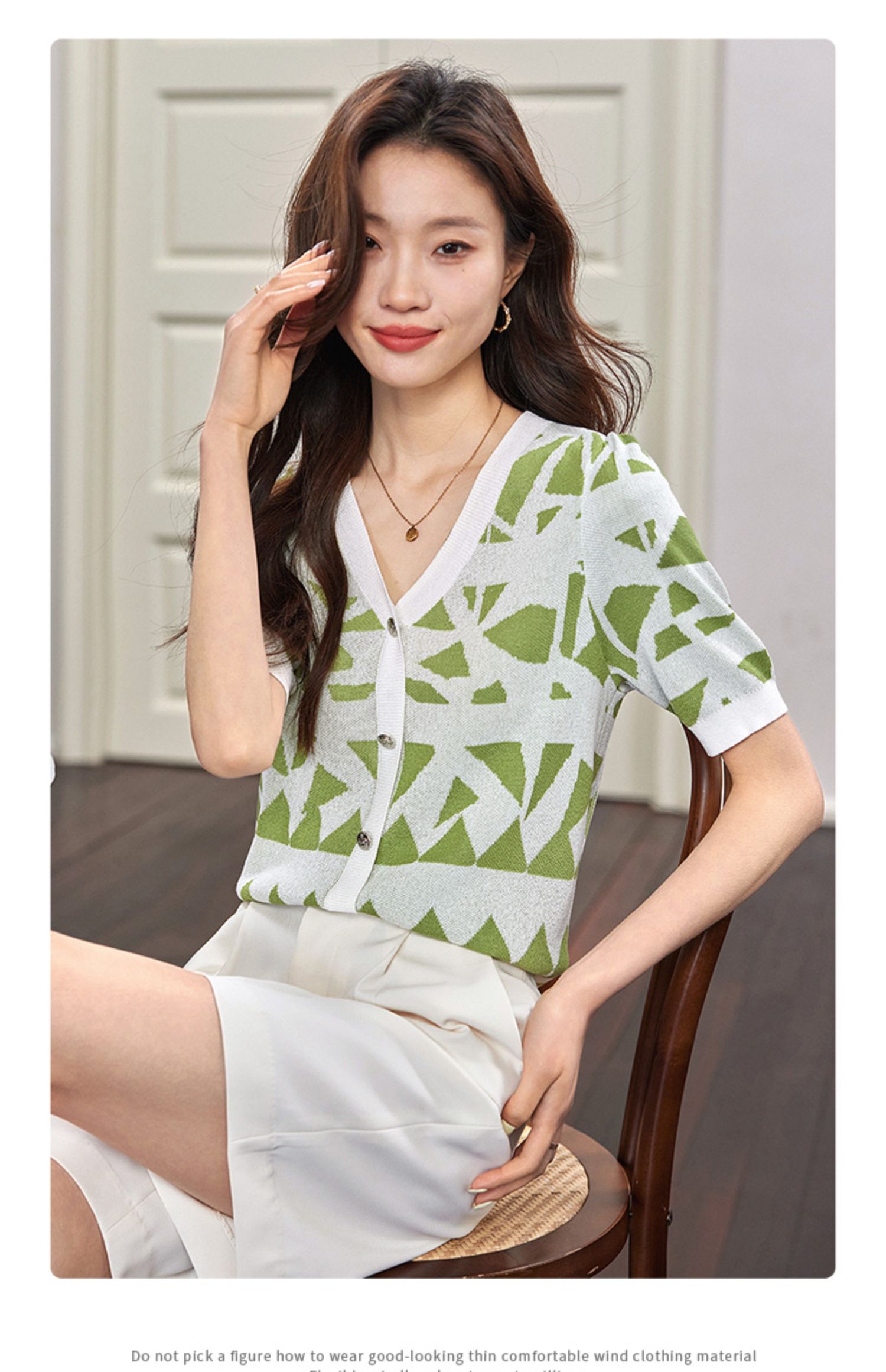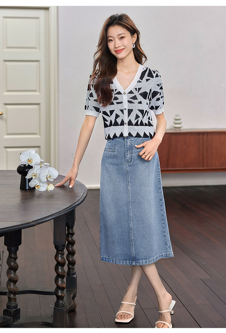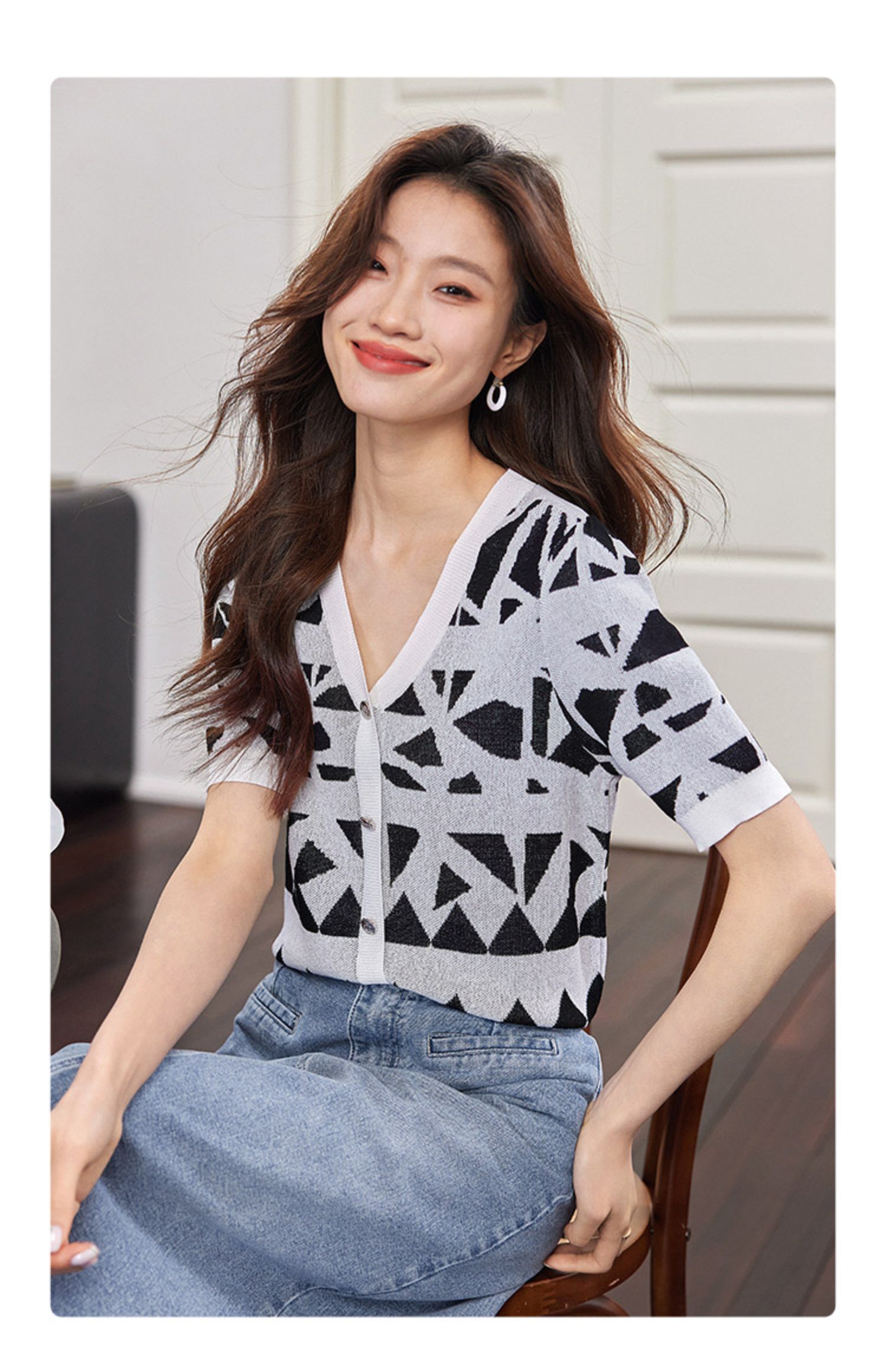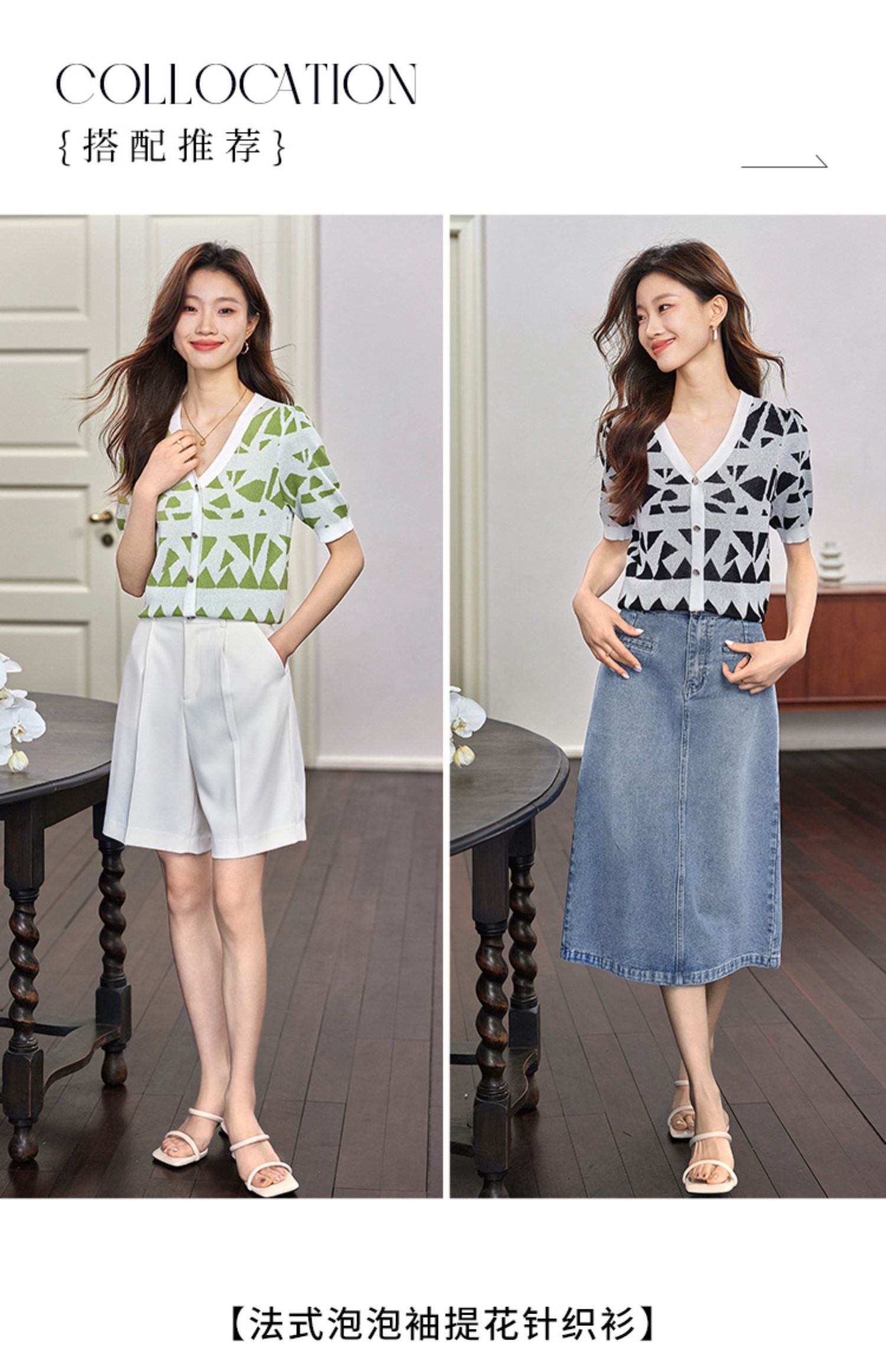 【专属特价】熙世界法式格纹提花针织衫女薄款夏季泡泡短袖V领上衣2025新款