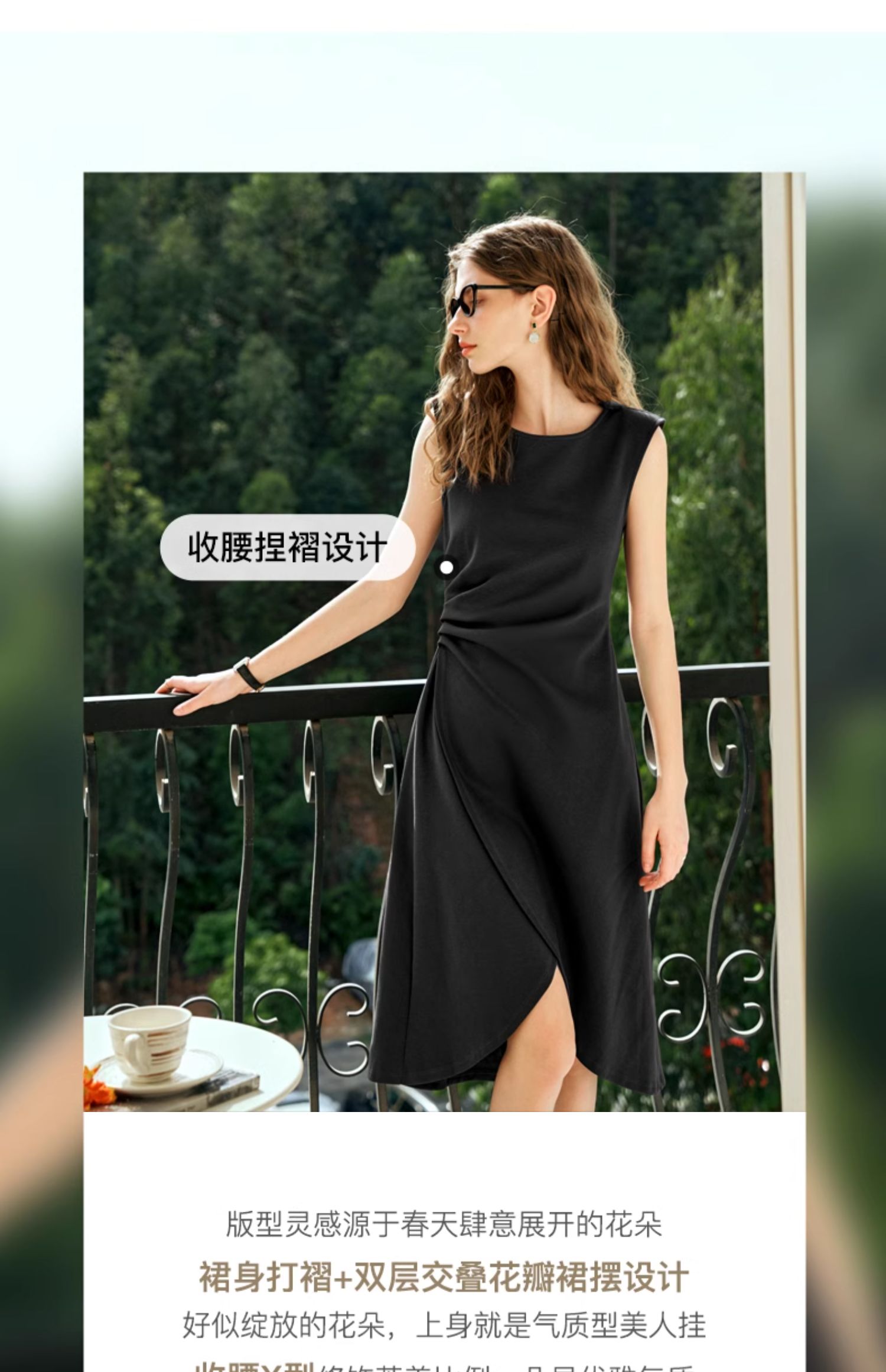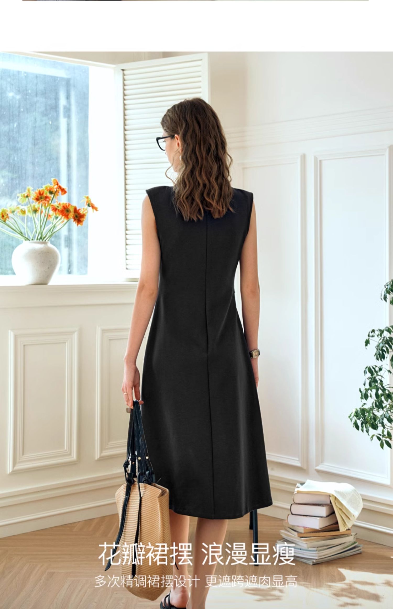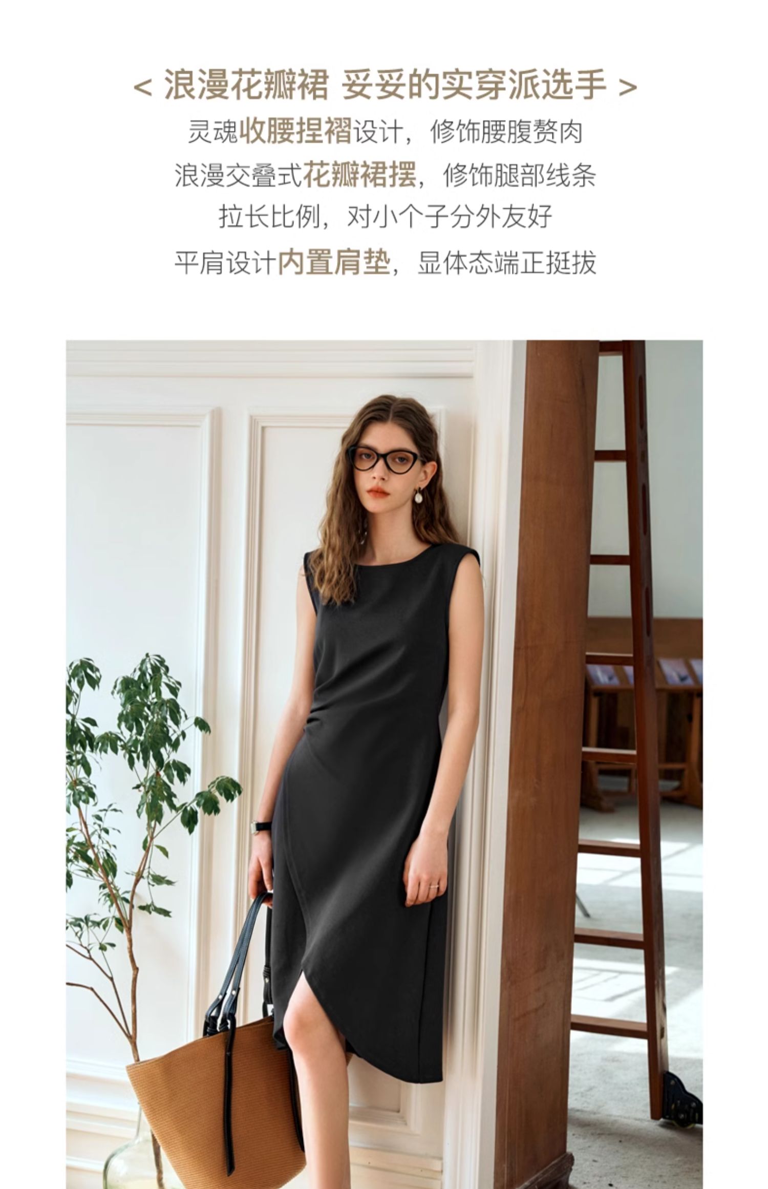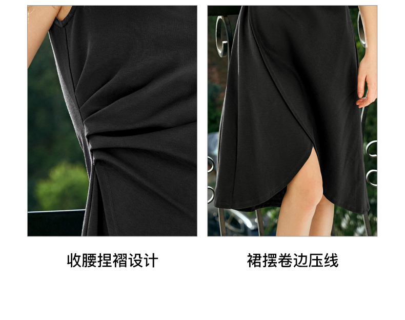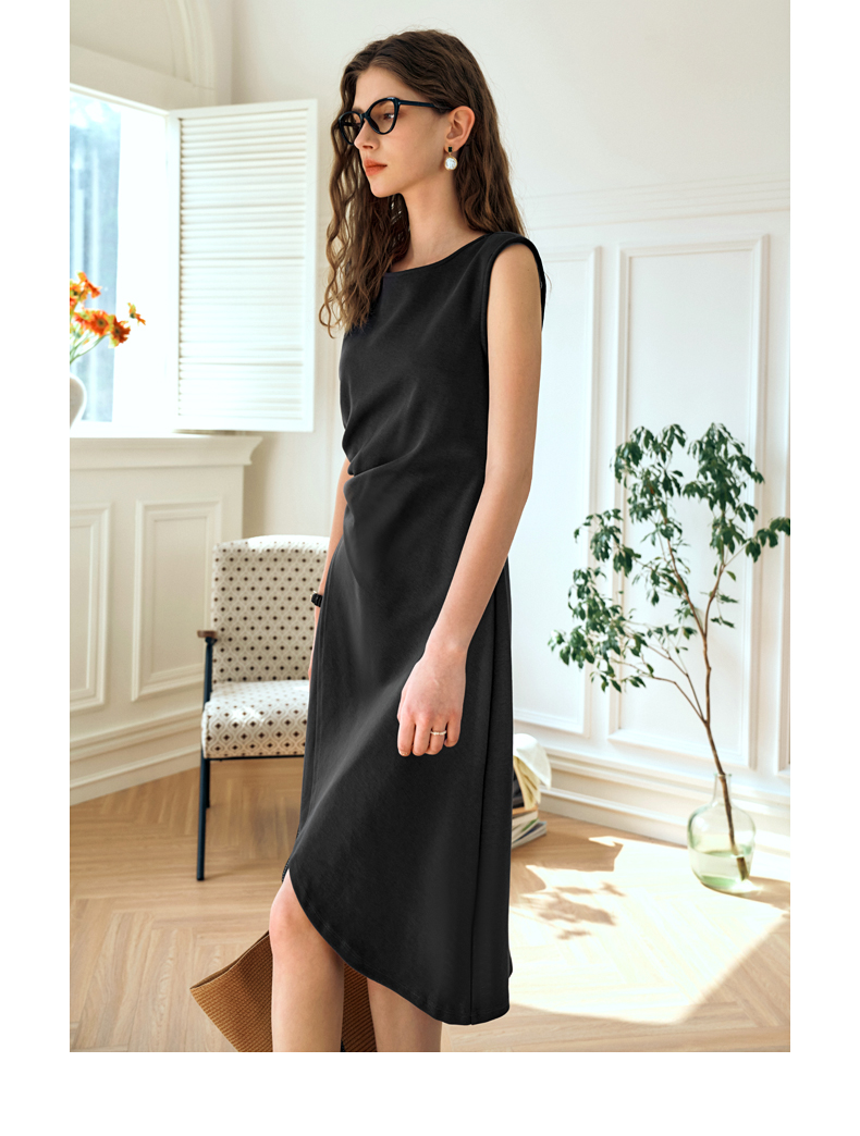 OLrain欧芮儿法式黑色无袖连衣裙女夏2024新款优雅褶皱收腰花瓣裙