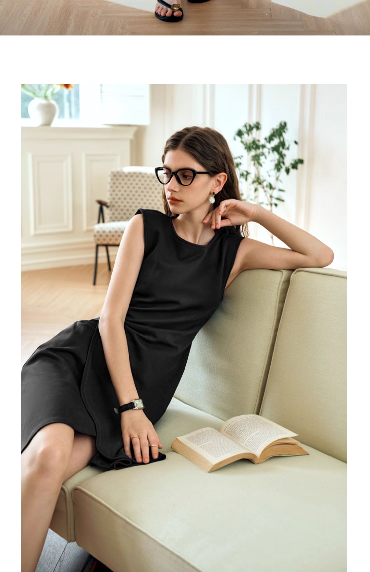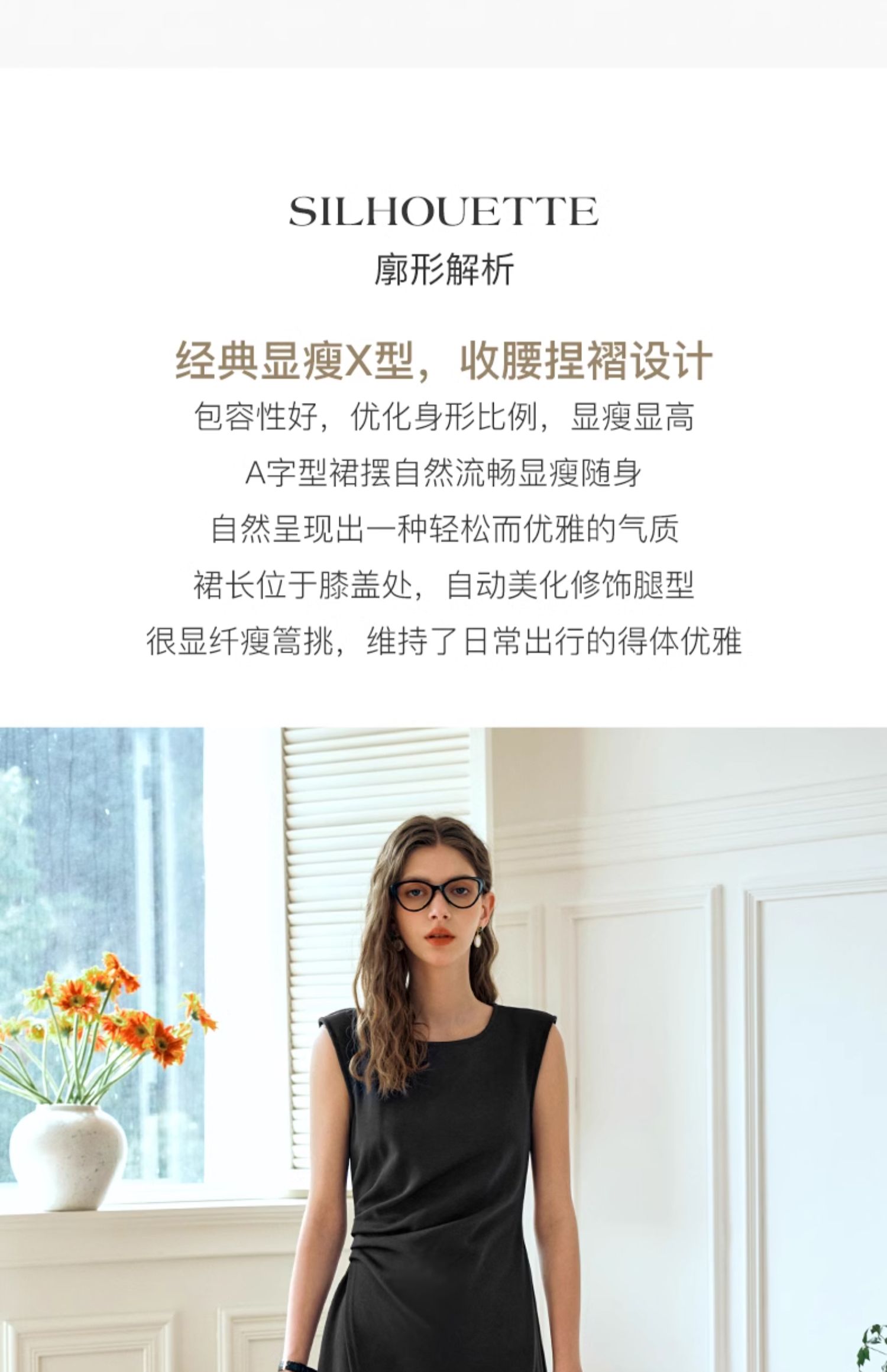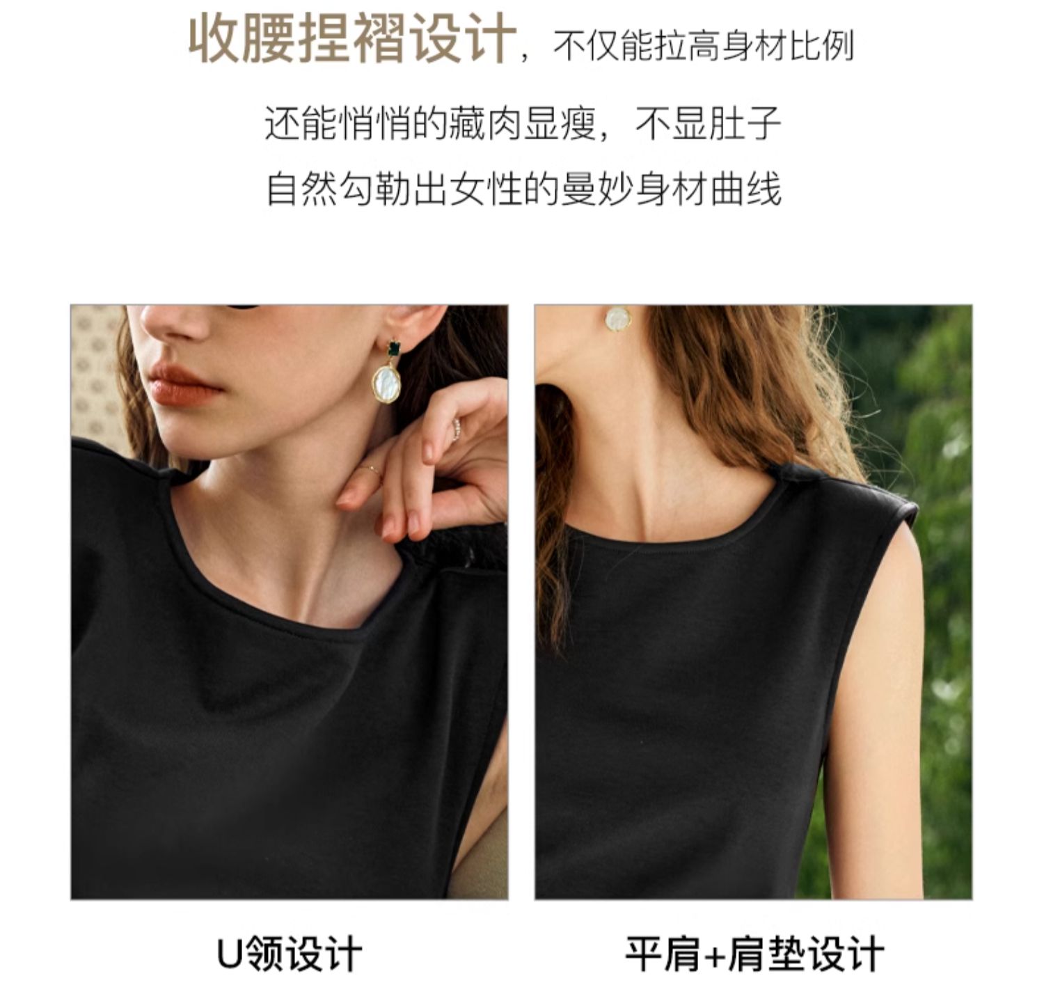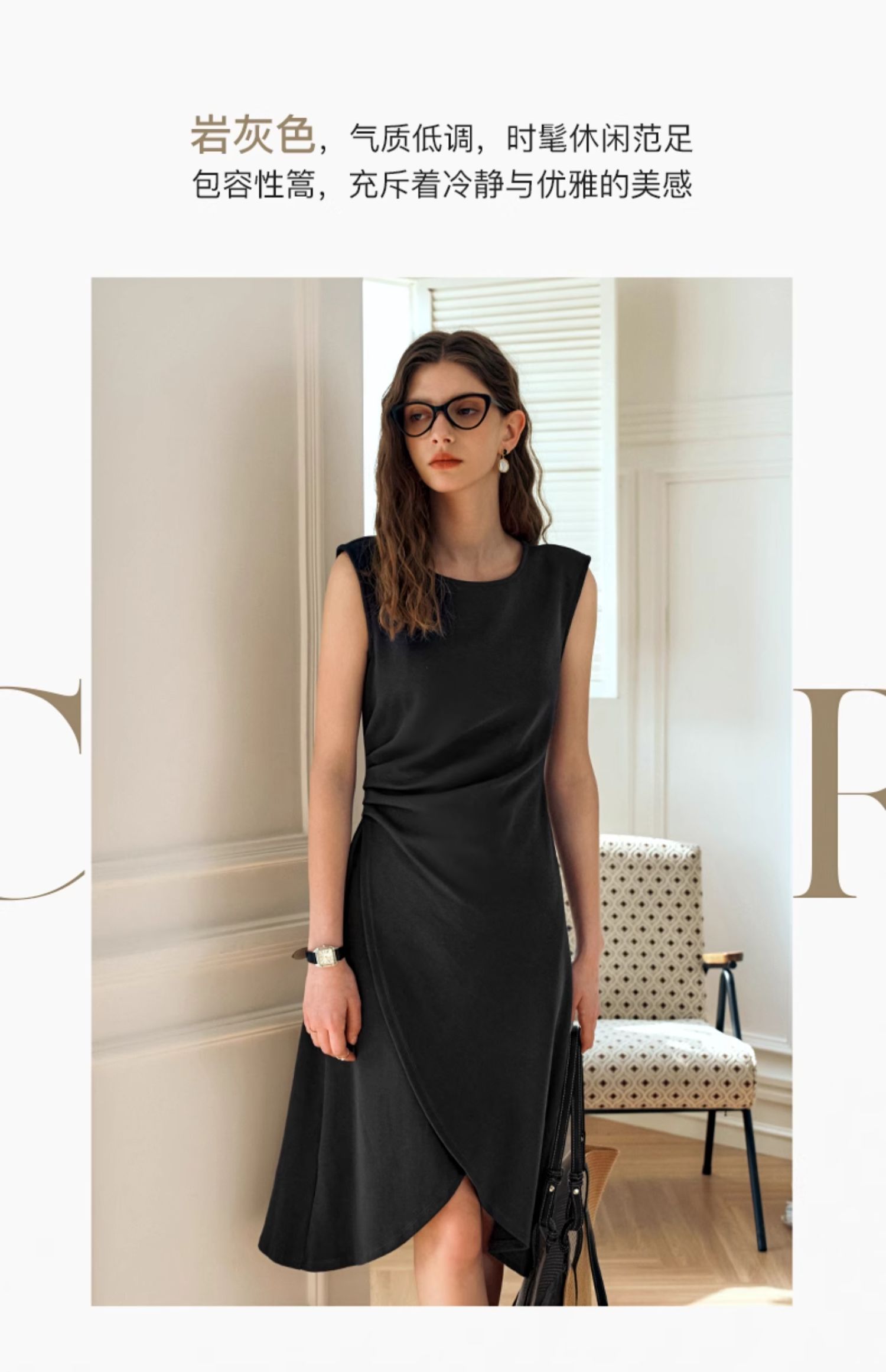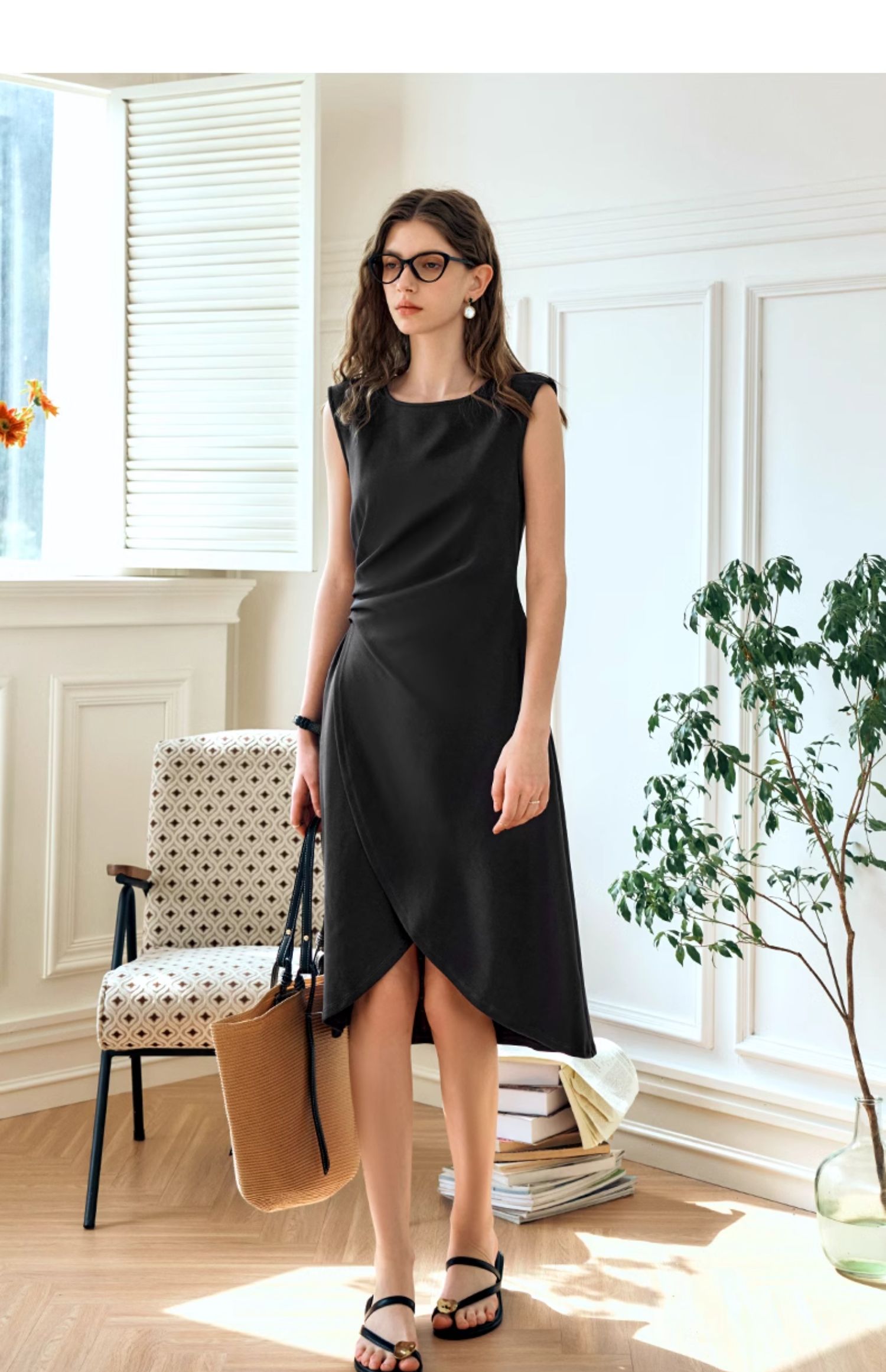 OLrain欧芮儿法式黑色无袖连衣裙女夏2024新款优雅褶皱收腰花瓣裙