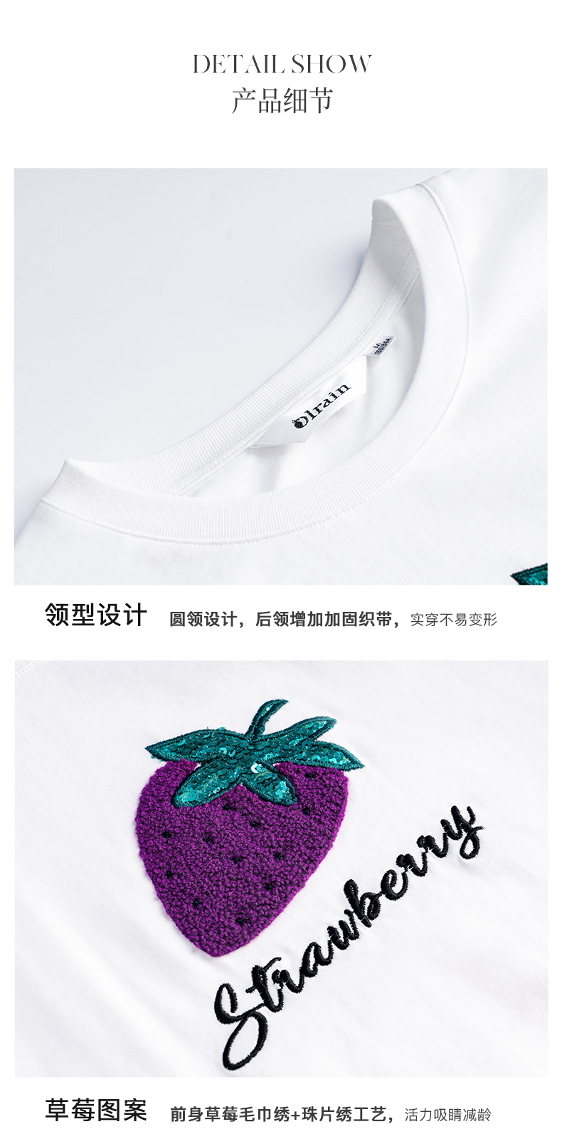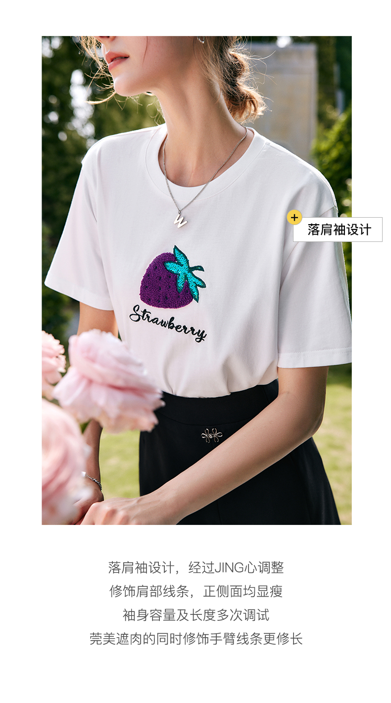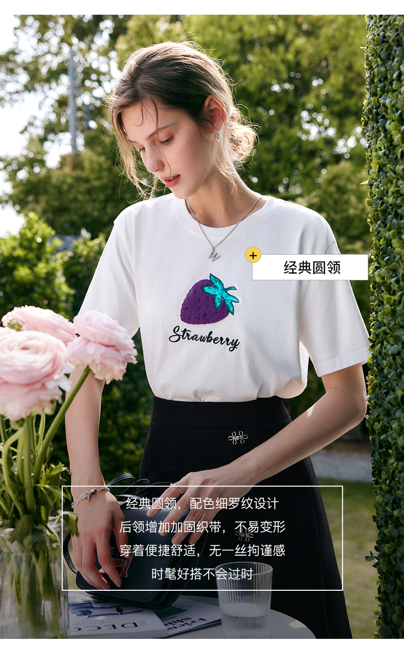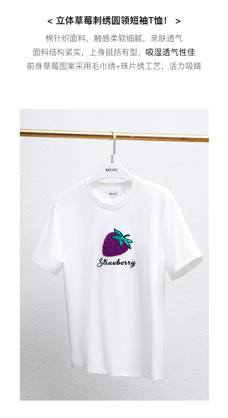 欧芮儿白色短袖t恤女夏季2022新款宽松时尚洋气草莓刺绣减龄上衣