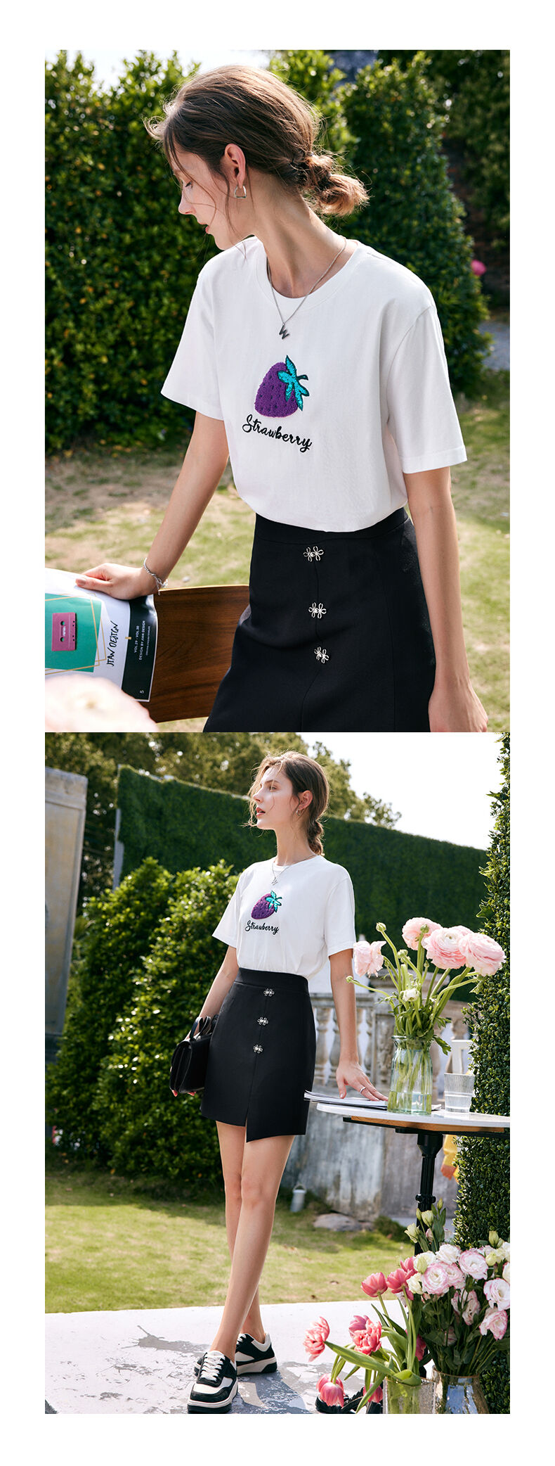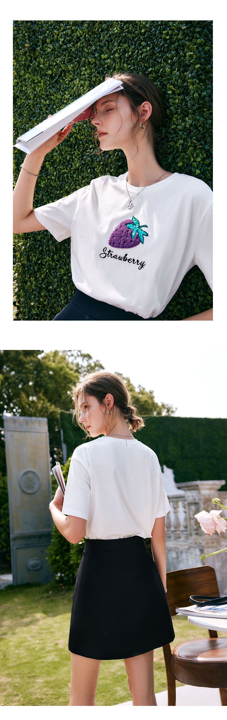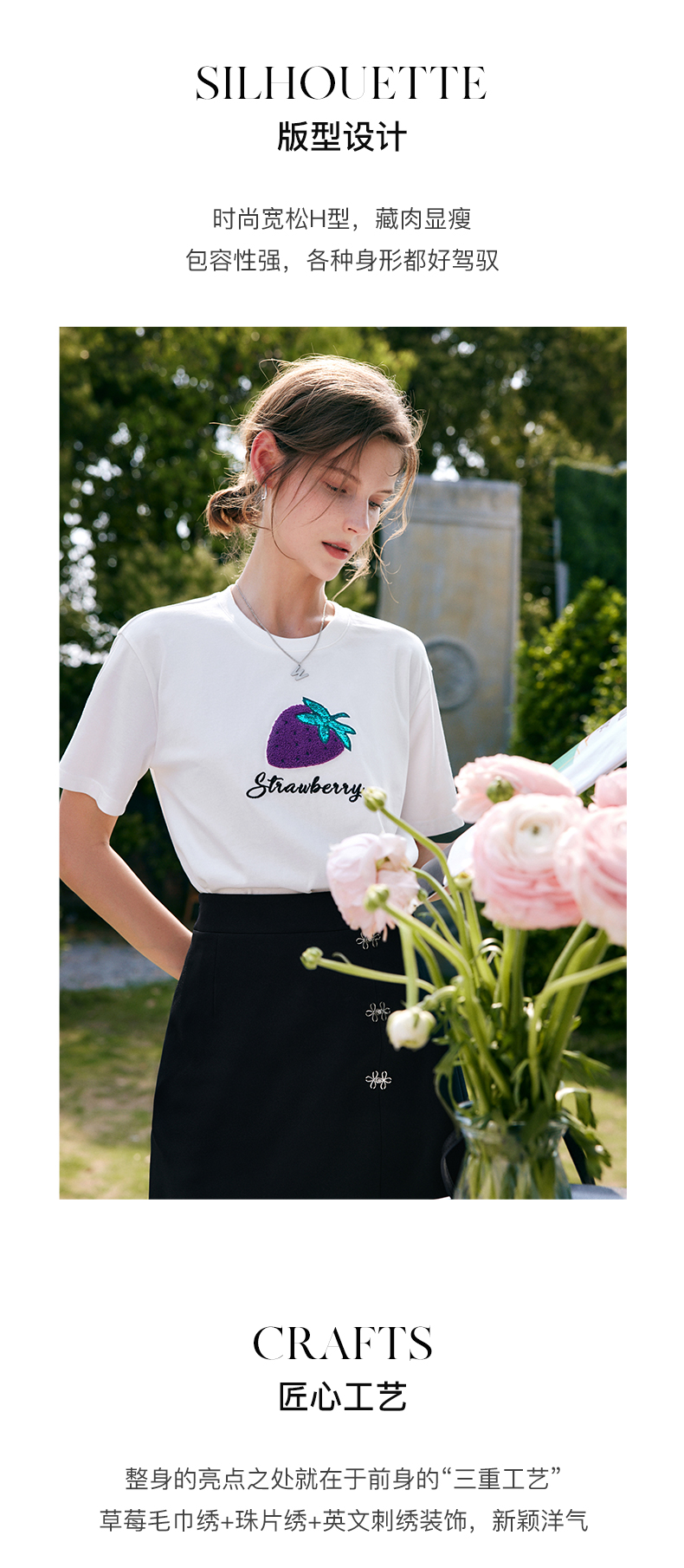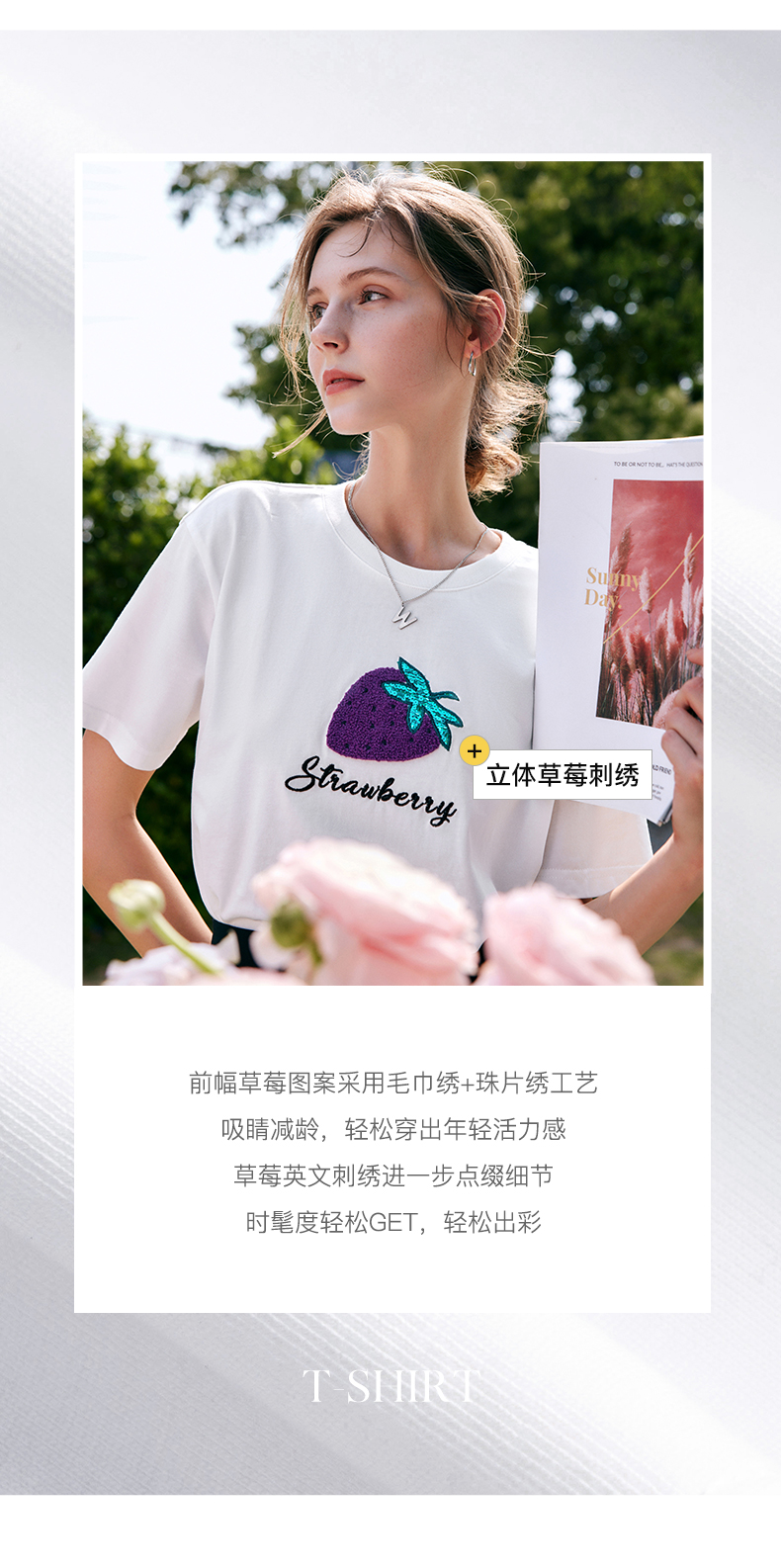 欧芮儿白色短袖t恤女夏季2022新款宽松时尚洋气草莓刺绣减龄上衣