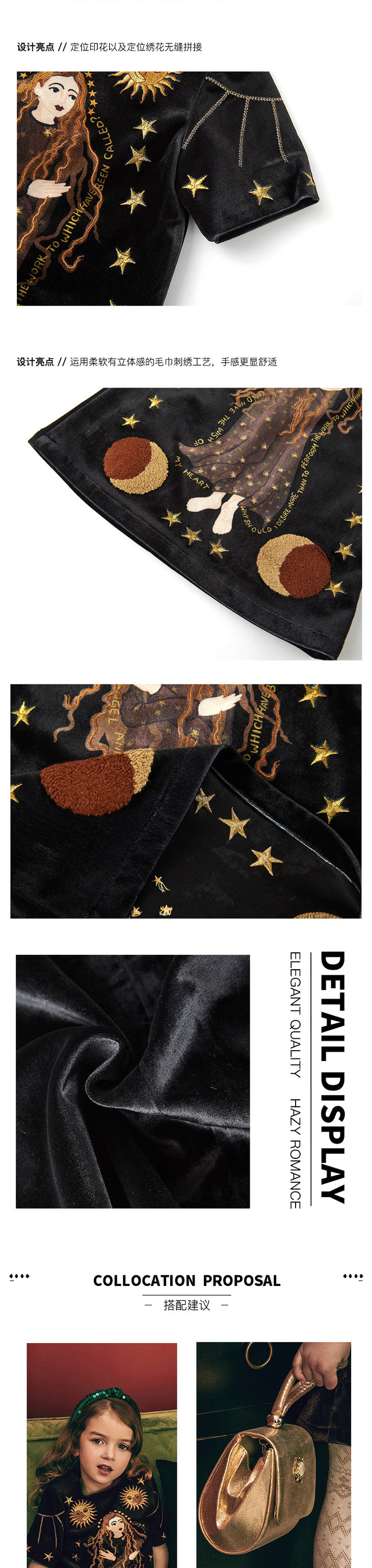黑色印花刺绣复古丝绒连衣裙
