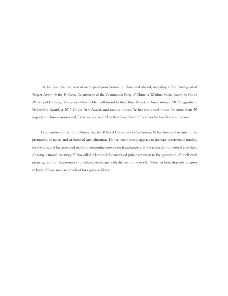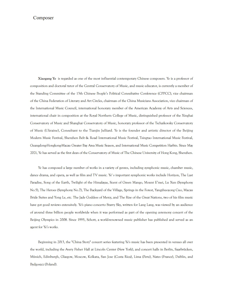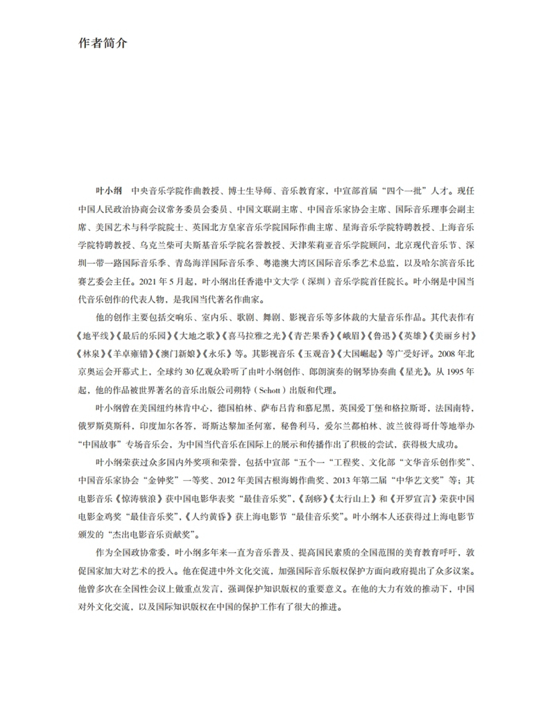 叶小纲,中央音乐学院作曲教授、博士生导师、音乐教育家,现任中国人民政治协商会议常务委员会委员、中国文联副主席、中国音乐家协会主席、国际音乐理事会副主席、美国艺术与科学院院士。叶小纲的作品被国内外众多乐团广泛演出,包括纽约爱乐、费城交响乐团、底特律交响乐团等。叶小纲荣获过众多国内外奖项和荣誉,包括中宣部“五个一“工程奖、文化部“文华音乐创作奖”、中国音乐家协会“金钟奖”一等奖、2012年美国古根海姆作曲奖、2013年第二届“中华艺文奖”等。