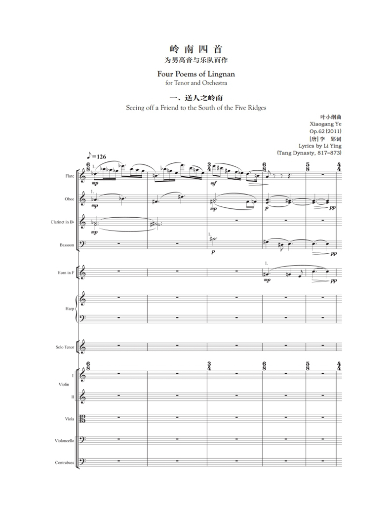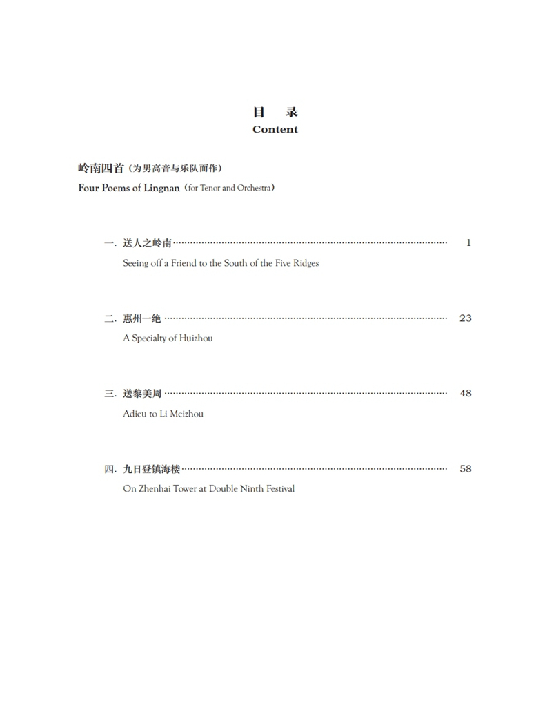 《岭南四首》完成于2011年,是作曲家叶小纲应澳门文化局及澳门乐团的委约,为男高音与乐队创作的大型作品。该作品以唐、宋、明、清四个时期的四首富有岭南特色诗歌为词,为灿烂的古代文学作品插上音乐的翅膀,在弘扬岭南诗歌的艺术魅力的同时,抒发当代文化艺术家的豪迈情怀,以飨听众。