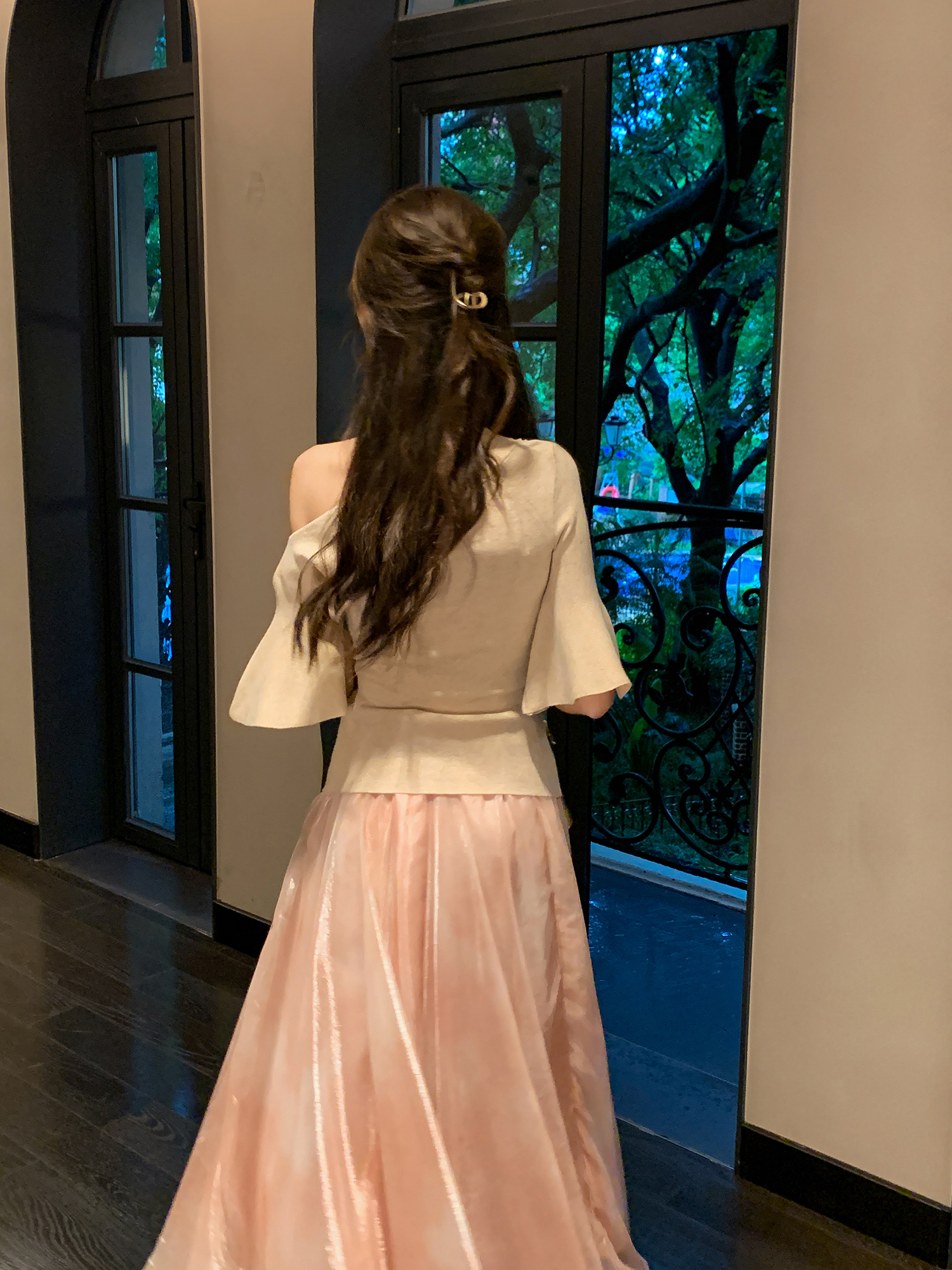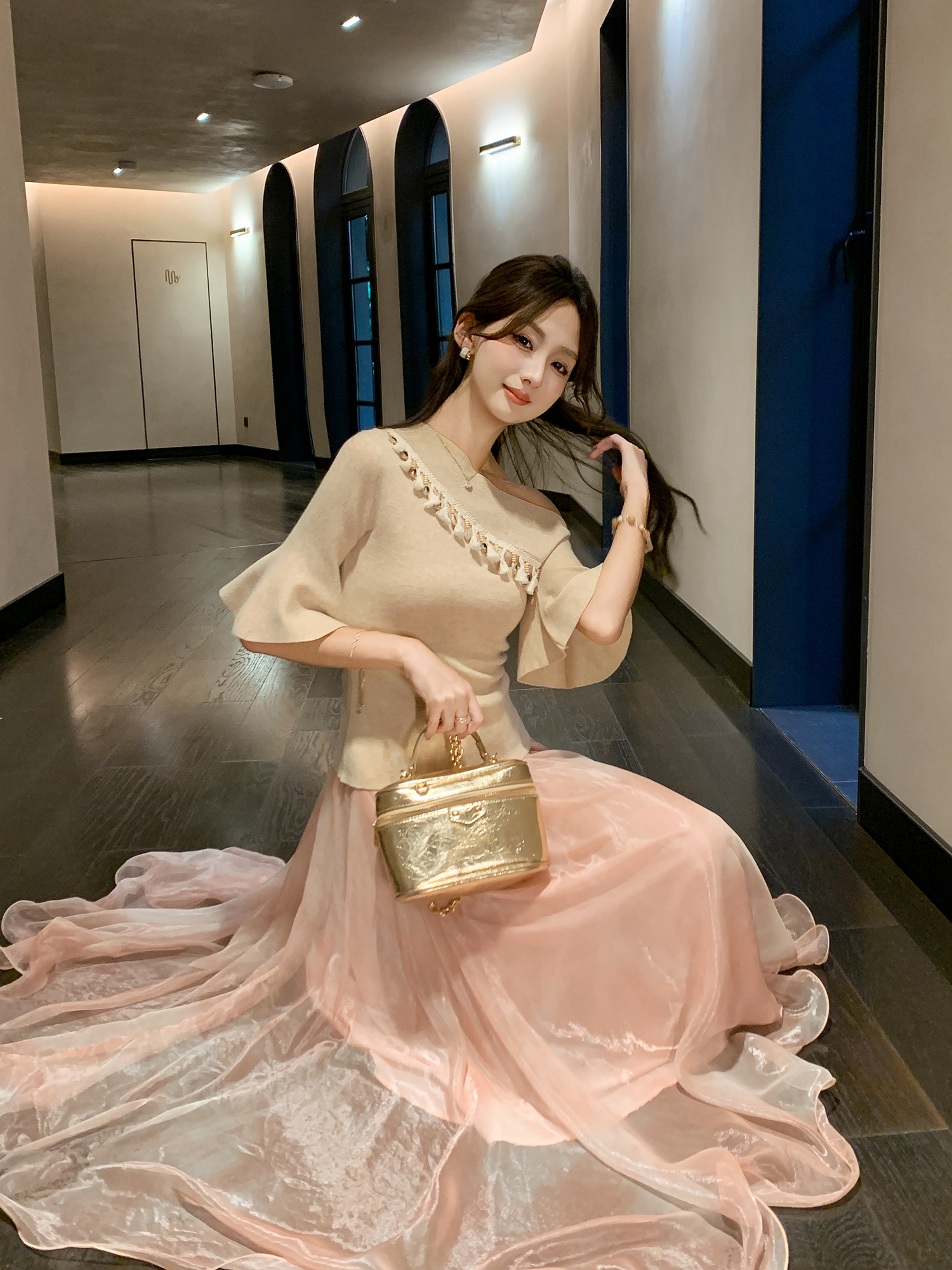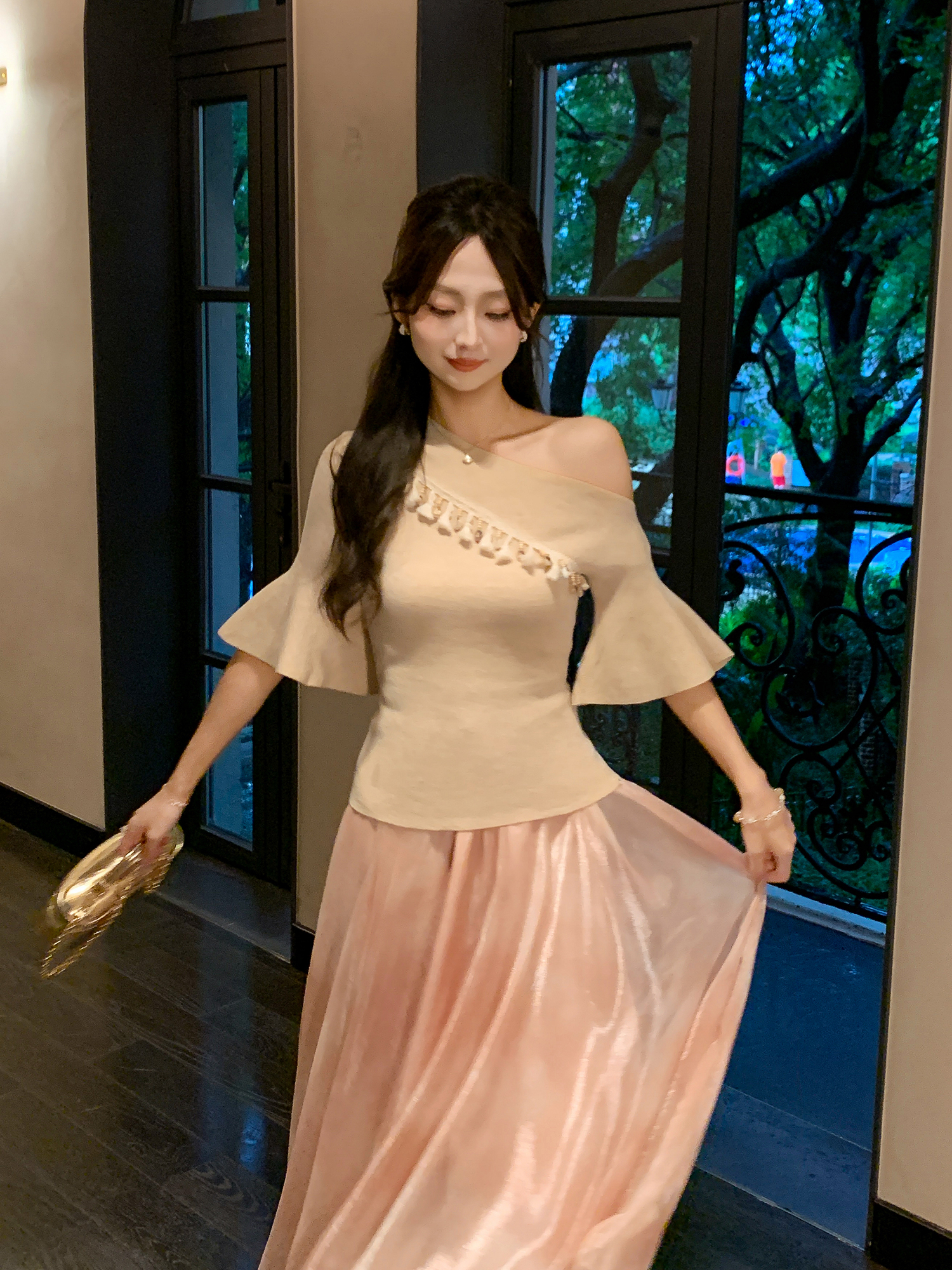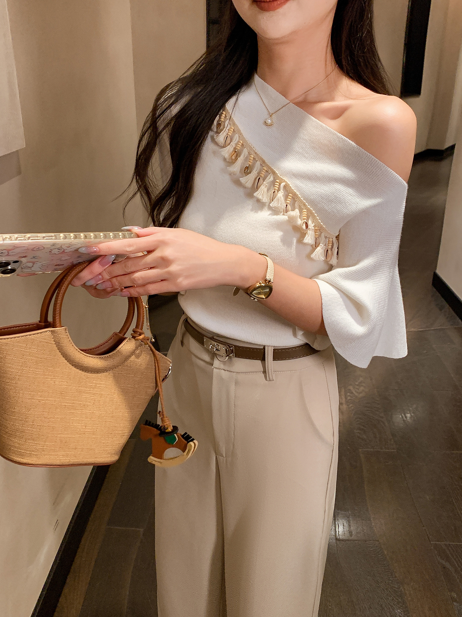 张心子【月光海滩】不规则斜领半袖针织衫女秋季新款气质显瘦上衣 U2508015