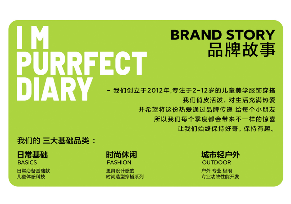 - Purrfect-Diary专注于贴近自然随性的穿着概念,轻奢平价的童装文化传播,在产品设计上更加注重婴童穿着的舒适性、安全性、更出众的国际化品牌,将欧美的育婴文化在中国进行深入的传播与推广。