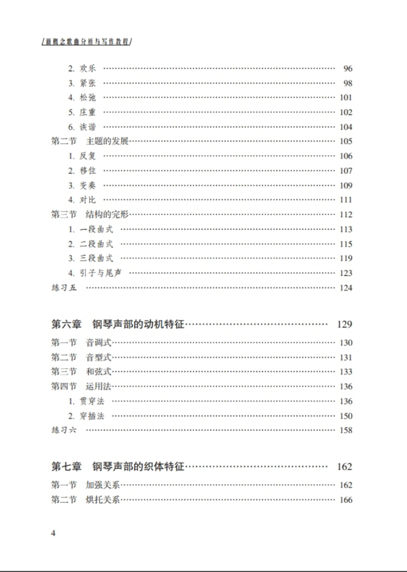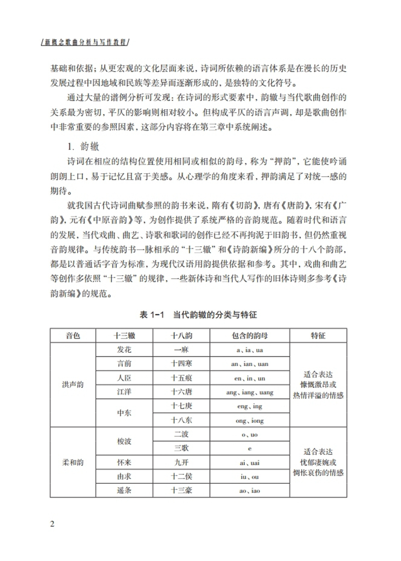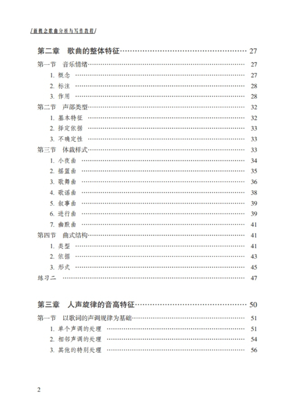 教学内容聚焦于“方法”。音乐语言会因人而异,音乐风格也会因时代而变化,历史长河中的经典作品能够传承的是思想和方法,“形而下”的方法与“形而上”的思想之间也一定有着必然的关联。因此,本书力求全面和专业地总结歌曲写作的方法,不仅包括人声旋律的音高与节奏写作技术,还有和声与织体等多声部写作技术。