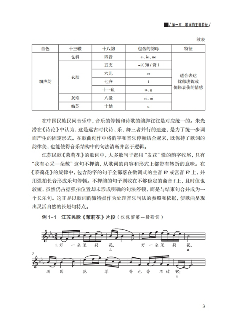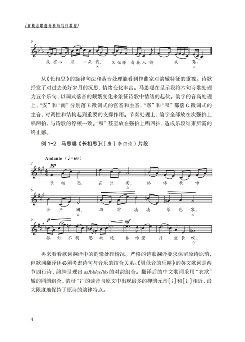 谱例选用主要强调“有效”。谱例类型既有民歌、抒情歌曲也有艺术歌曲,因为音乐历史中不同类型和风格的作品之间本来就存在相互借鉴和渗透。还要强调的是,本书的谱例集中于调性音乐时期的作品,分析重在汲取其中的写作思路和表现途径,这些传统技术不仅是通往自由创作的基石,这些技术原则也符合普遍的美学规律。
