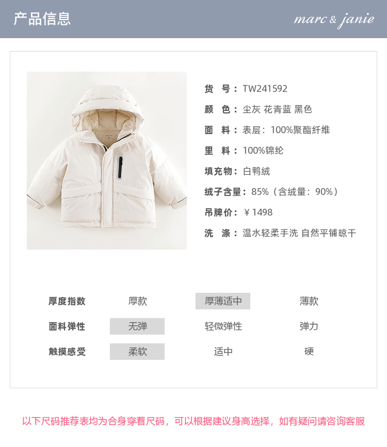 【三防保暖】马克珍妮男童户外防寒羽绒服2024年冬装新款241592