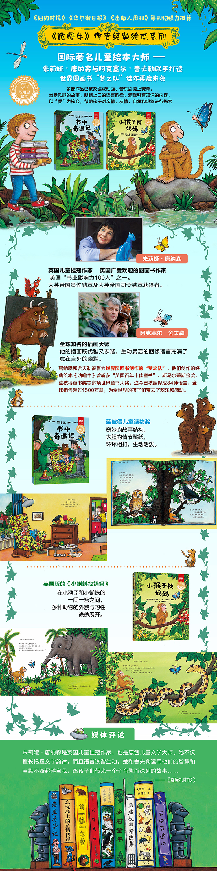 朱莉娅·唐纳森是英国儿童桂冠作家,也是原创儿童文学大师。她不仅擅长把握文字韵律,而且语言诙谐生动。她和舍夫勒运用他们的智慧和幽默不断超越自我,给孩子们带来一个个有趣而深刻的故事……——《纽约时报》朱莉娅·唐纳森和阿克塞尔·舍夫勒对这样一个无生命之物的描摹尖锐而深刻、紧张而刺激,这不禁使人联想到劳瑞·凯勒或是《绒布小兔子》。唐纳森的文字用韵讲究,从不错漏韵拍;舍夫勒绘图的色彩诙谐灵动,画中的动物、人物和景物独具个性。该作品堪称冬日里的常青藤。——《出版人周刊》舍夫勒引人入胜的插画,唐纳森优美迷人的韵文,以及反复出现的叠句,使该书成为了一部成功的朗读佳作,此后也必将经久不衰。——《科克斯书评》