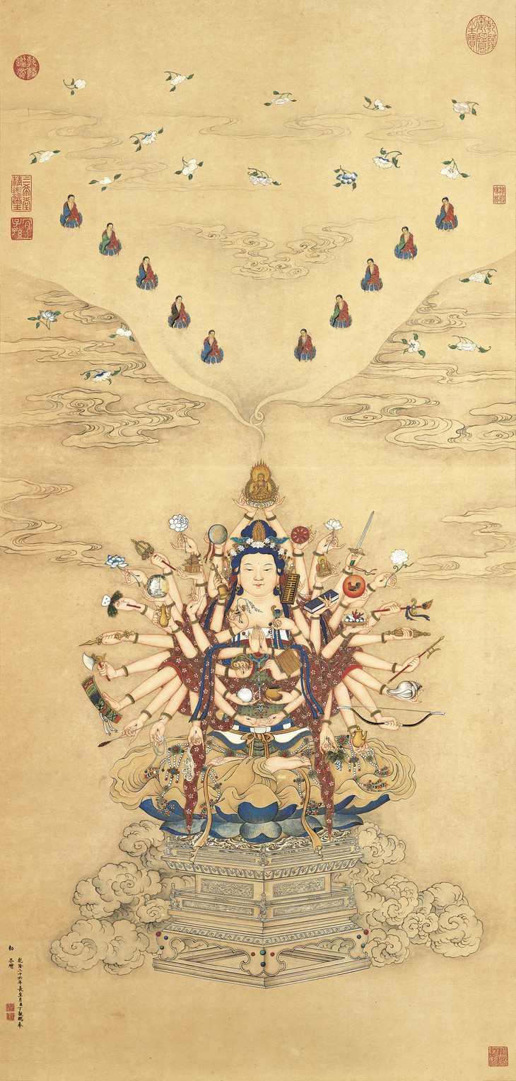 观音为佛教大乘菩萨之一,佛经上说此菩萨能“救苦难众生”,示现种种形象,名为“普门示众”,一般形态多作女相。此图绘千手宝相观音一尊,各手分别持小斧、莲花、宝剑、弓箭等各种法宝;头上祥云朵朵飘荡,云中托出小佛十尊,花朵飞扬。观音面容和手臂作多层烘托,有较强的立体质感。说明作者在继承传统技法的同时,也吸收了西洋画的明暗、透视等特点,形成了自己的风格。