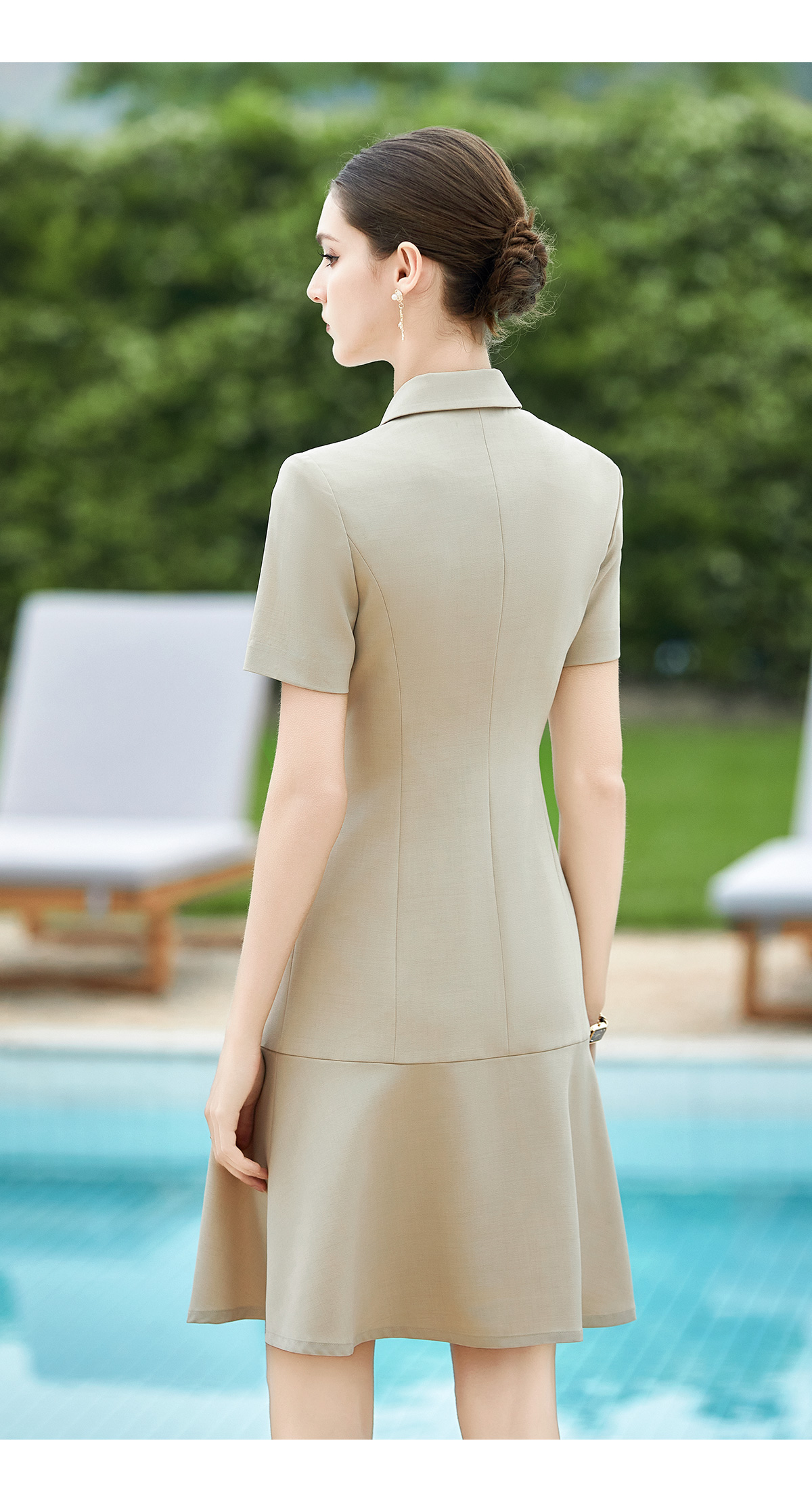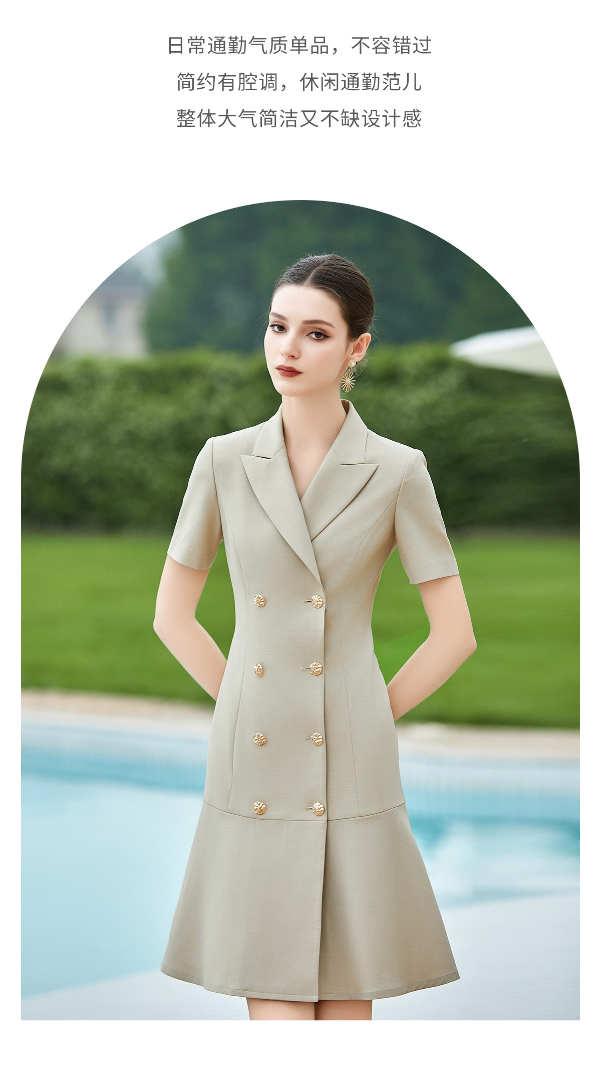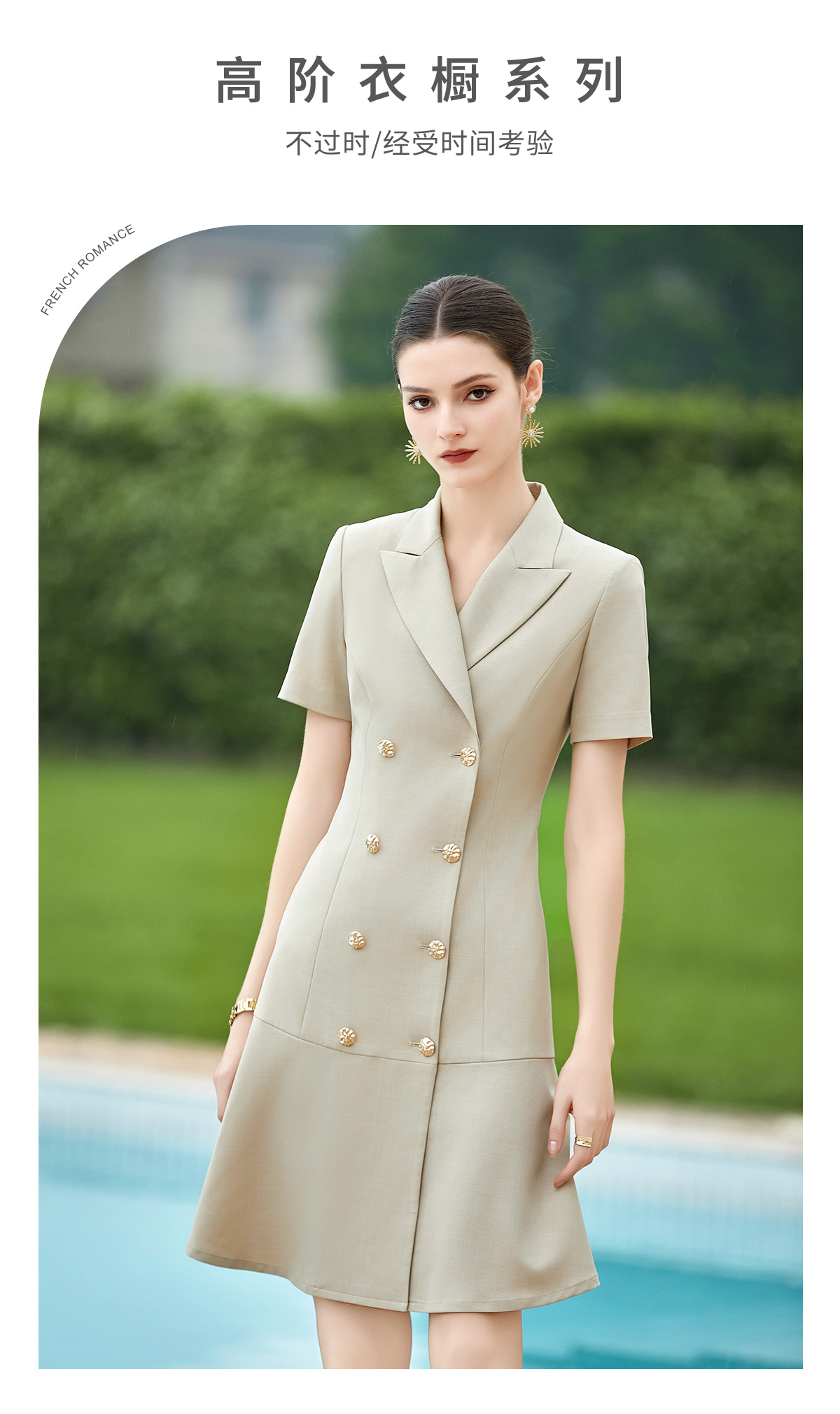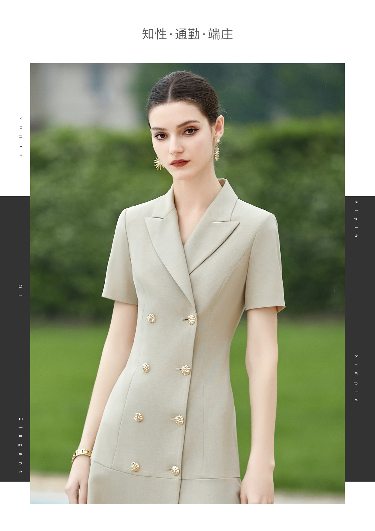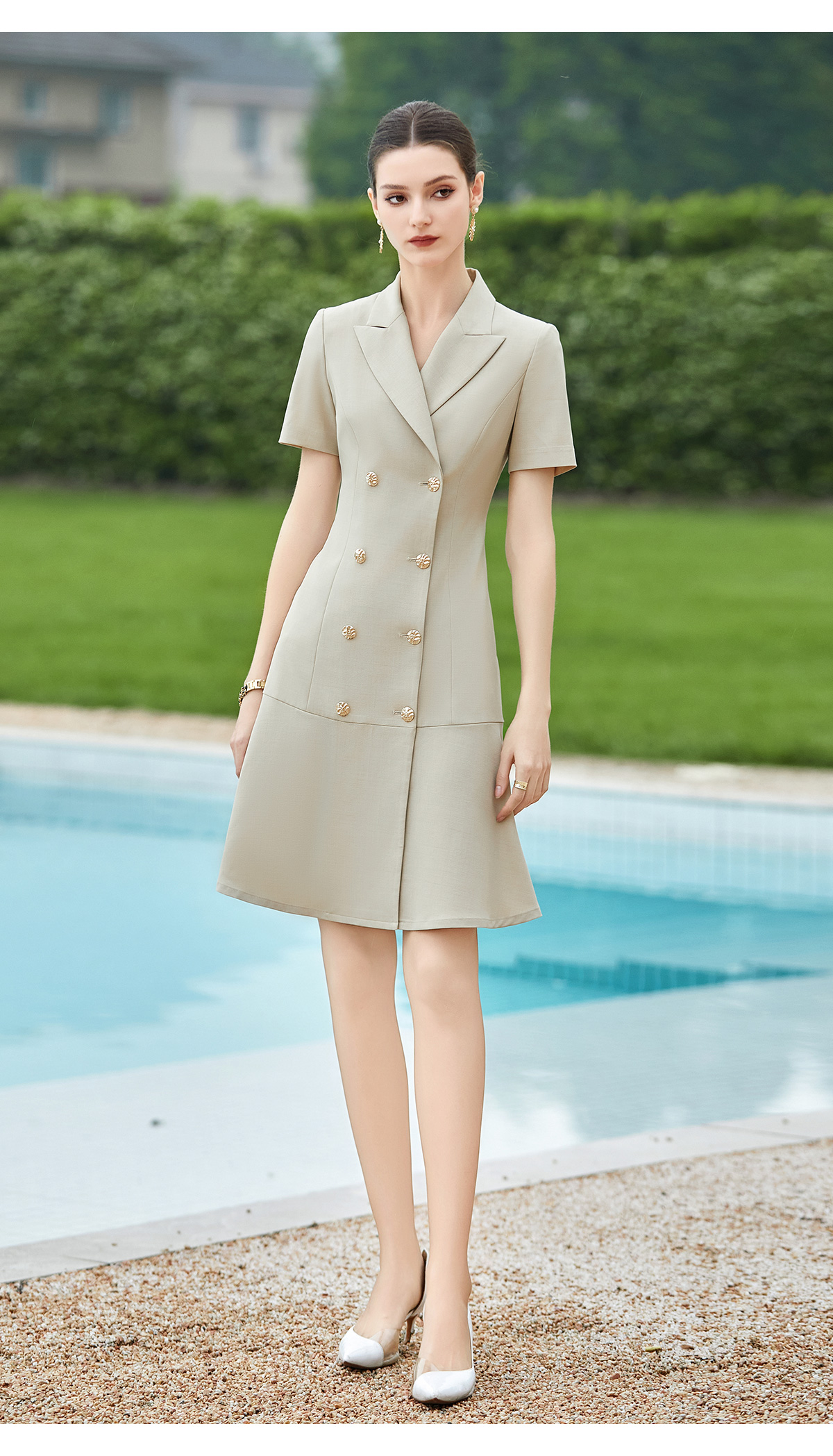 IWY/端庄大气连衣裙女灰杏色西装连身裙双排扣职业工作服短袖西服裙Q1154