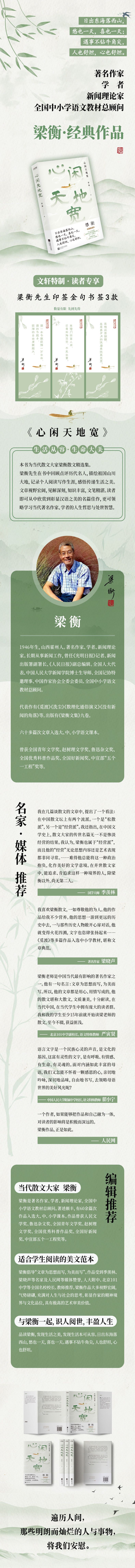 当代散文大家梁衡 梁衡是著名作家、学者、新闻理论家,全国中小学语文教材总顾问。著述颇丰,有60余篇次作品入选大、中、小学语文课本。曾获人民文学奖、鲁迅杂文奖、全国青年文学奖、赵树理文学奖、全国优秀科普作品奖、全国好新闻奖、中宣部五个一工程奖等。 适合学生阅读的美文范本 梁衡倡导“文章为思想而写,为美而写”。作品受到季羡林、梁晓声等名家及人民网等媒体赞誉,人大附中、北京101中学等全国名校校长、教师推荐。梁衡作品大多视野宏阔,气势磅礴,充满对人生与社会的思考,彰显作家的精神境界与文化品位,具有极高的艺术审美价值。 与梁衡一起,识人阅世,丰盈人生 品读梁衡,发现生活之美,发现生活本可从容。日出东海落西山,愁也一天,喜也一天;遇事不钻牛角尖,人也舒坦,心也舒坦。 文轩专享作者印签金句书签3张,名家珍藏