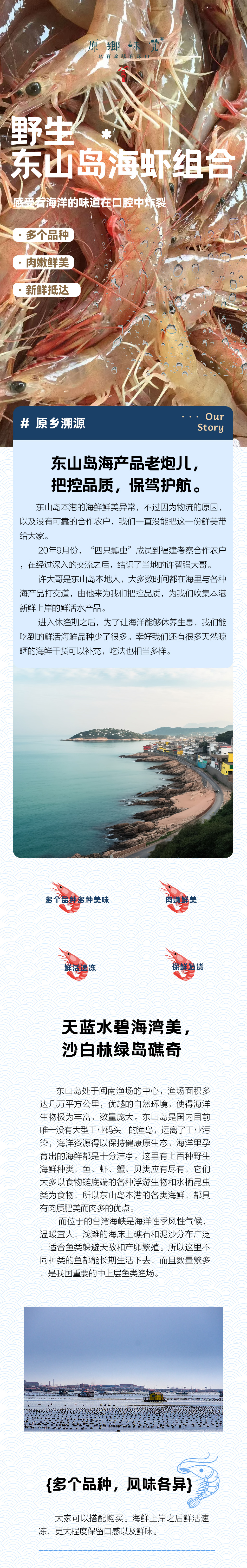 【产地】:福建省漳州市东山县东山岛外海 【生产方式】:海鲜在东山外海野生生长,采取网捕、灯捕、海钓等方式捕捞,上岸后活冻或者鲜冻,不添加任何保鲜剂。 【储存方式】:密封急冻 【保质期】:10个月 【建议烹饪时间】:黄基鳌虾、沙虾:2.5到3分钟;樱花虾,鸡冠虾:1.5到2分钟