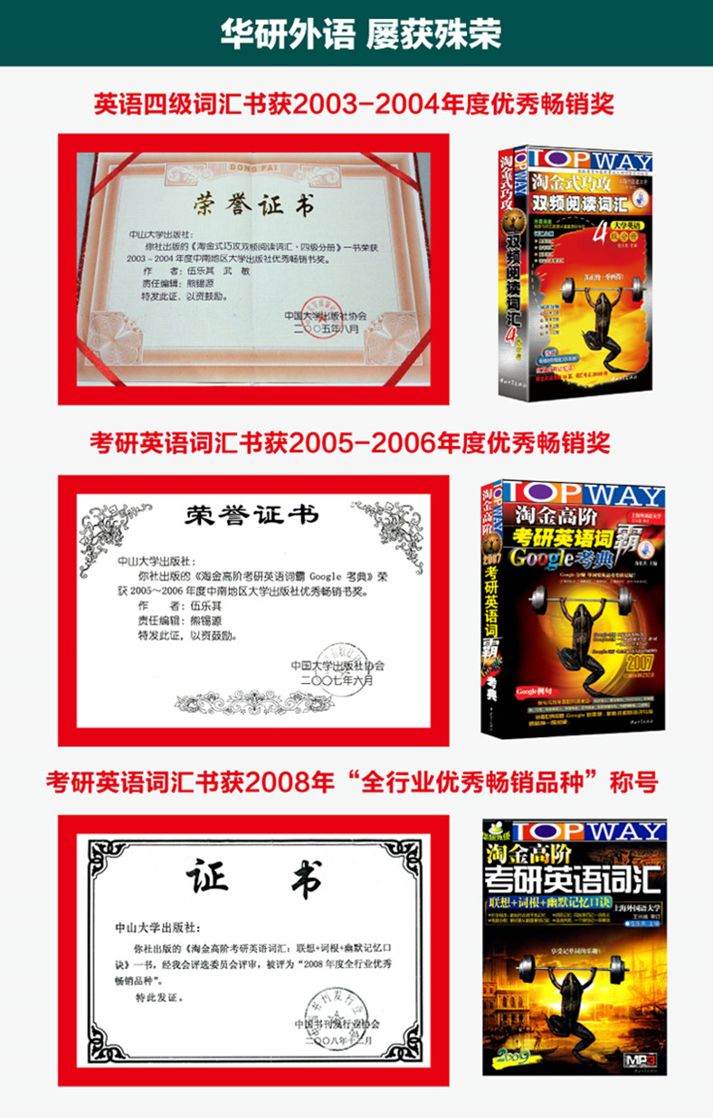 TOPWAY是华研的做事原则,经验表明,方法得当就会事半功倍,让您花更少的时间取得更好的学习效果;“沙里淘金”是华研的思维方式,通过语料库分析、词汇分频、难度分级等诸多科学手段,让您抓住问题的关键,用20%的精力取得80%的成效,体现“二八定律”,从而达到“四两拨千斤”的效果。