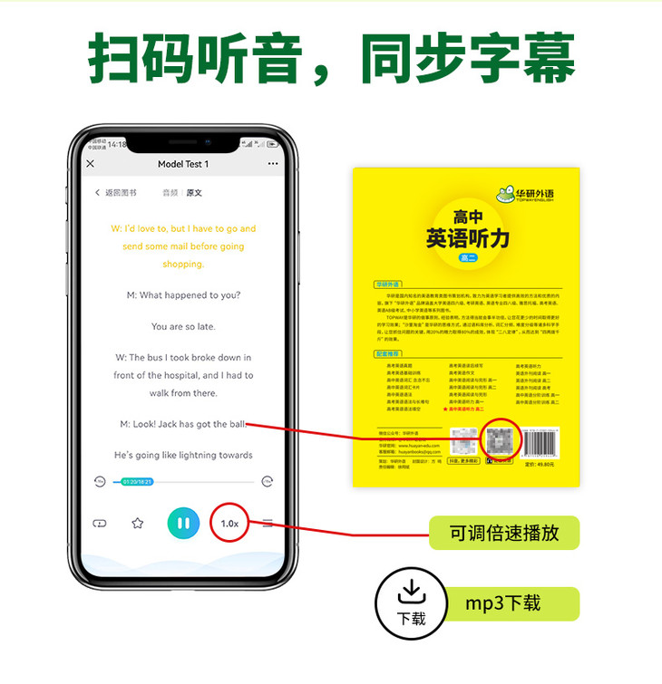4. 提供短对话、长对话和独白三大专项的训练共约400题;提供30套标准模拟训练,共600题,题型、设题模式与高考英语听力一致,难度符合高一阶段的难度要求;