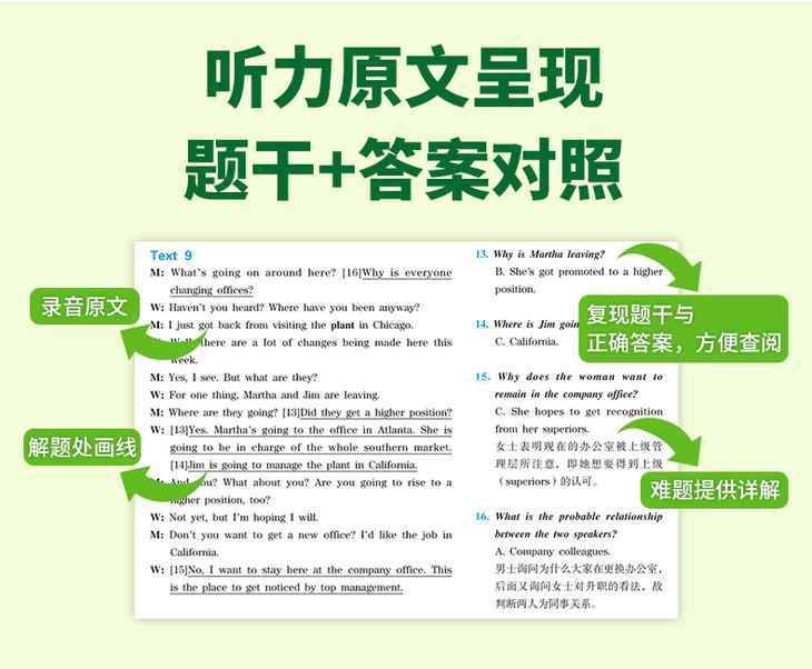 5. 提供录音原文和对应的题目、正确答案,对部分难题解析说明,并画出答题关键解题句;