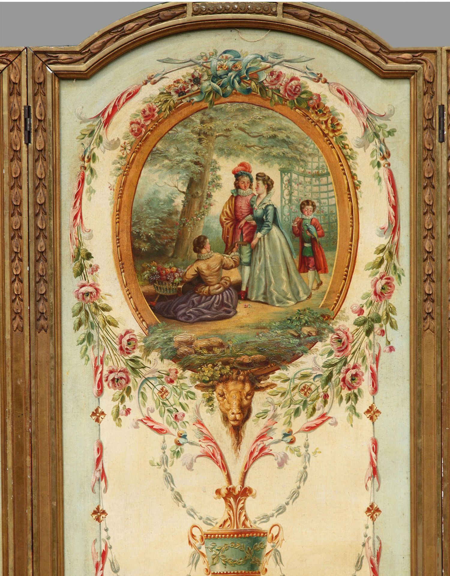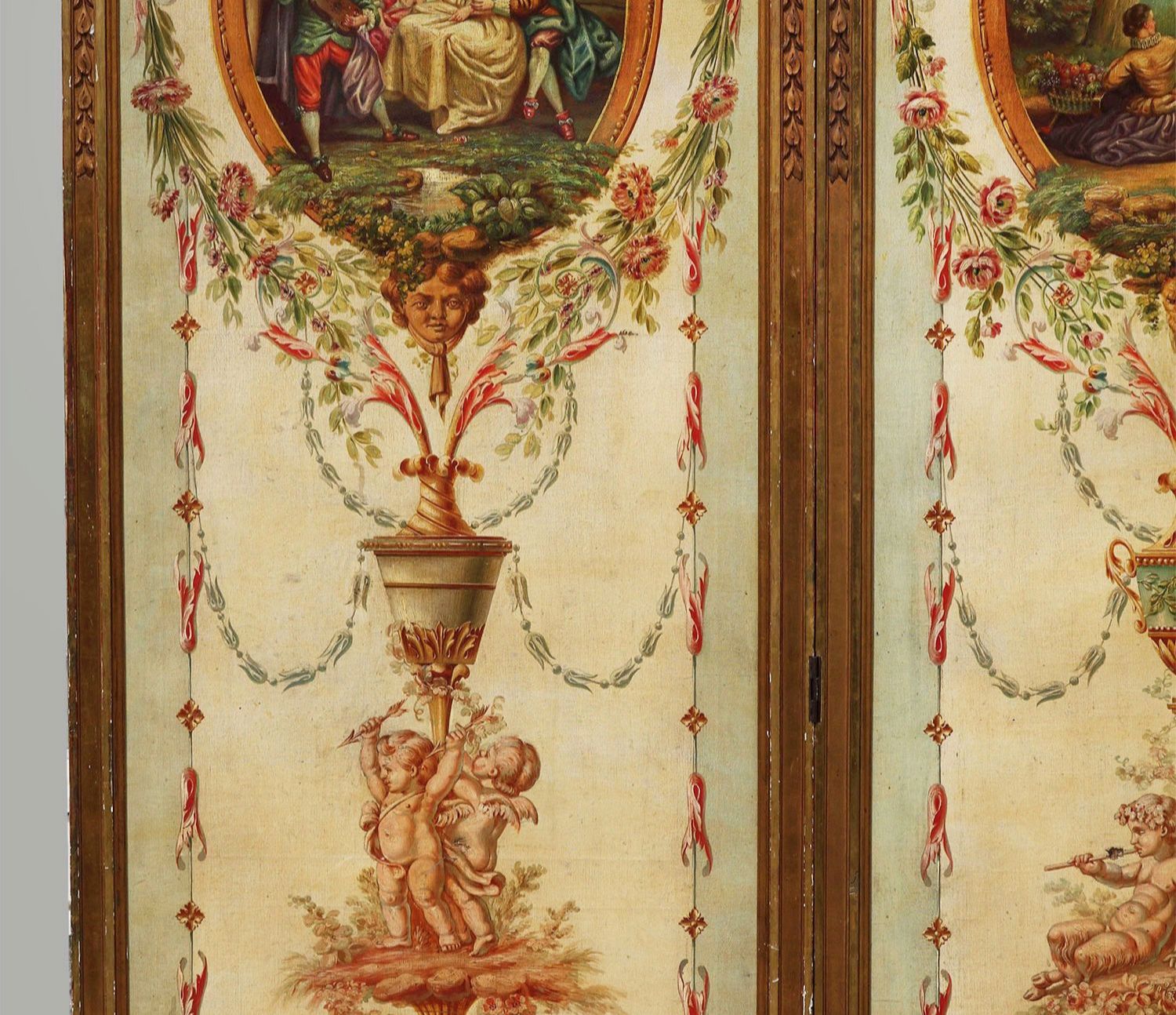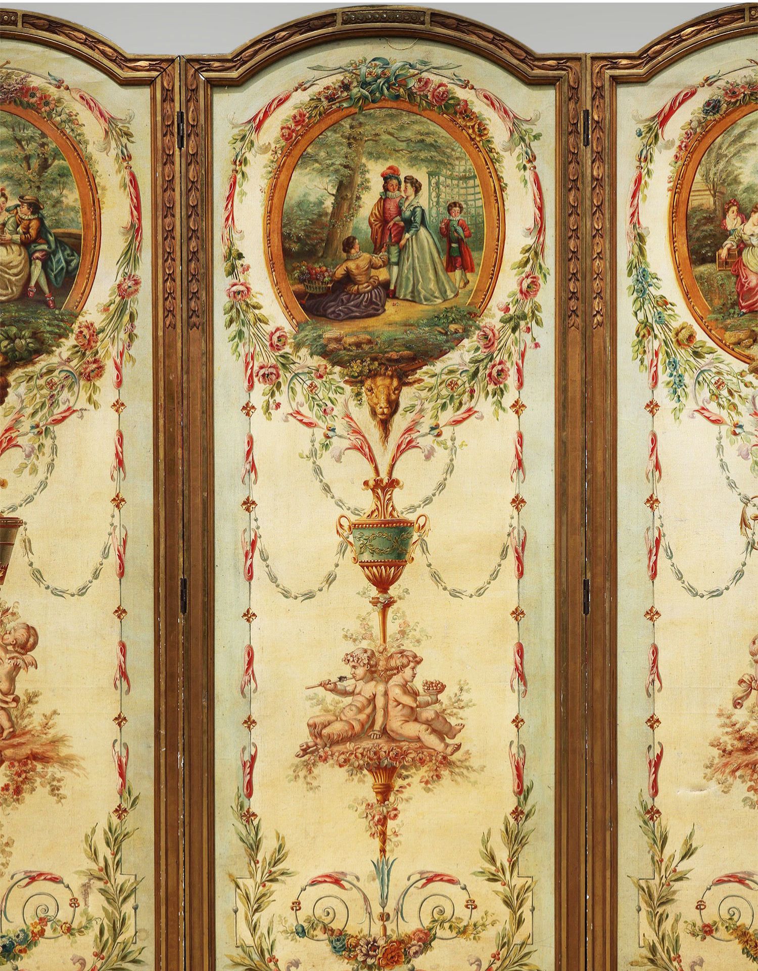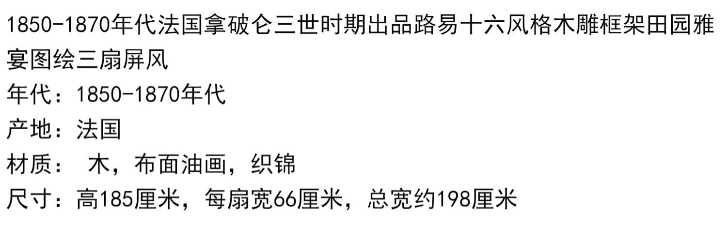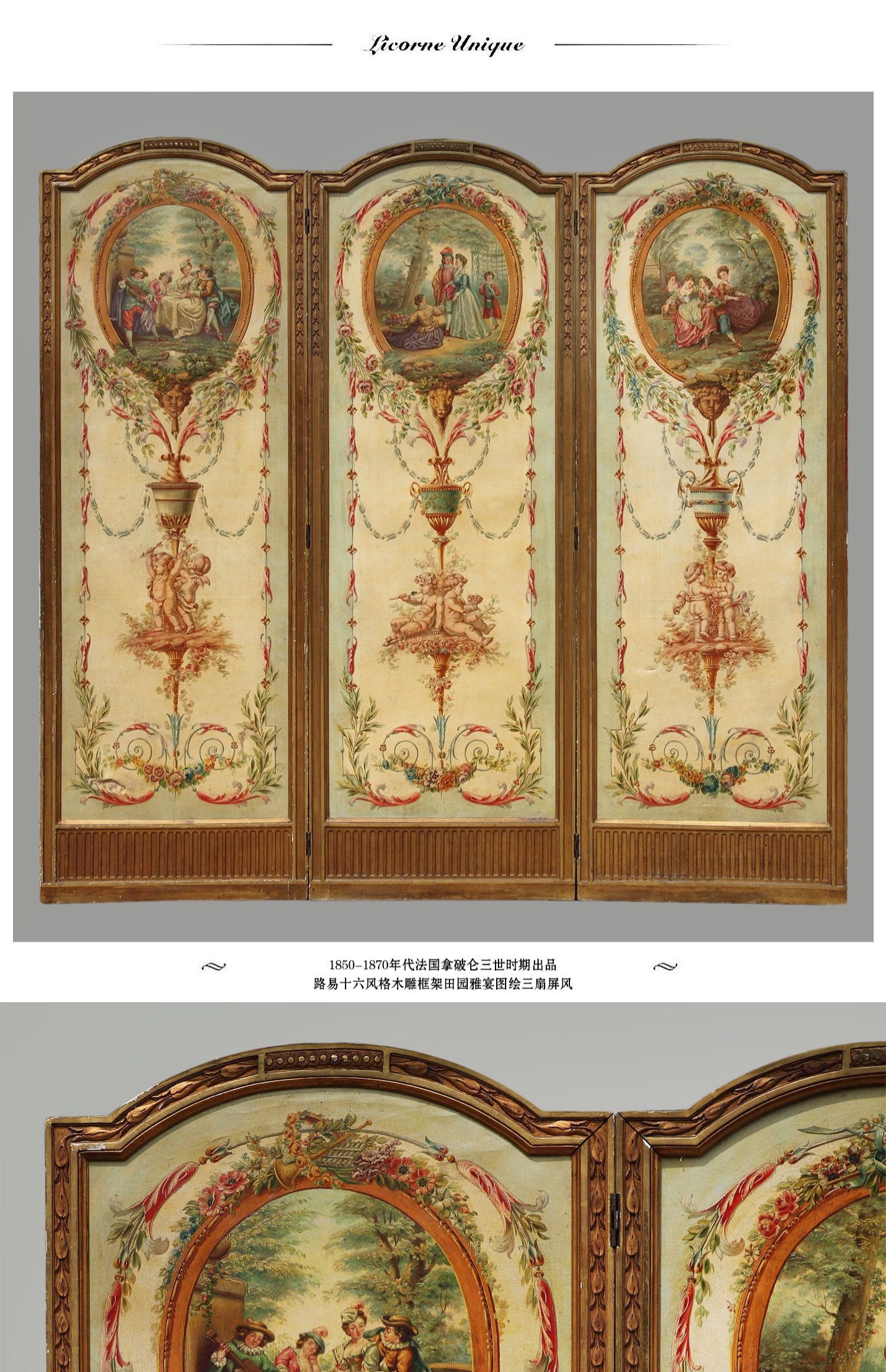 独角鹿西洋古董法国路易十六风格木雕框架田园雅宴图绘三扇屏风