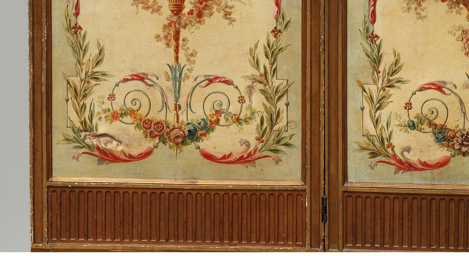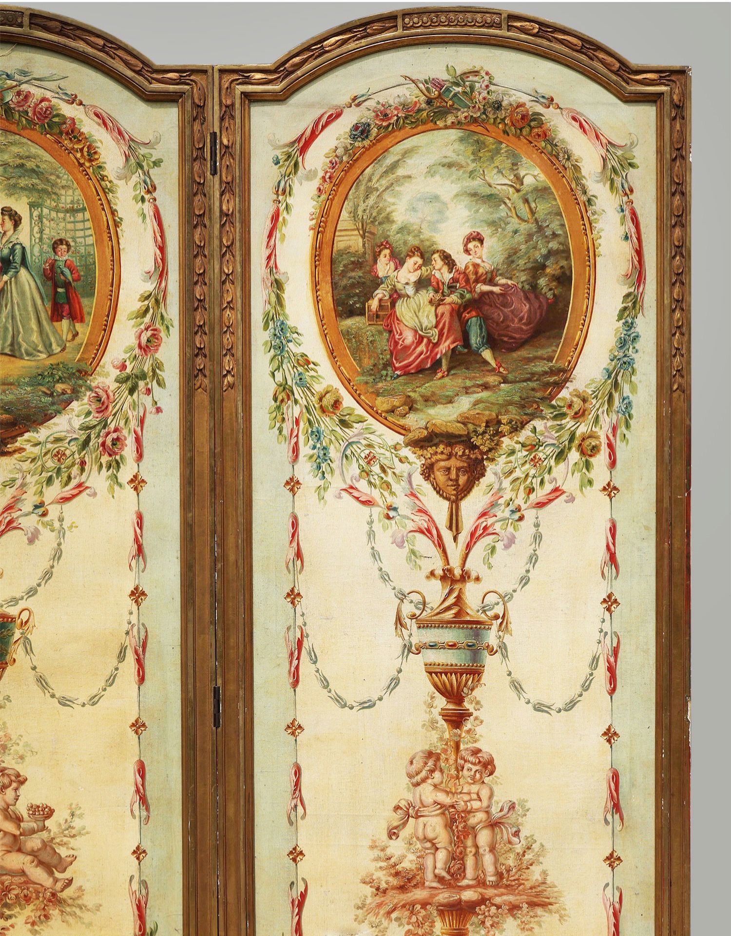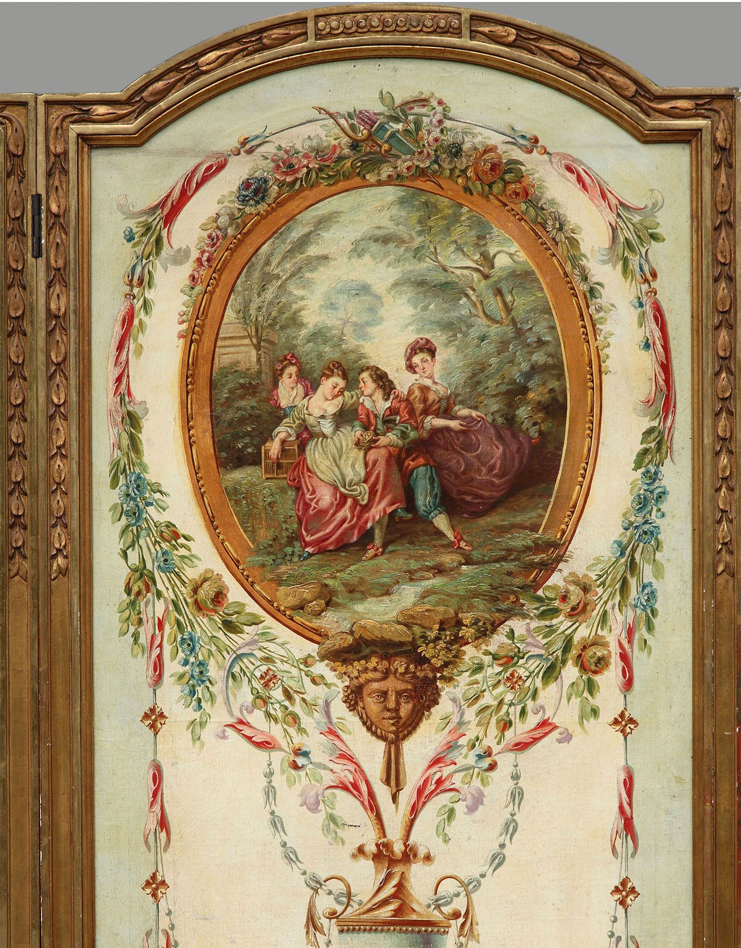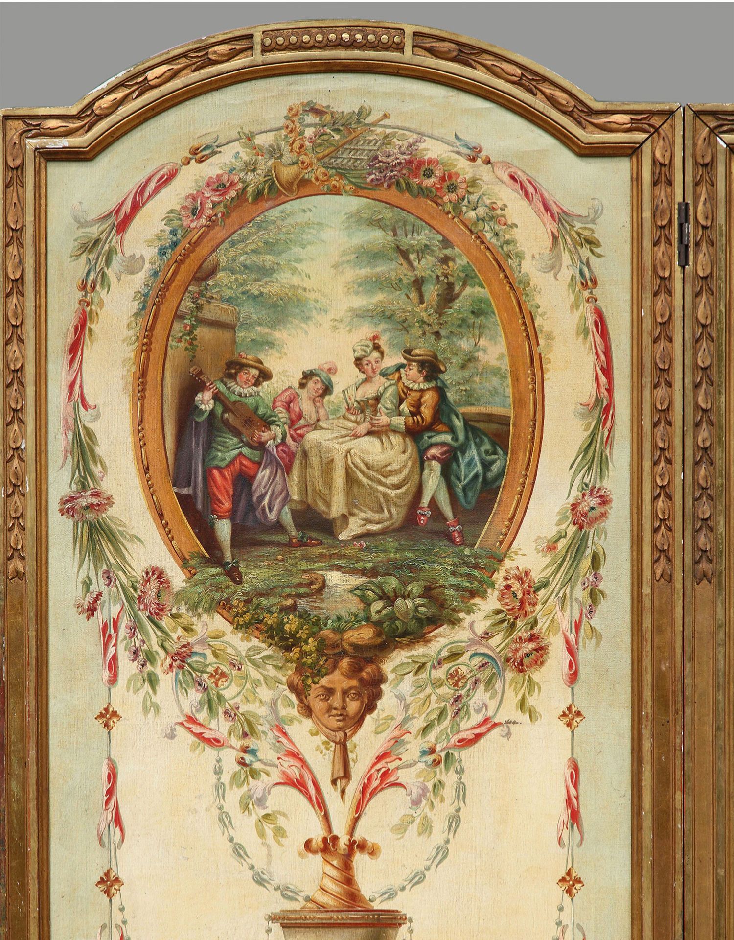 独角鹿西洋古董法国路易十六风格木雕框架田园雅宴图绘三扇屏风