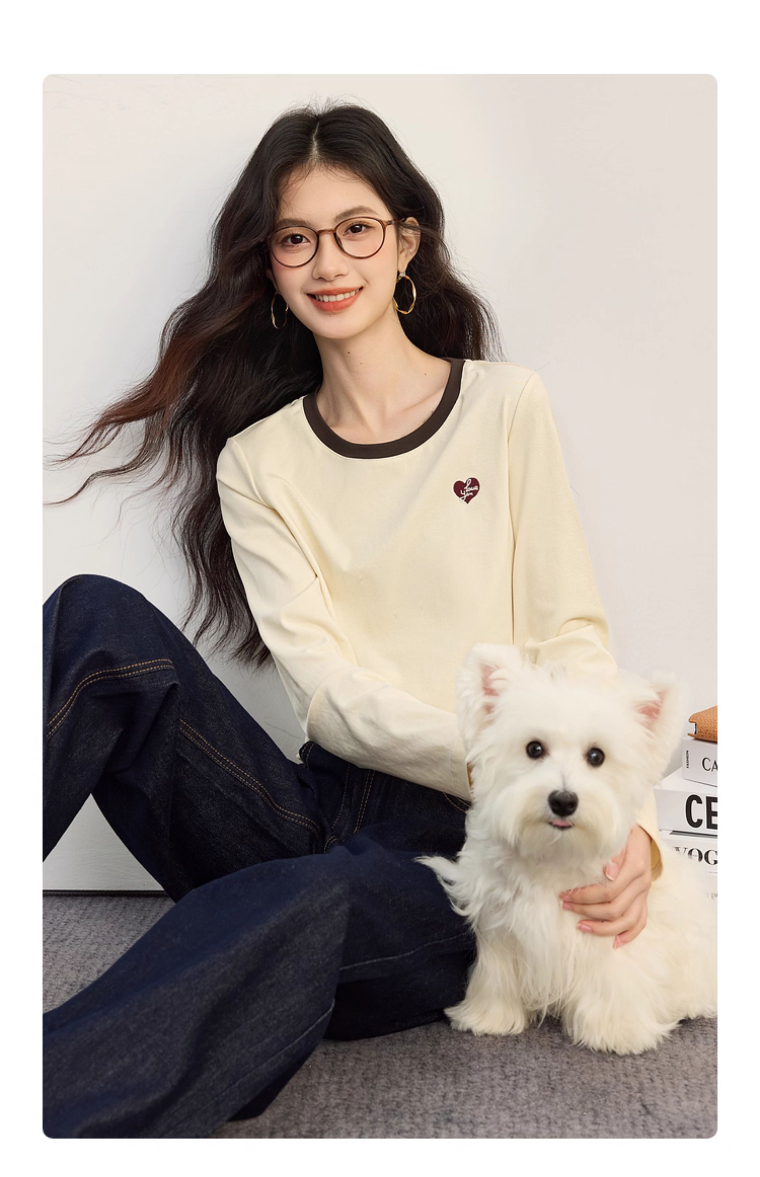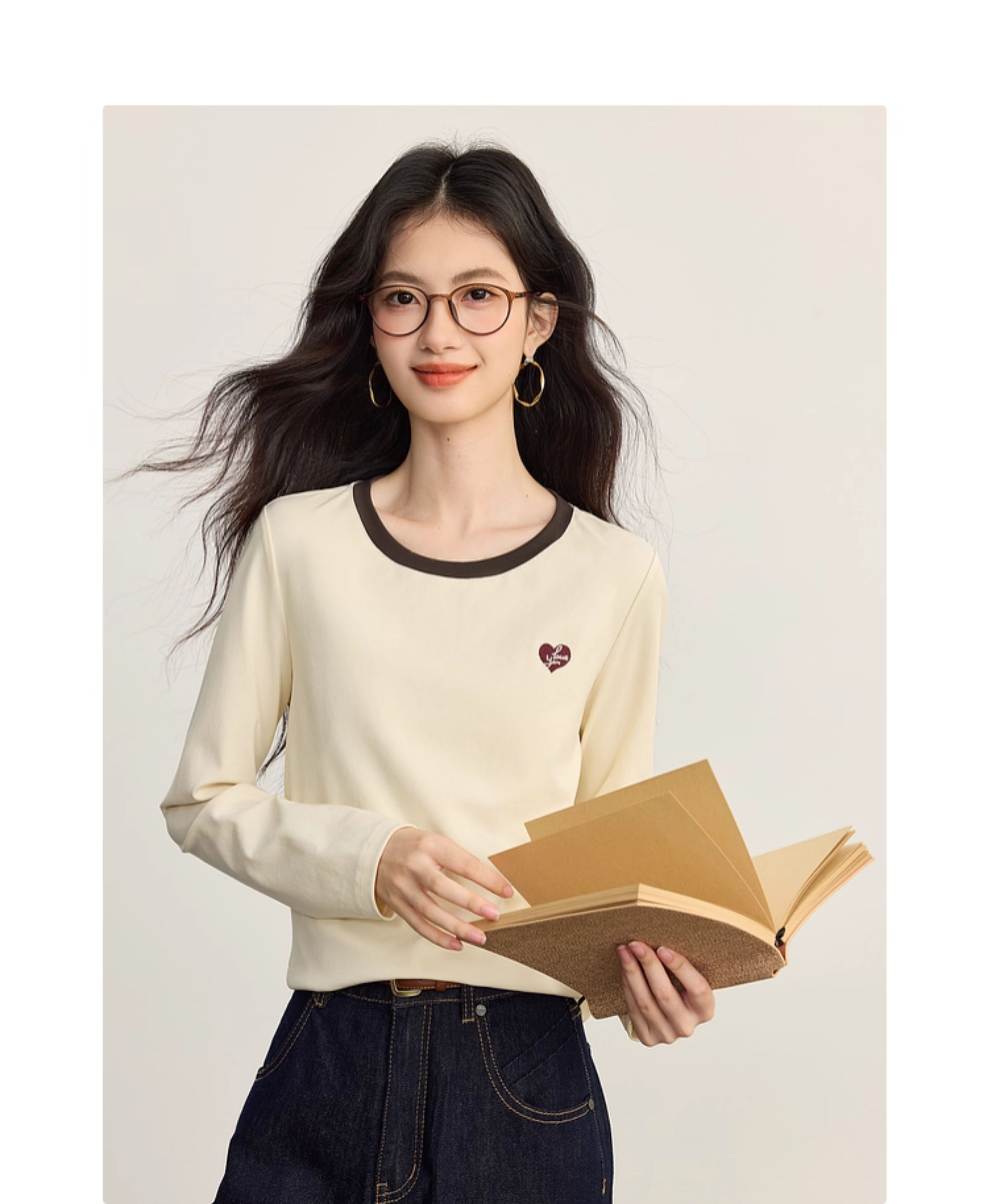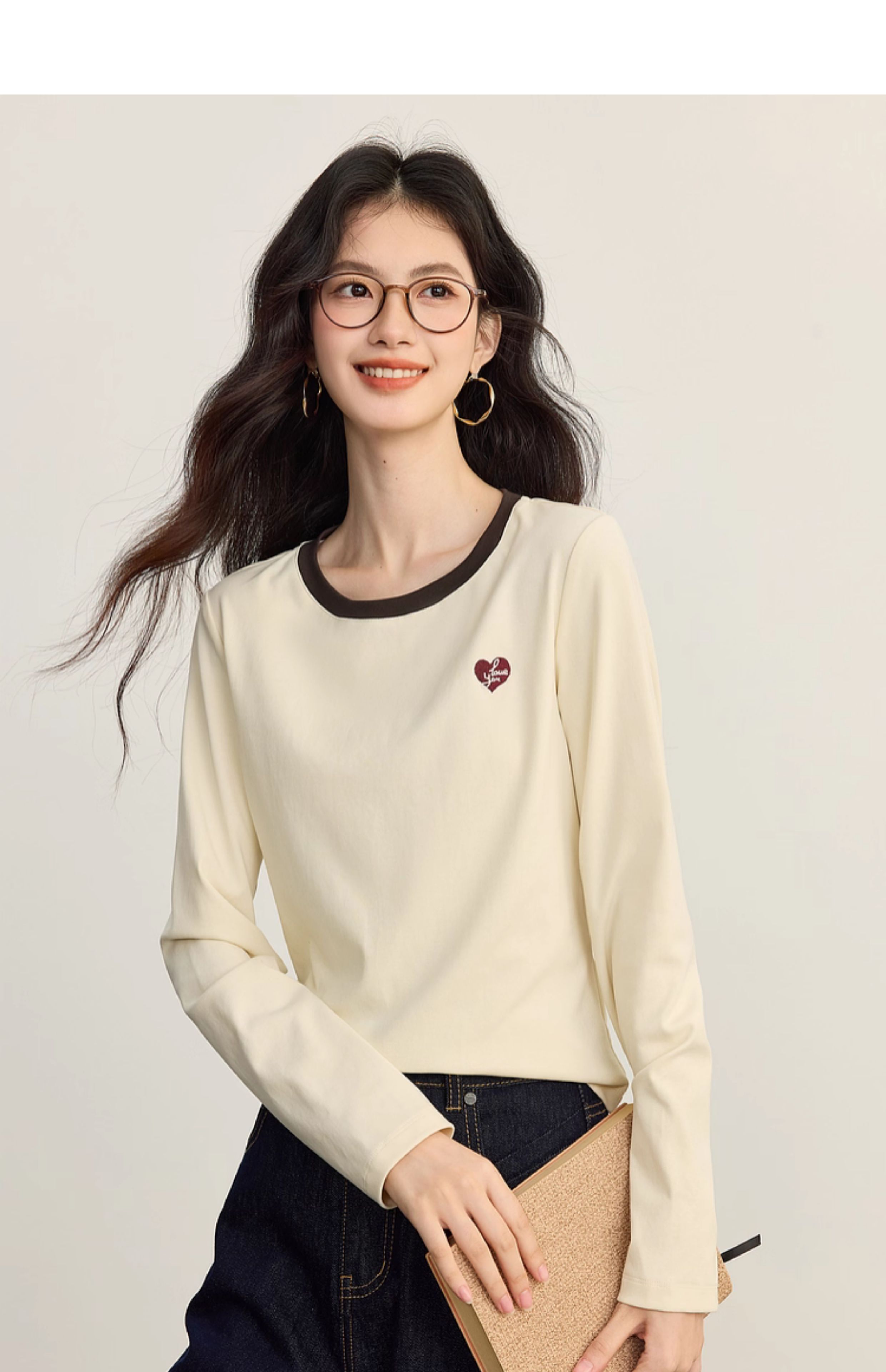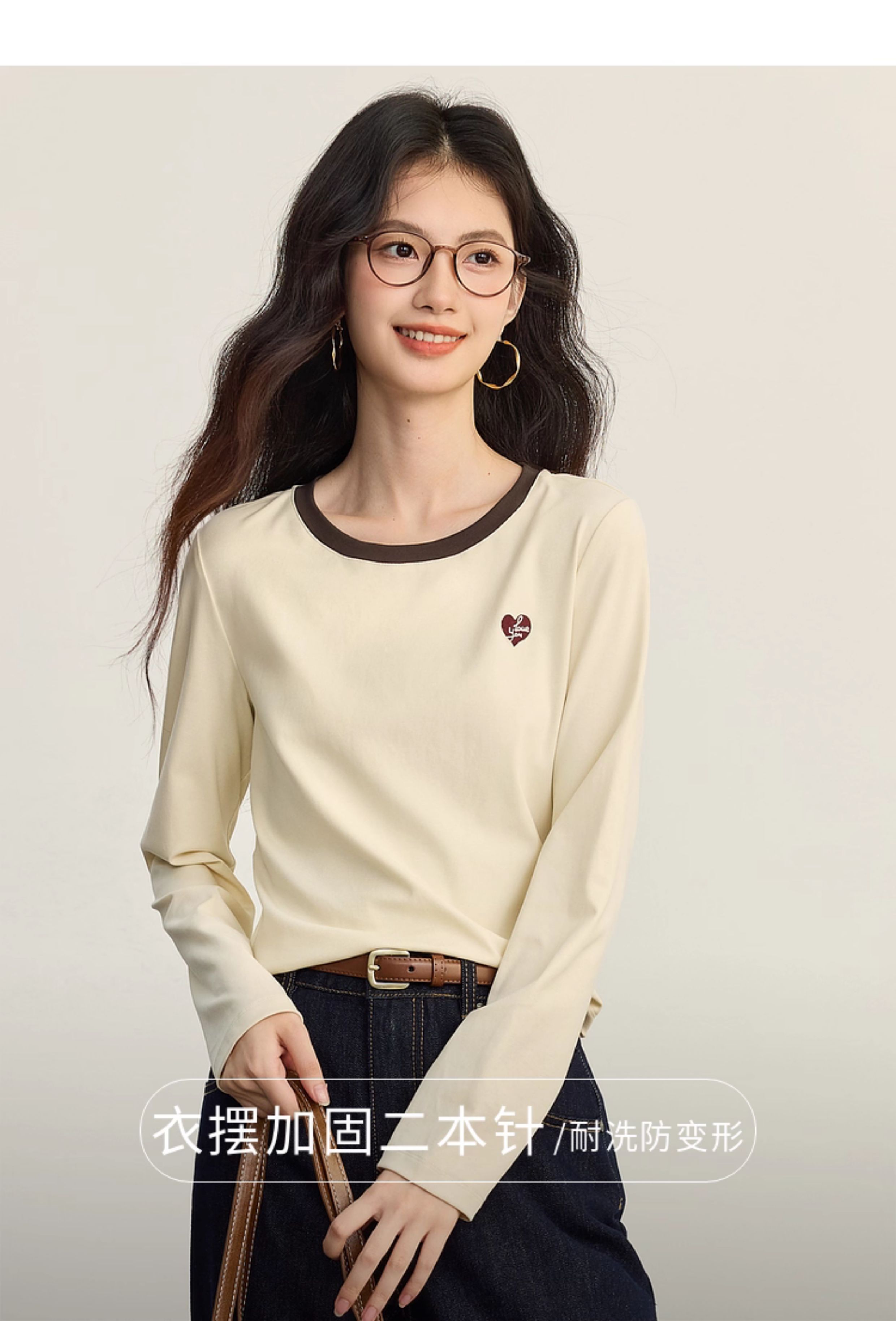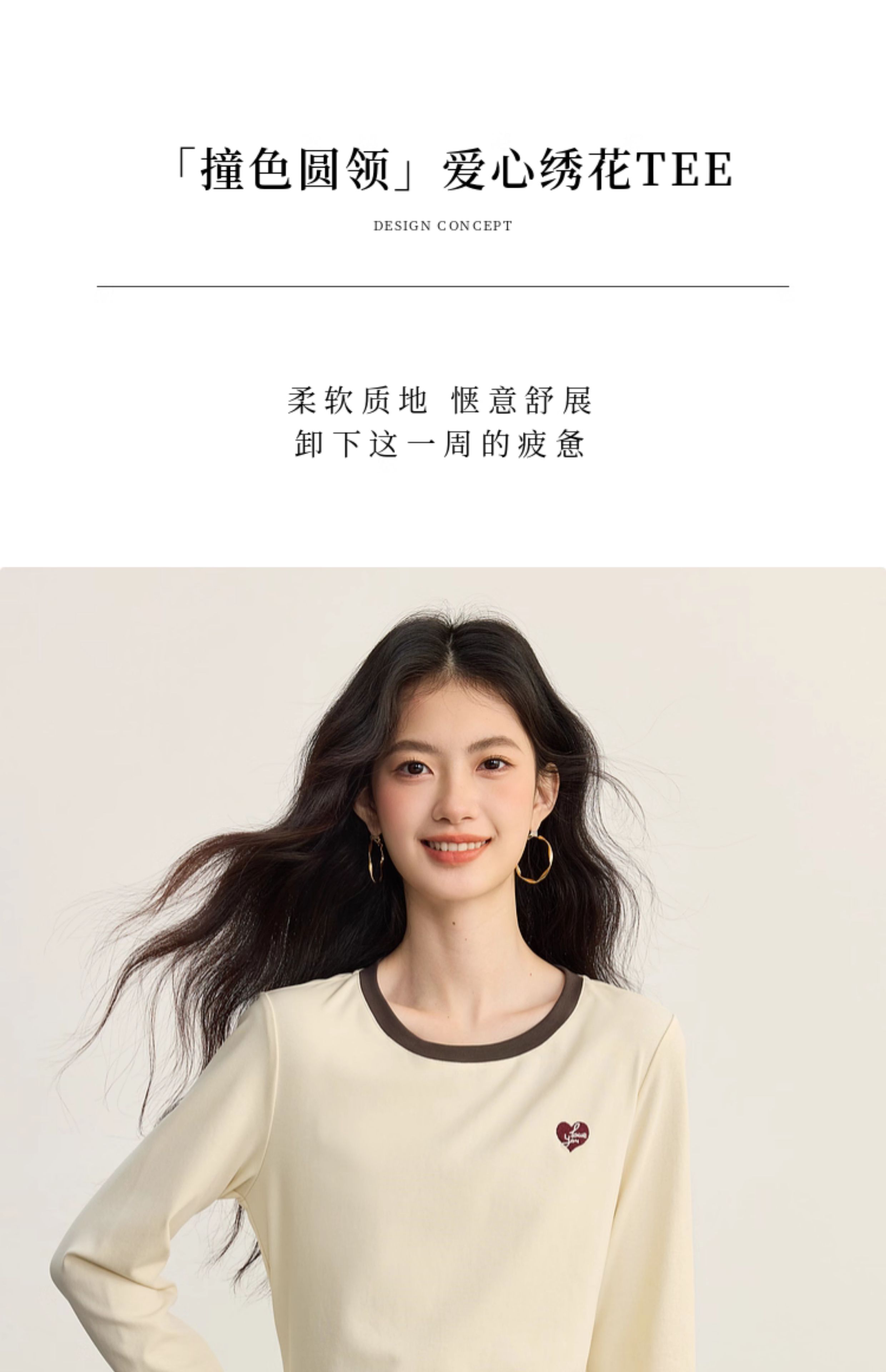 【09/03新品】熙世界可露丽穿搭撞色圆领T恤女士长袖秋季新款爱心刺绣打底上衣