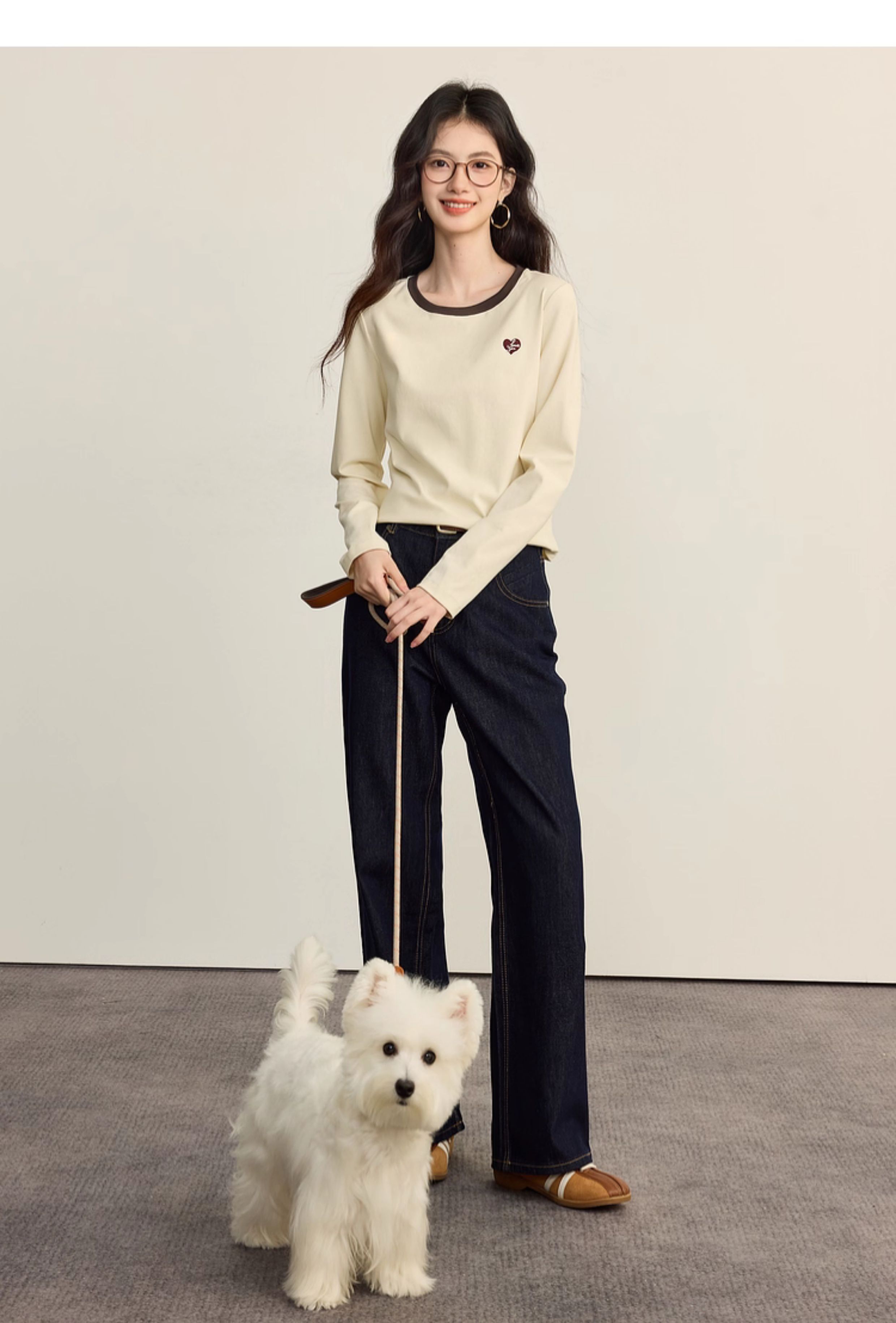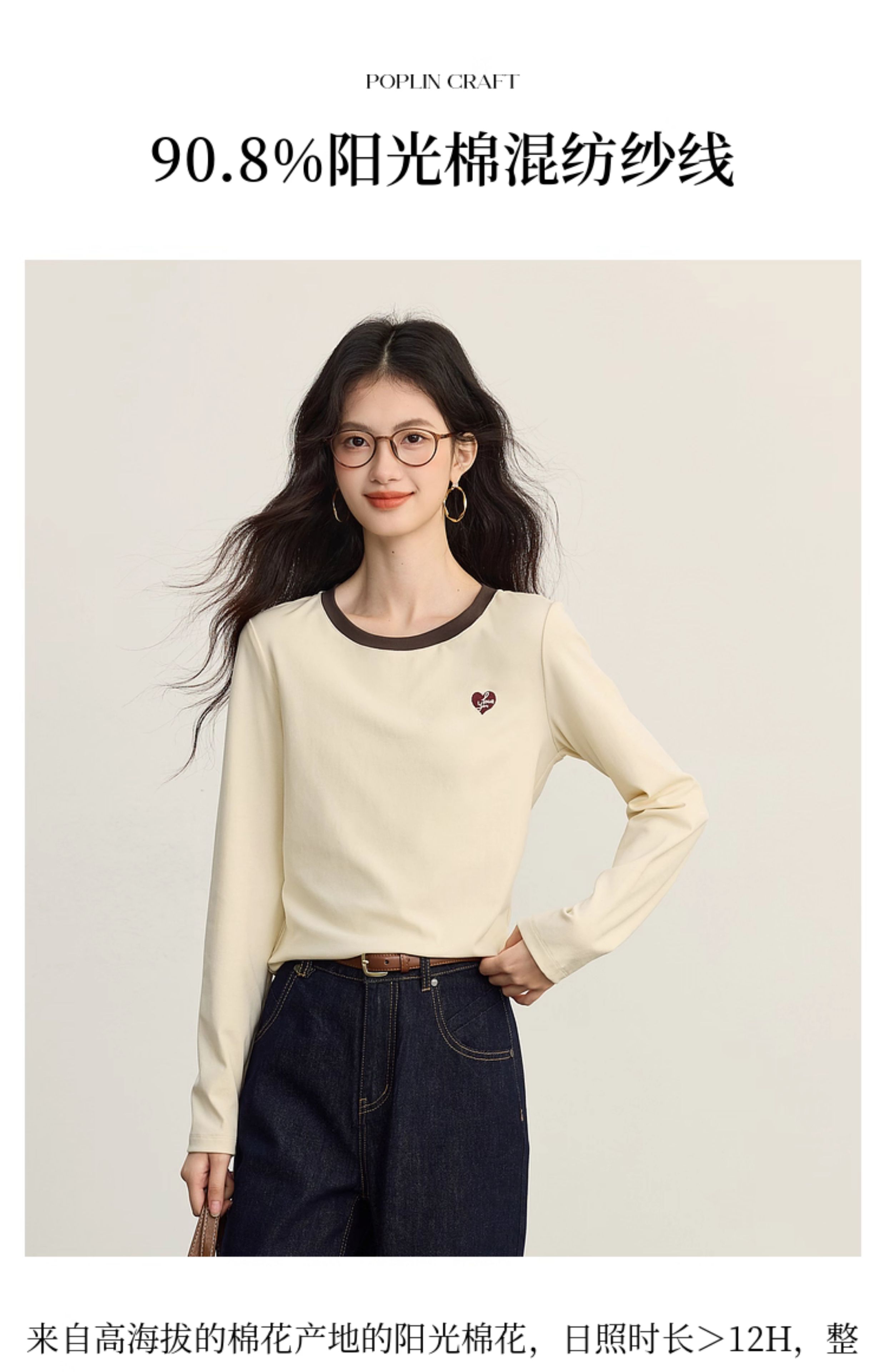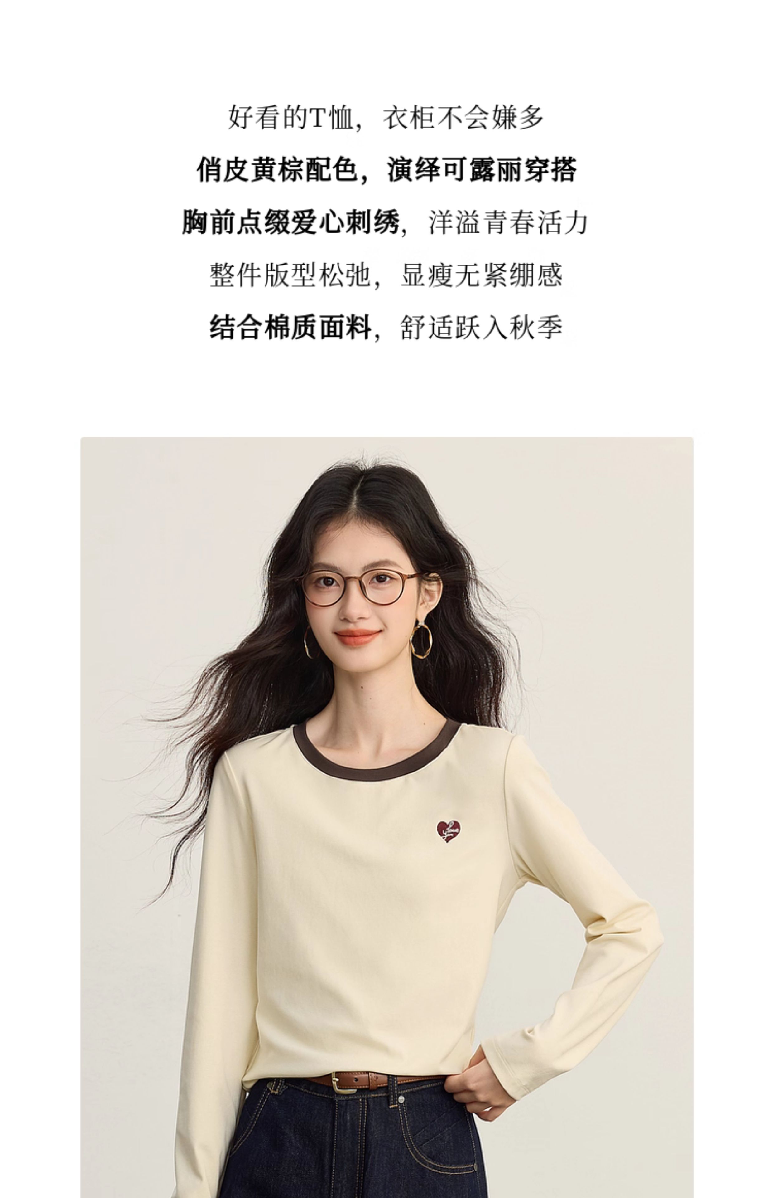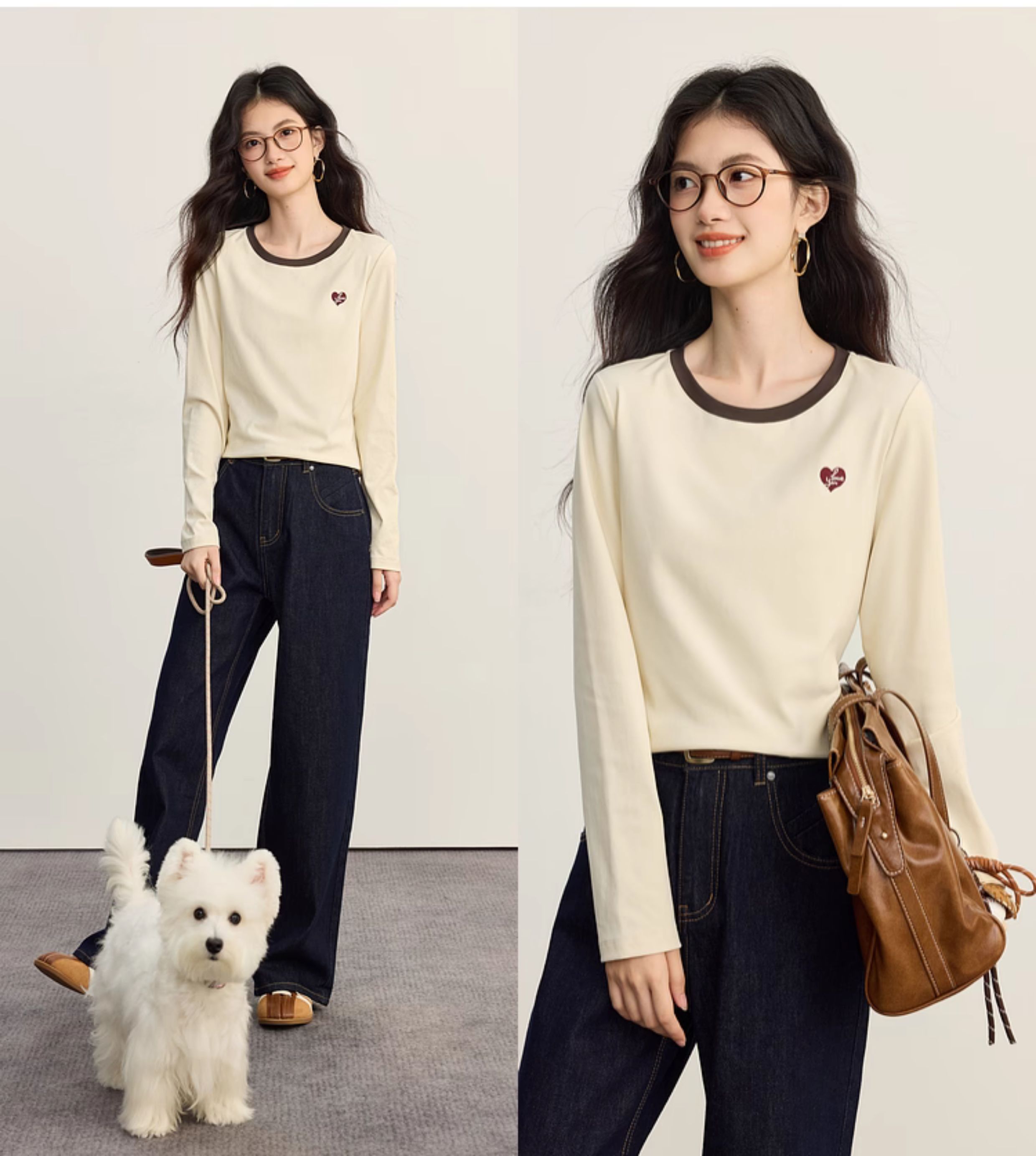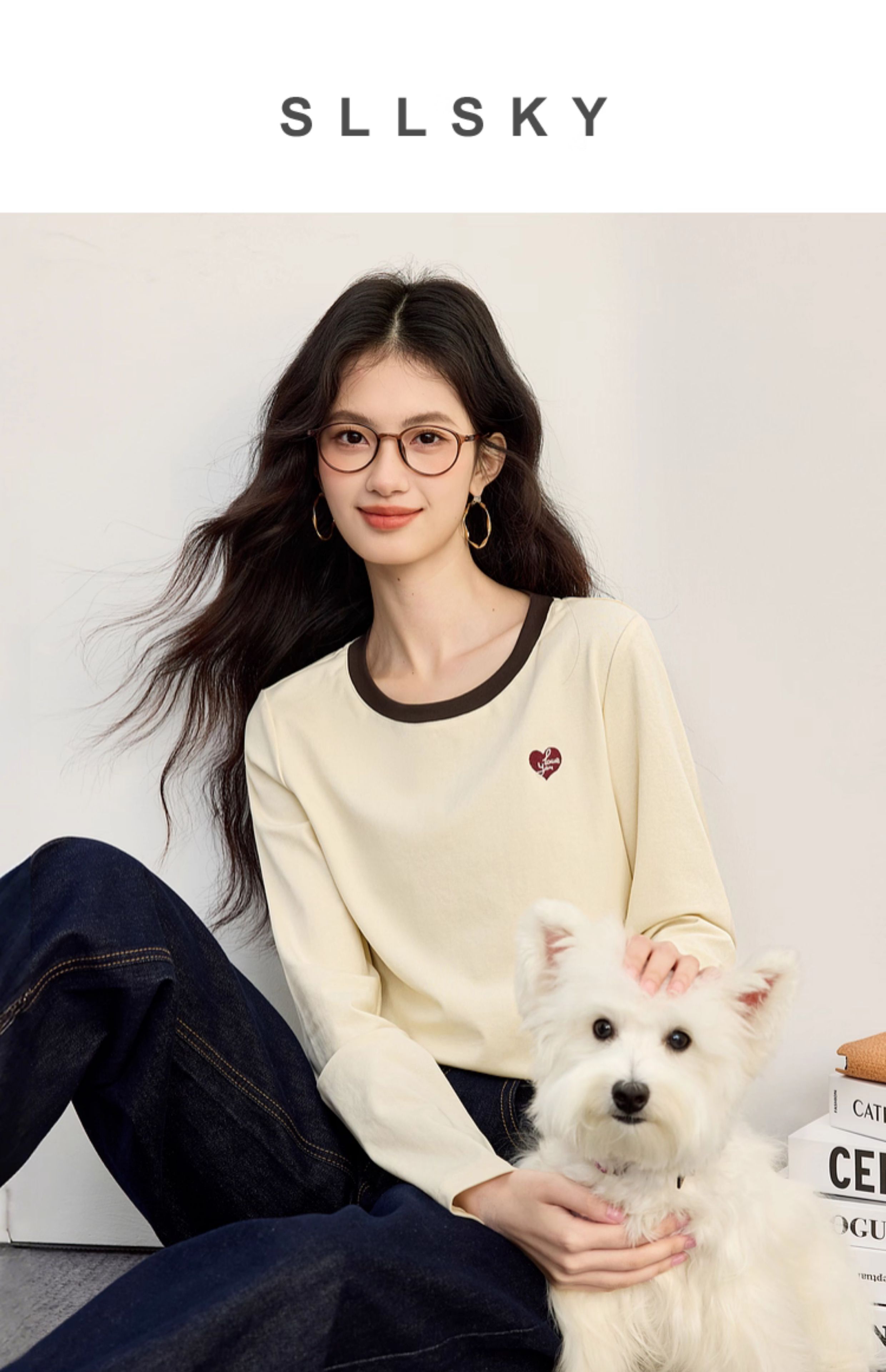【09/03新品】熙世界可露丽穿搭撞色圆领T恤女士长袖秋季新款爱心刺绣打底上衣