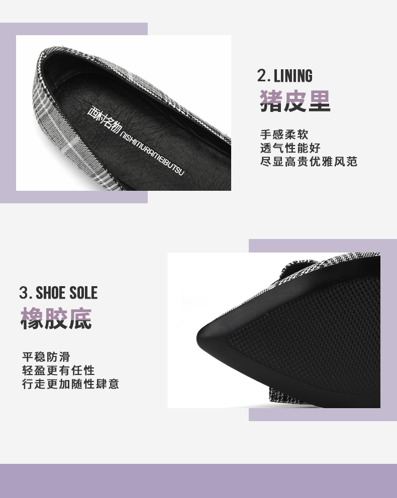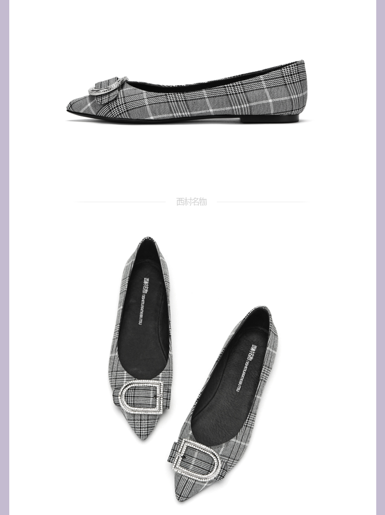 西村名物商场同款新款浅口尖头女鞋舒适一脚蹬格子平底单鞋