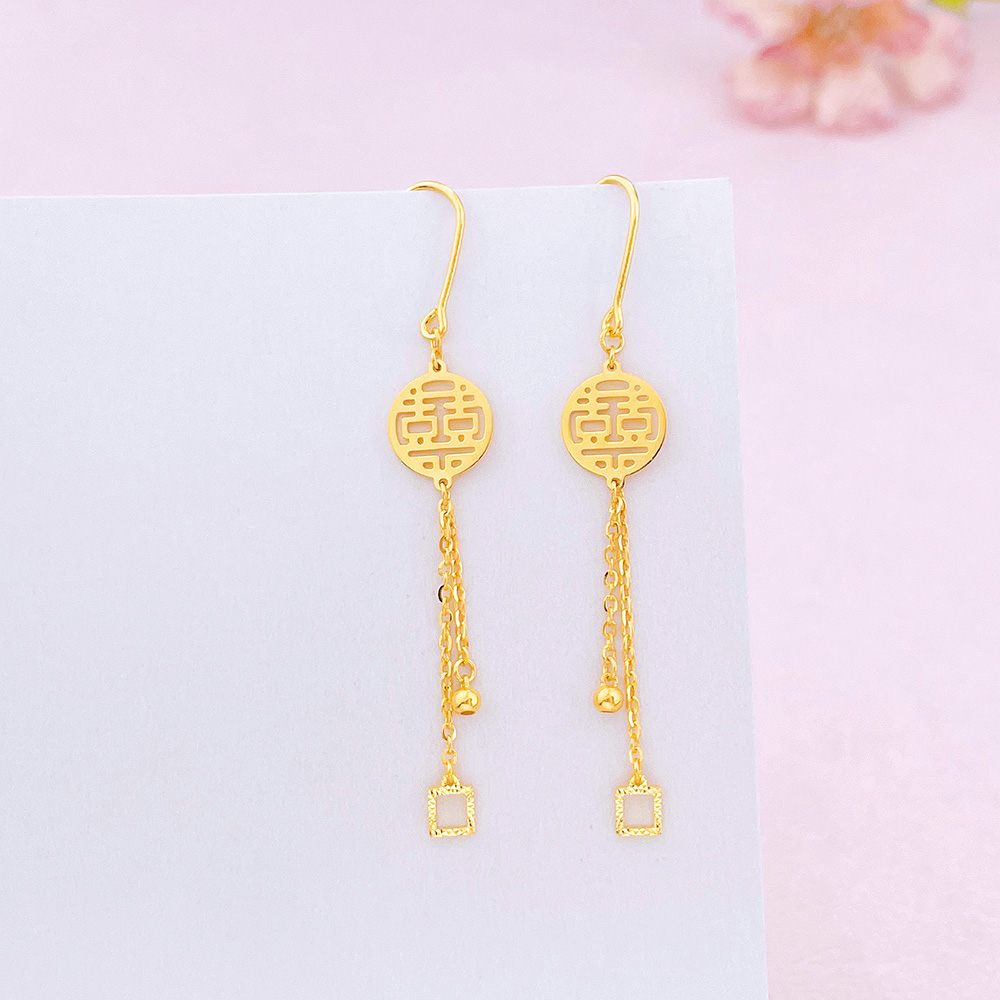 【限时克减150元】足金999.99 #婚庆 【精品】五9黄金耳钩耳吊双喜婚庆耳钩几何方环金珠流苏喜字耳吊(ACES00188)(预售产品下单后不退款不退货不换货不补差价)