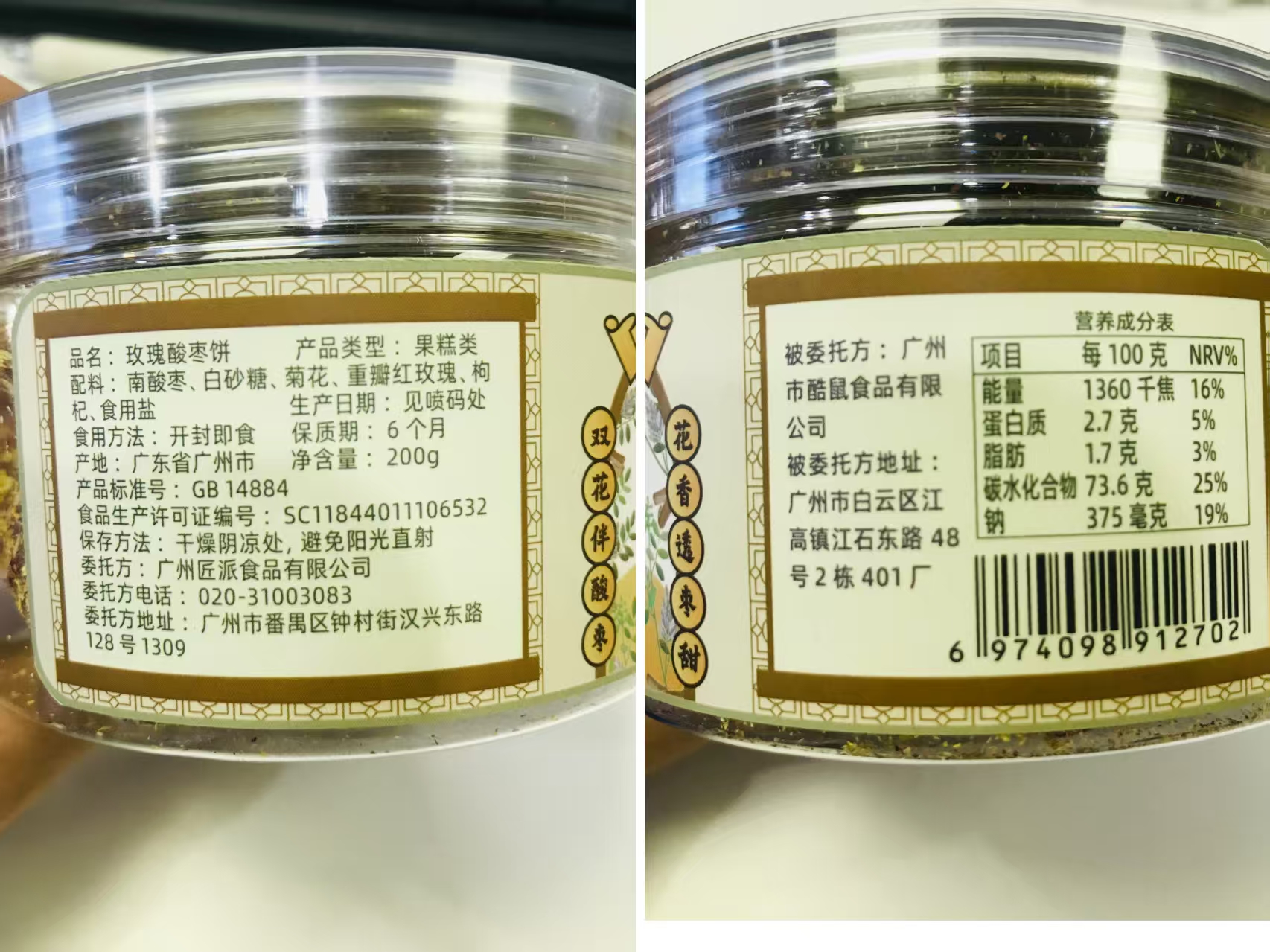 配料表,简单到一目了然:南酸枣、白砂糖、菊花、重瓣红玫瑰、枸杞、食用盐。我们坚决拒绝硫磺熏制、人工色素、合成香精、防腐剂。枣饼体呈现的琥珀色与绯红,全部源于食材本身。我们坚信,至简,方得至真.真正的美味,无需修饰;真正的健康,源于纯粹。