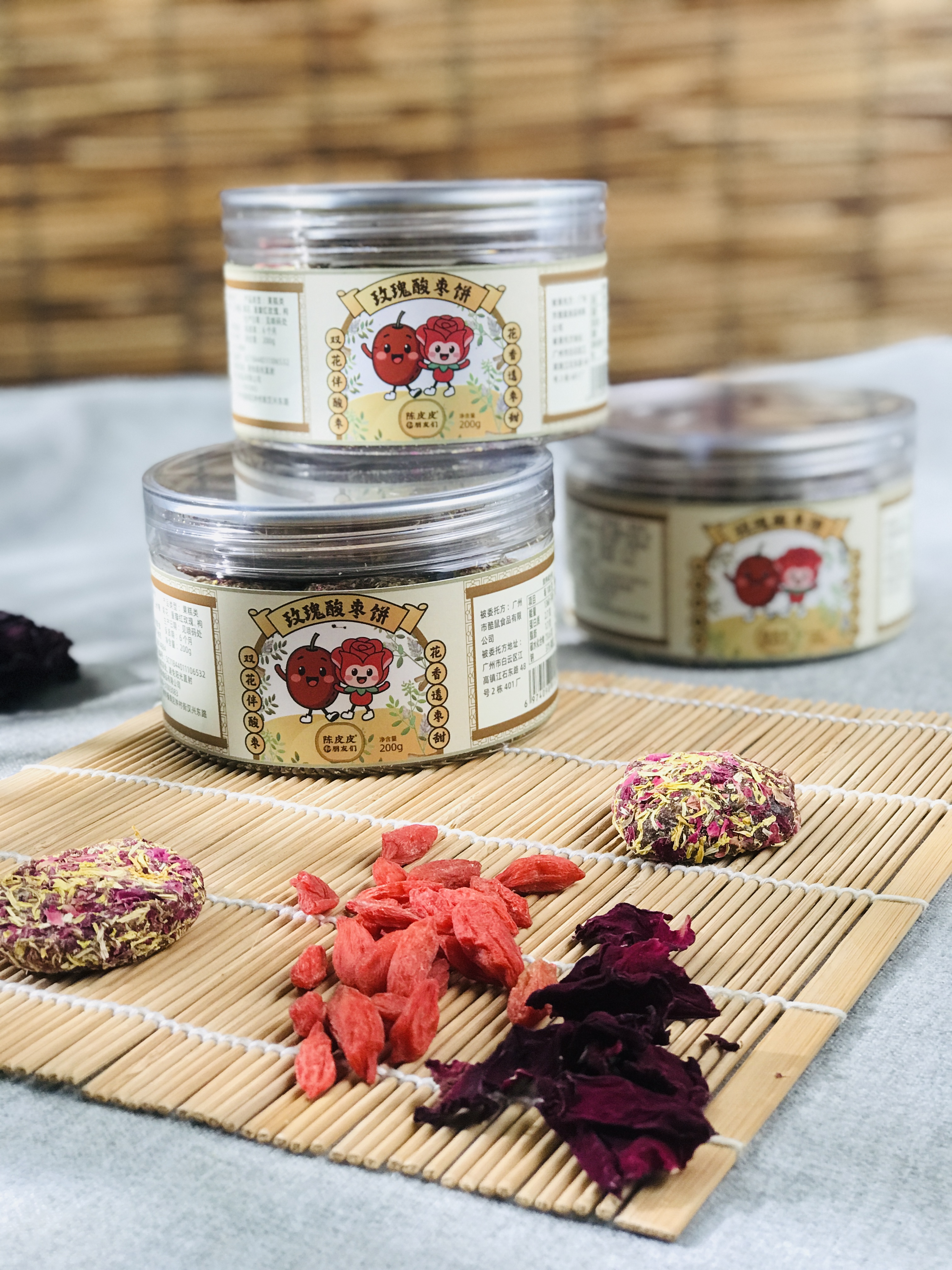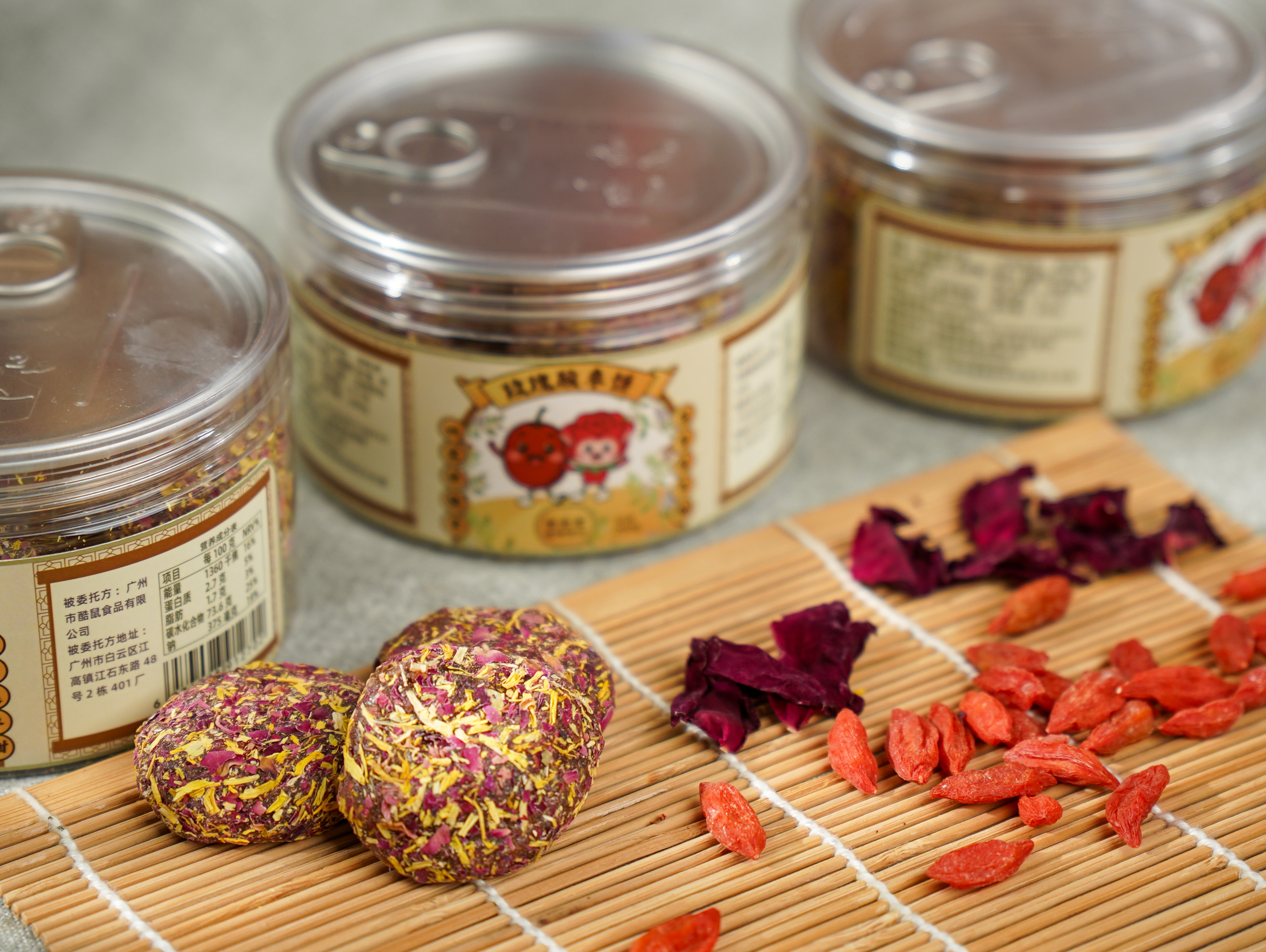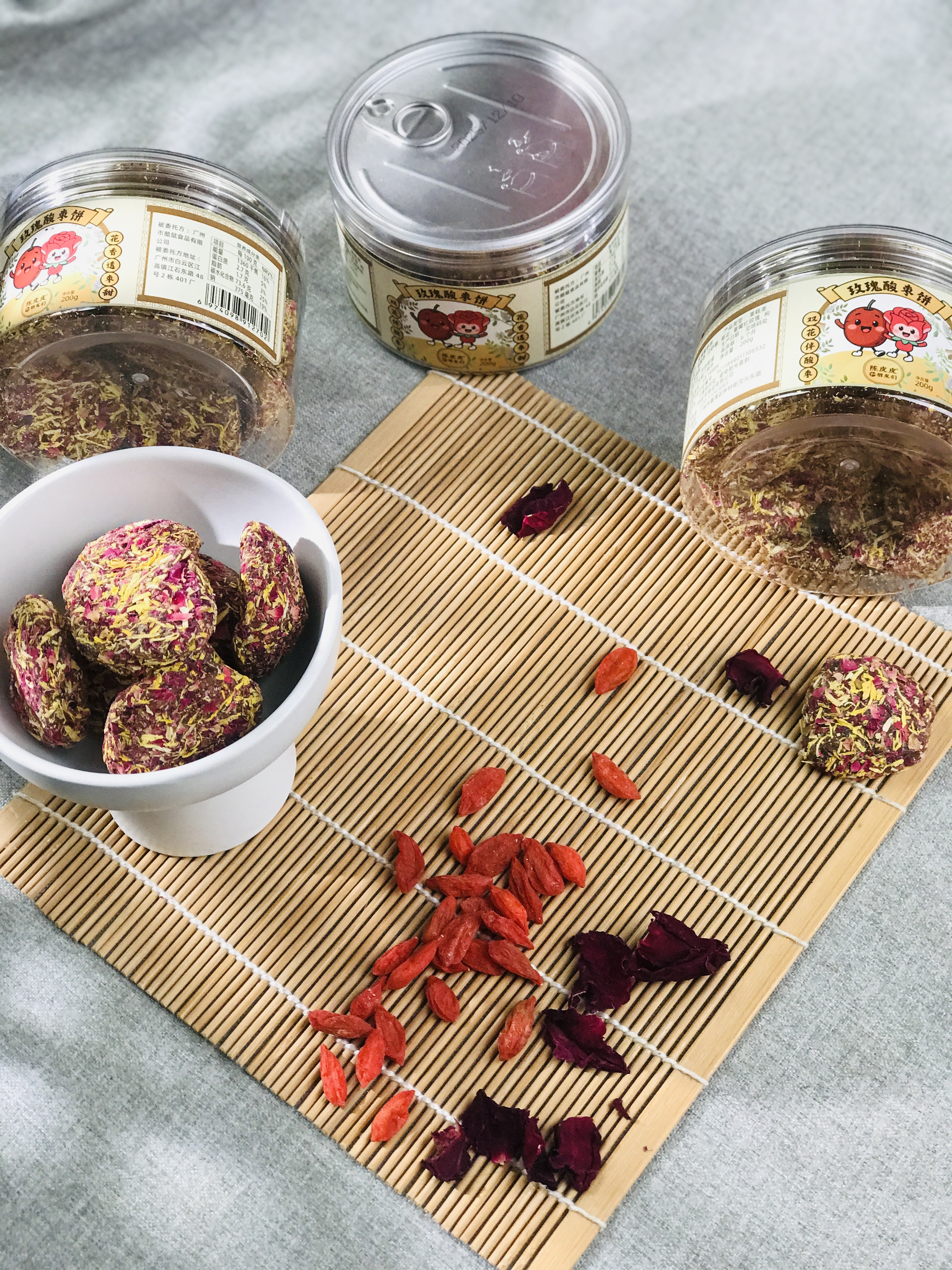 如果说云南的酸枣是这块饼的灵魂,那么包裹其外的云南重瓣玫瑰、安徽黄山的金丝皇菊花,与融入枣饼里面的宁夏枸杞,那便是为其注入了这块饼的自然甘甜。