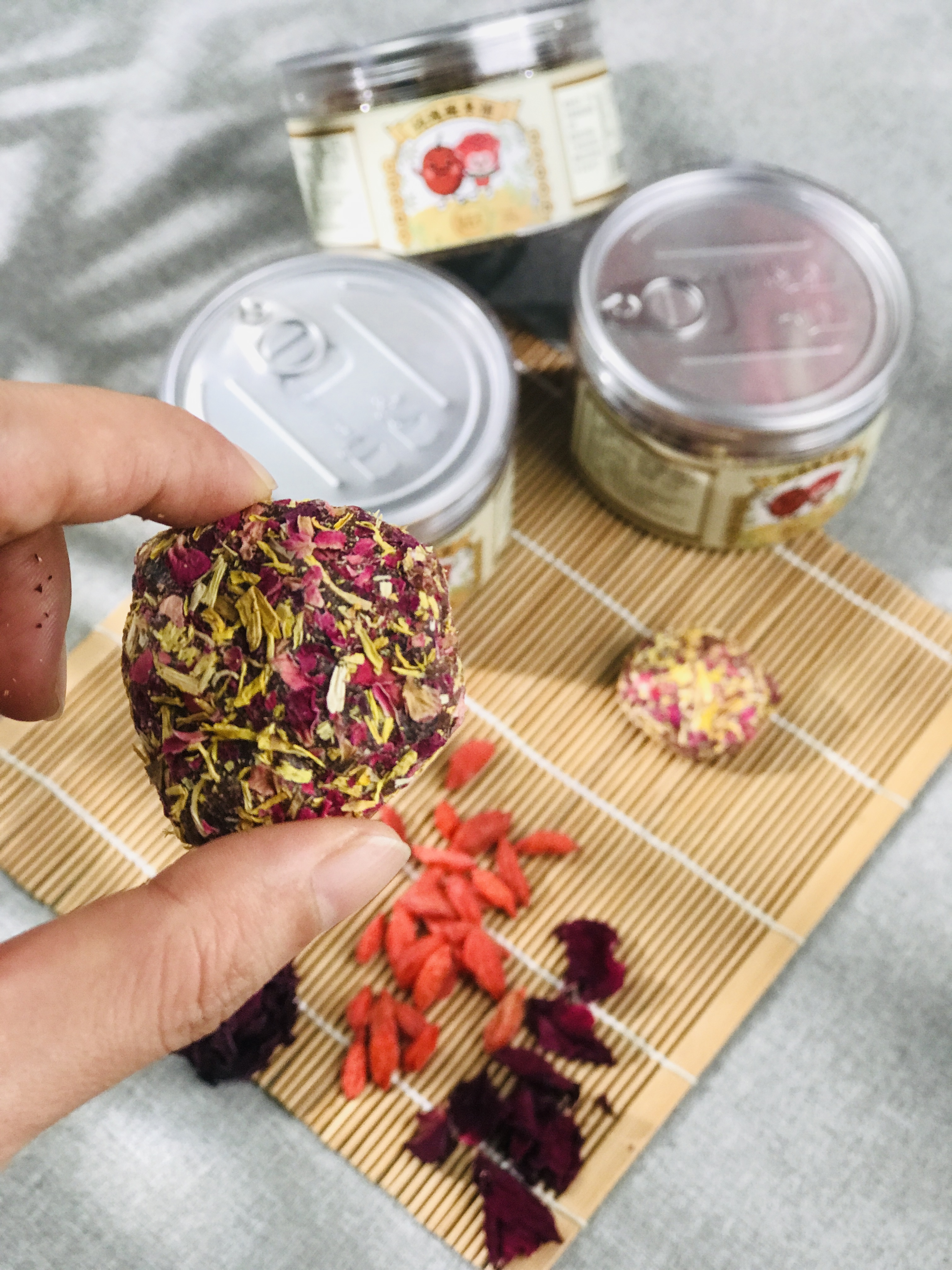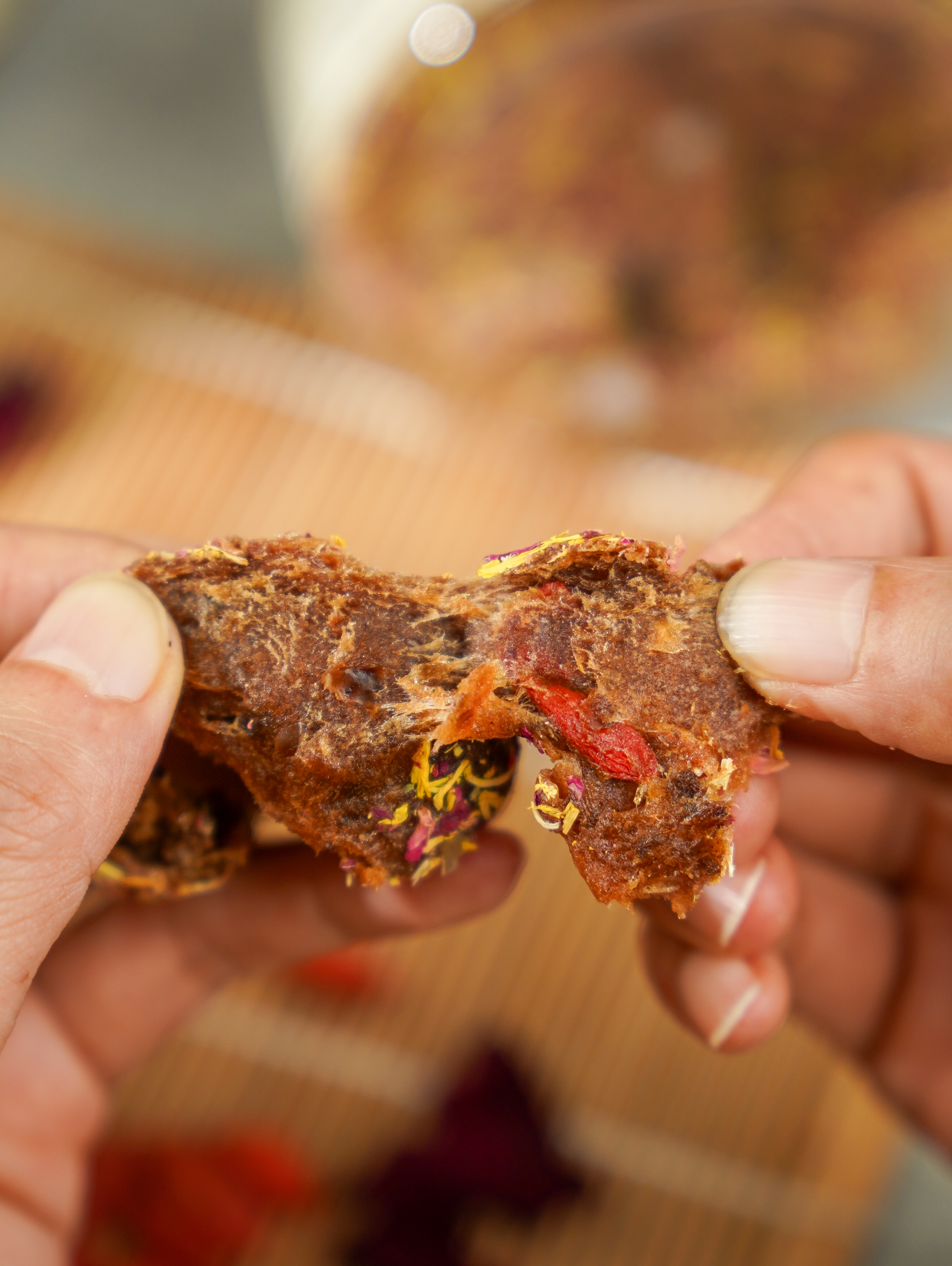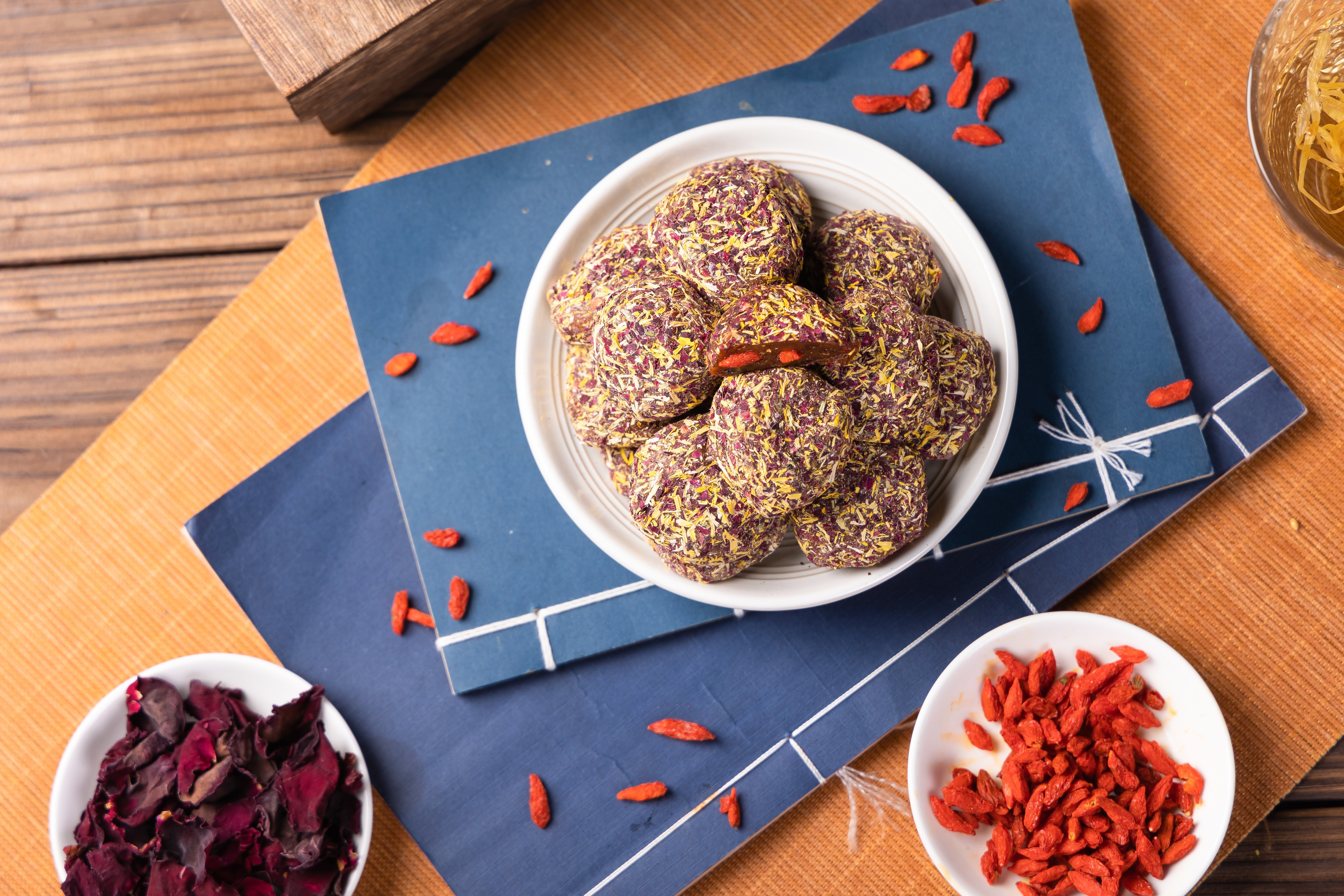 如果说云南的酸枣是这块饼的灵魂,那么包裹其外的云南重瓣玫瑰、安徽黄山的金丝皇菊花,与融入枣饼里面的宁夏枸杞,那便是为其注入了这块饼的自然甘甜。