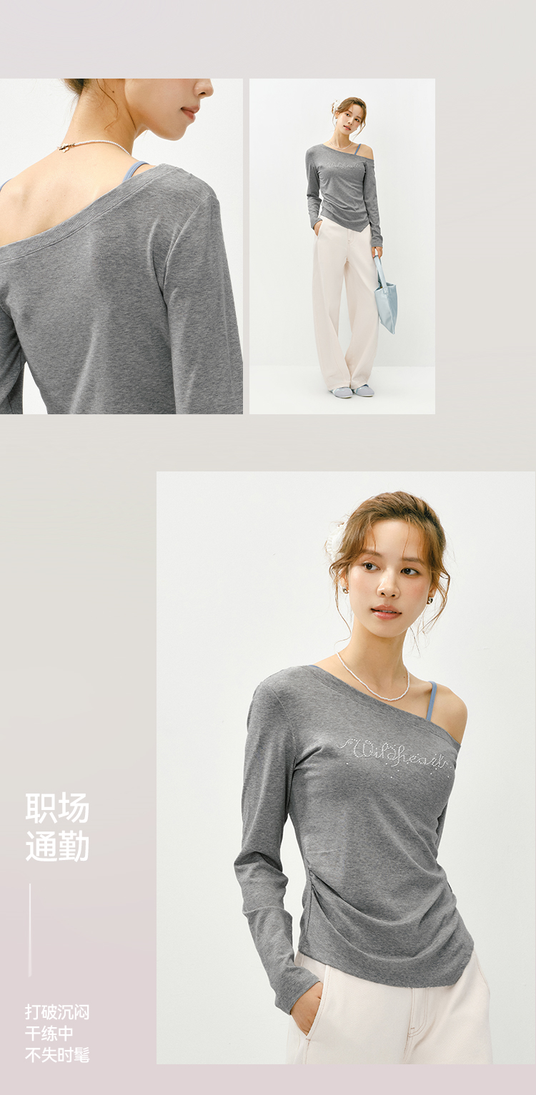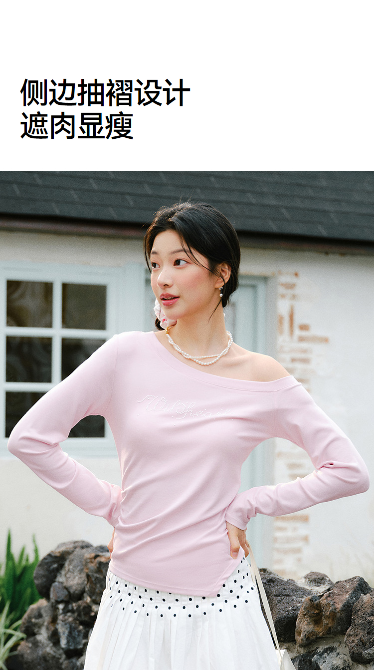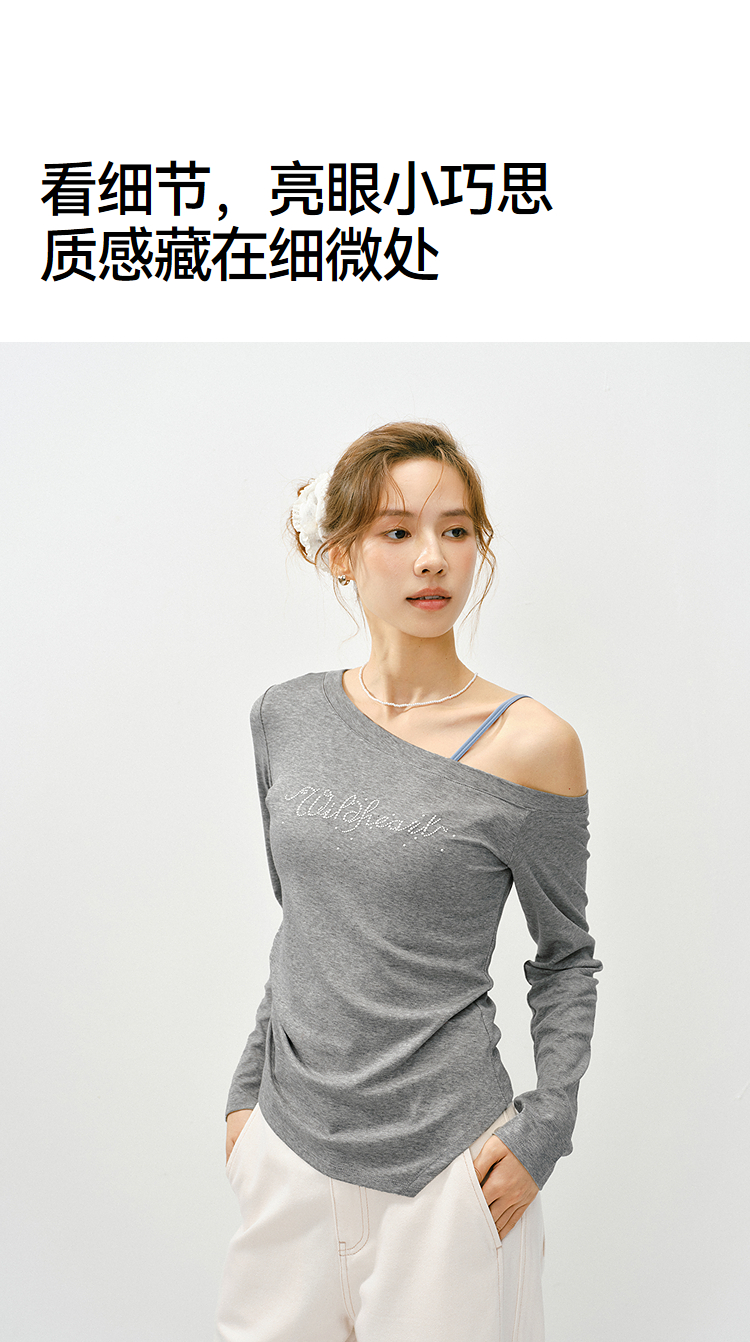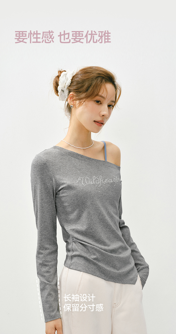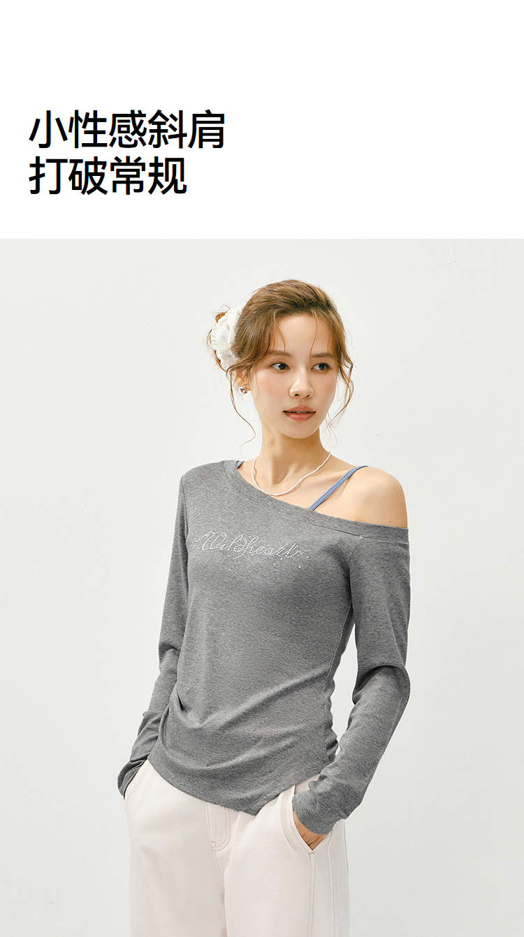 森马长袖T恤女春短款斜肩露肩字母紧身2026新款小性感设计感上衣