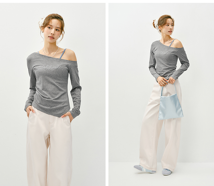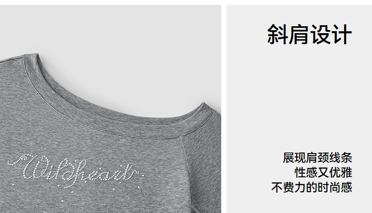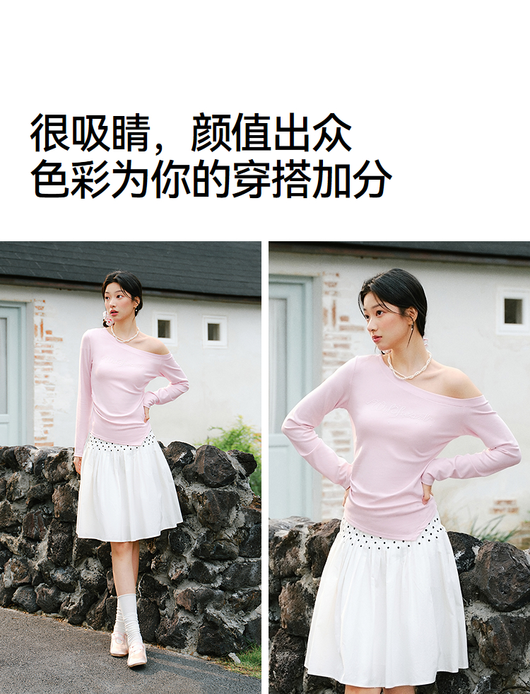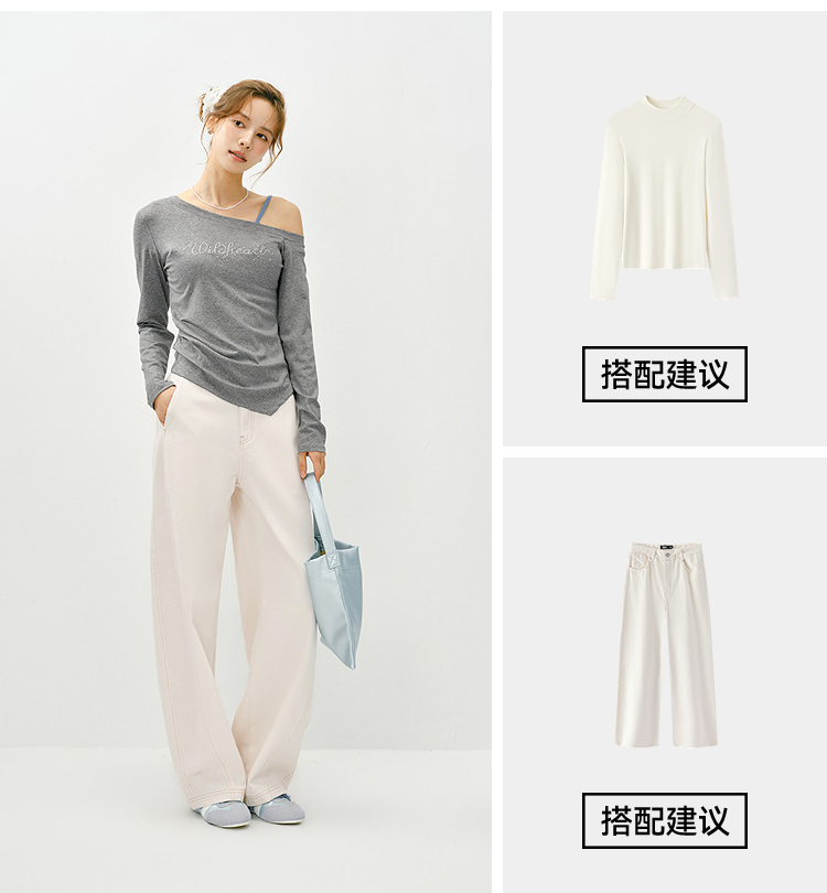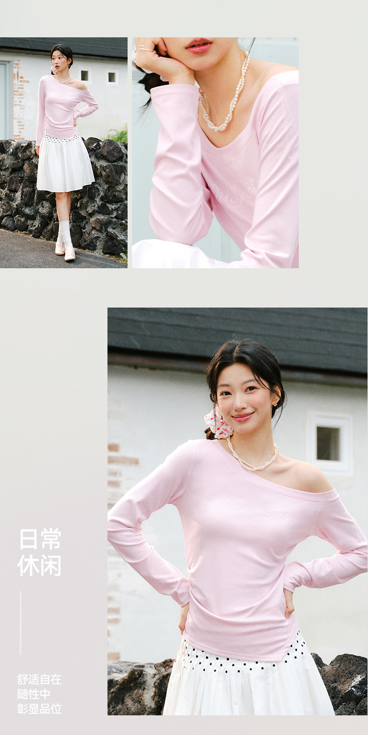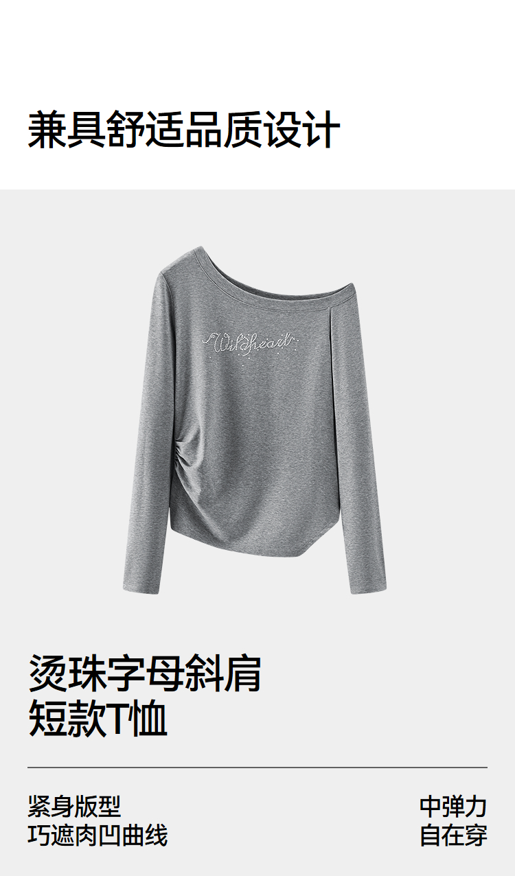 森马长袖T恤女春短款斜肩露肩字母紧身2026新款小性感设计感上衣