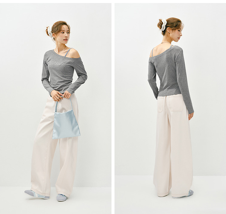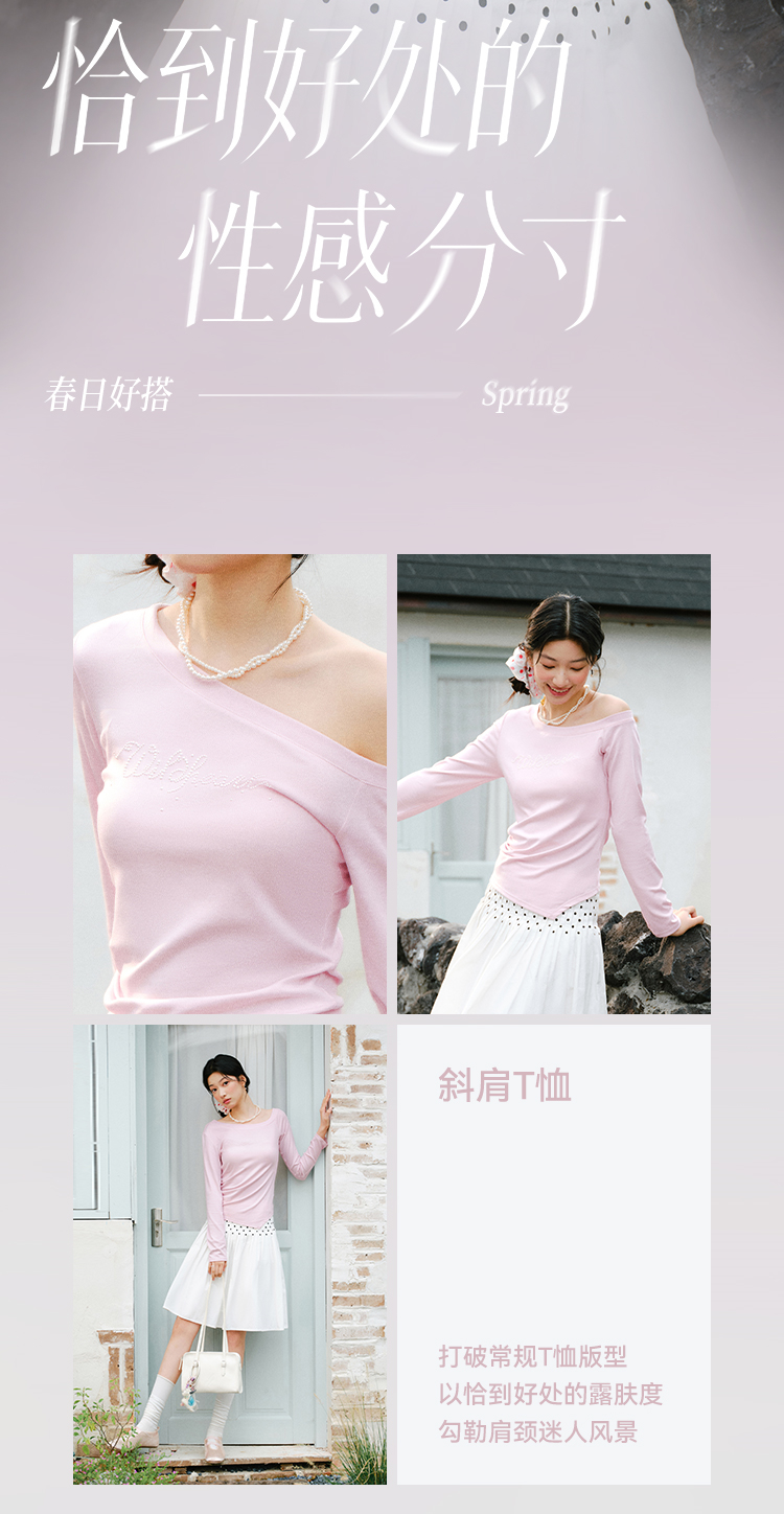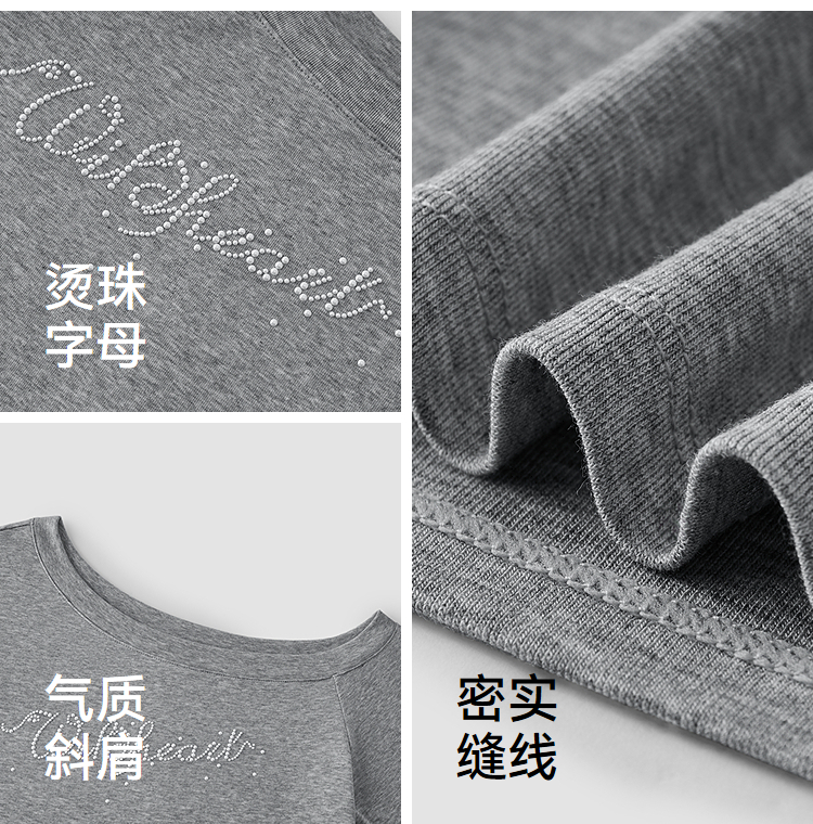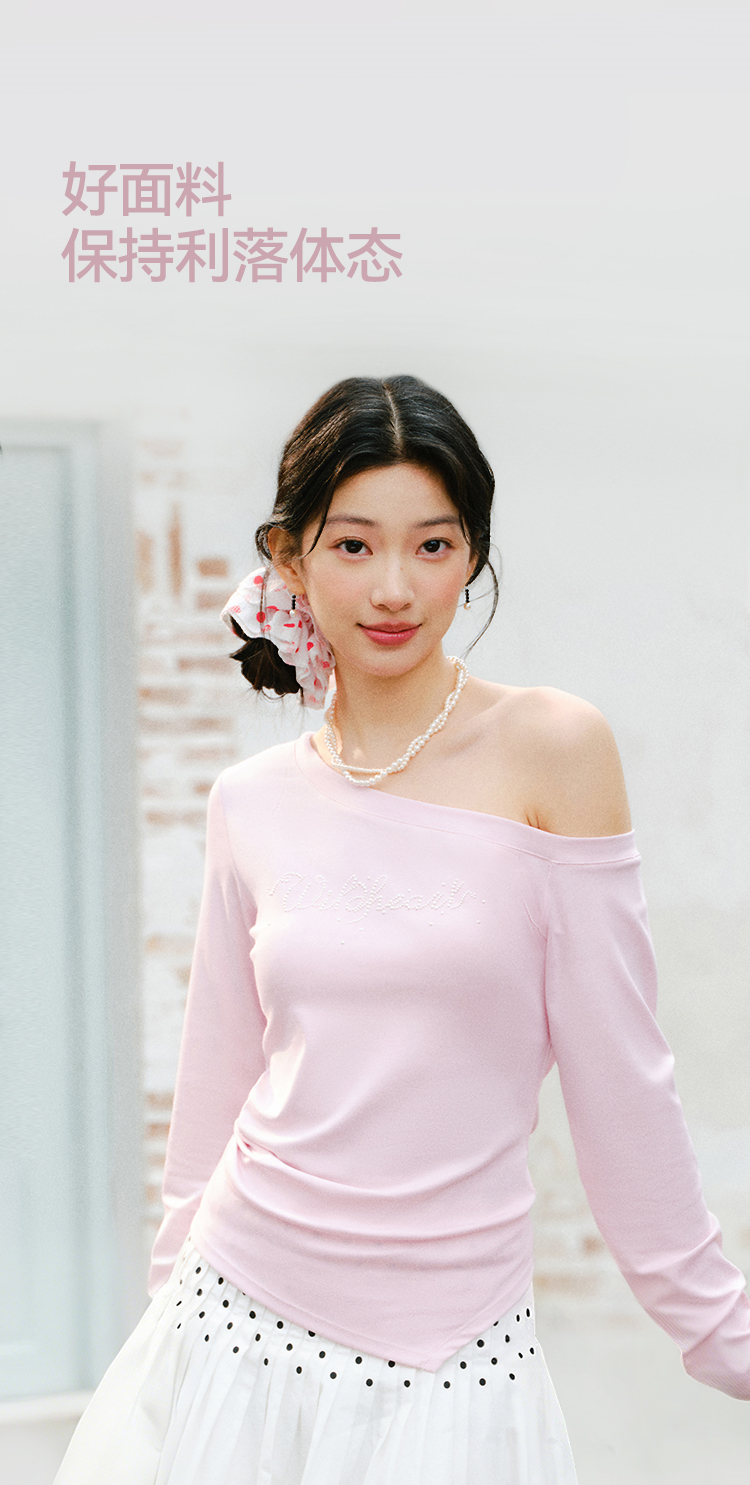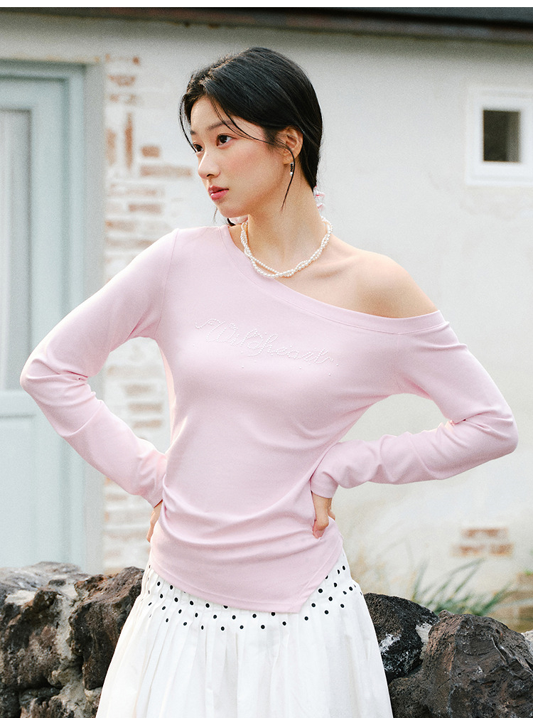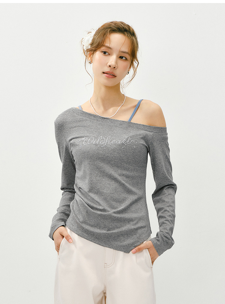 森马长袖T恤女春短款斜肩露肩字母紧身2026新款小性感设计感上衣