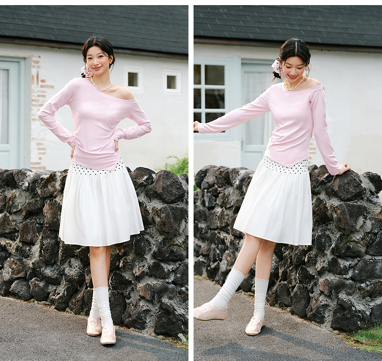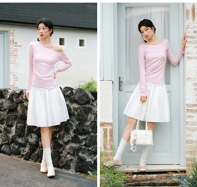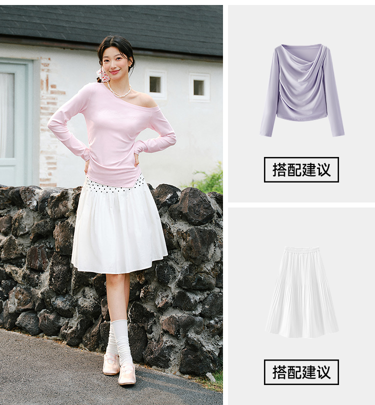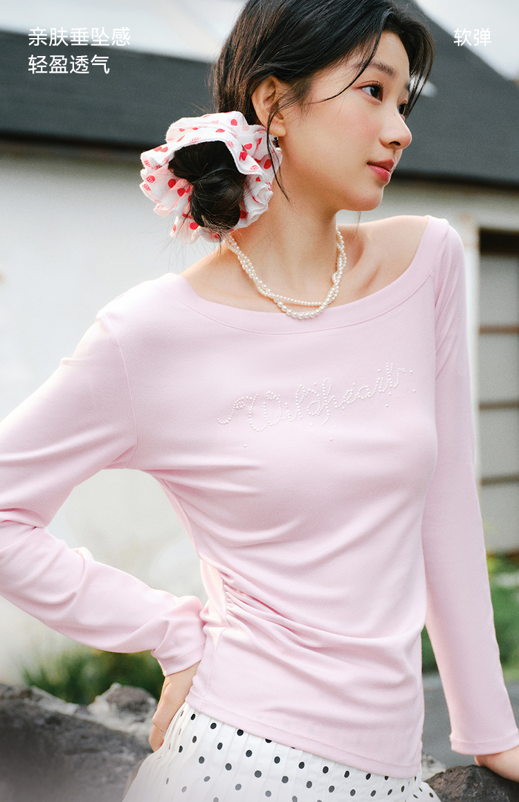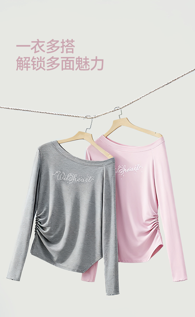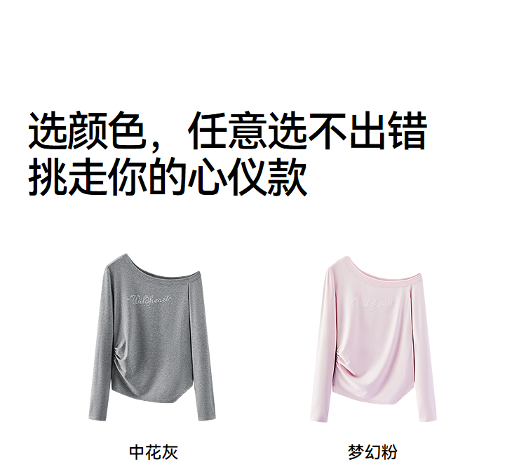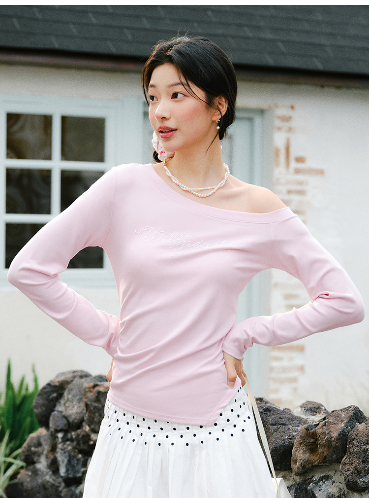 森马长袖T恤女春短款斜肩露肩字母紧身2026新款小性感设计感上衣