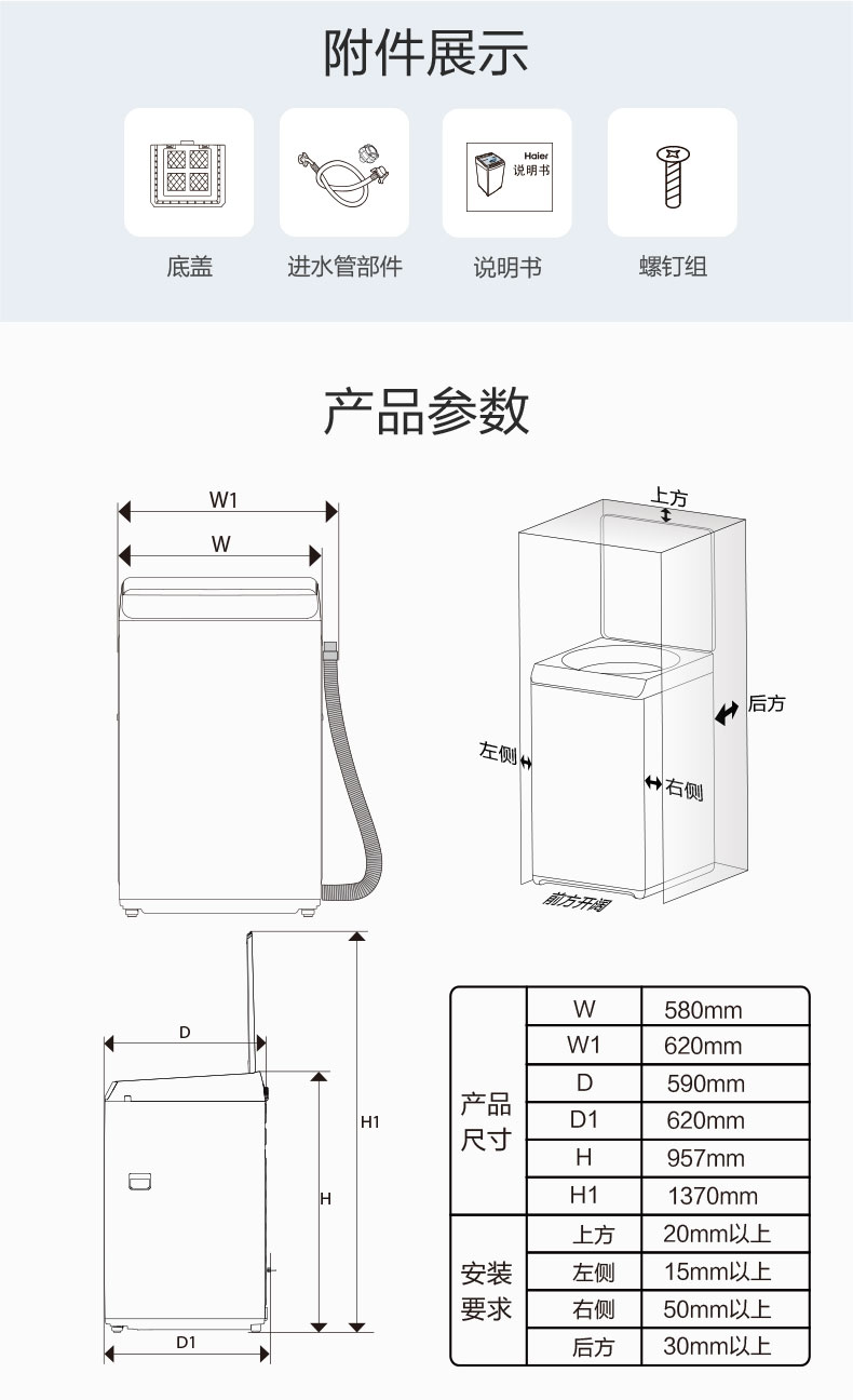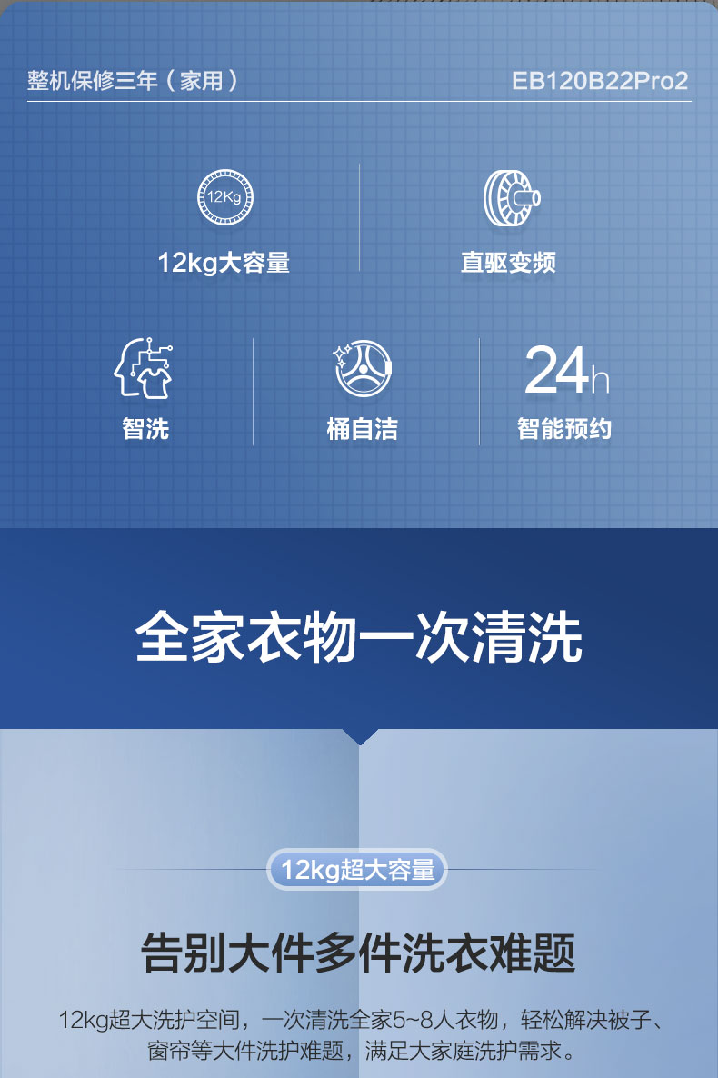 海尔12公斤大容量 波轮洗衣机全自动 直驱变频 健康桶自洁EB120B22Pro2